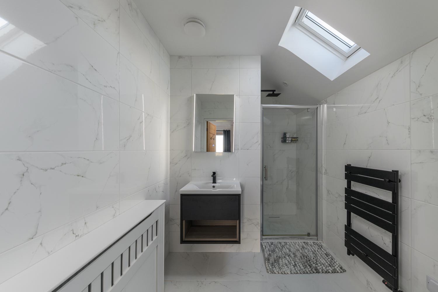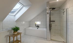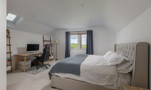 The galleried landing above brings a lovely sense of openness to the first floor. The principal bedroom enjoys far reaching rural views and includes a sleek en suite shower room. Two further double bedrooms are arranged along the landing, each with excellent floor space and natural light. A large separate dressing room sits beside the third bedroom and offers extensive storage potential. The family bathroom is finished in a modern marble effect tile and includes both a bath and a walk in shower.