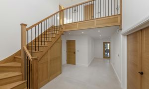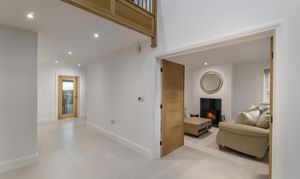 A broad entrance porch leads into a striking double height hall where oak joinery, porcelain tiled flooring and a galleried landing establish the refined yet understated style found throughout. From here, the ground floor rooms branch naturally in several directions.