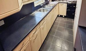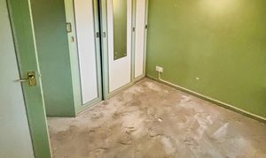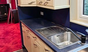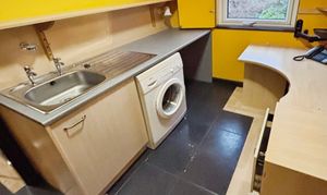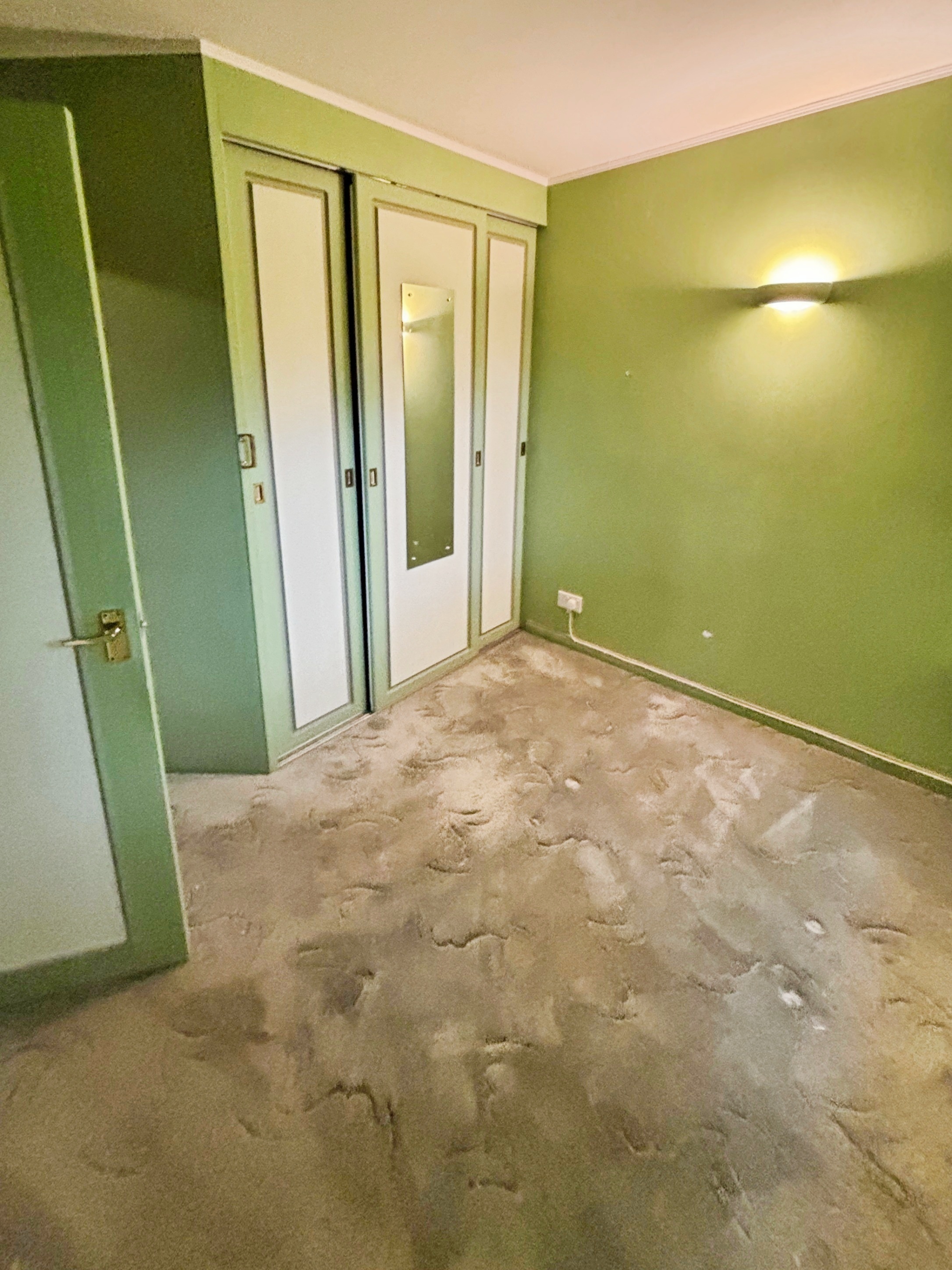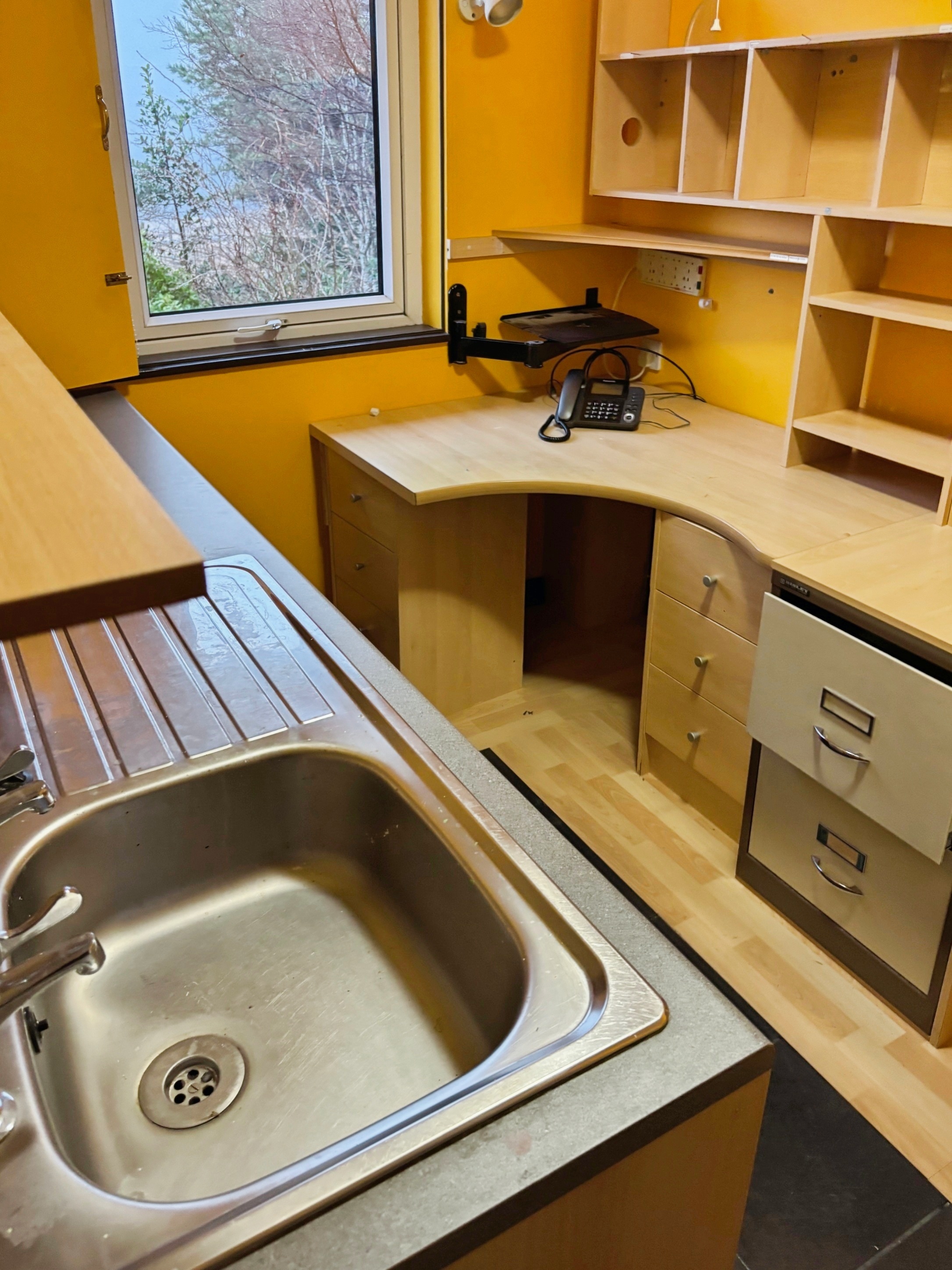 Bedroom currently configured as Home Office / Utility Room. Fitted desk and shelving. Stainless steel sink and washing machine.