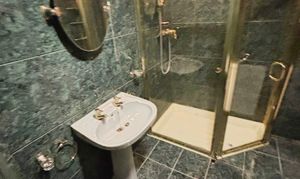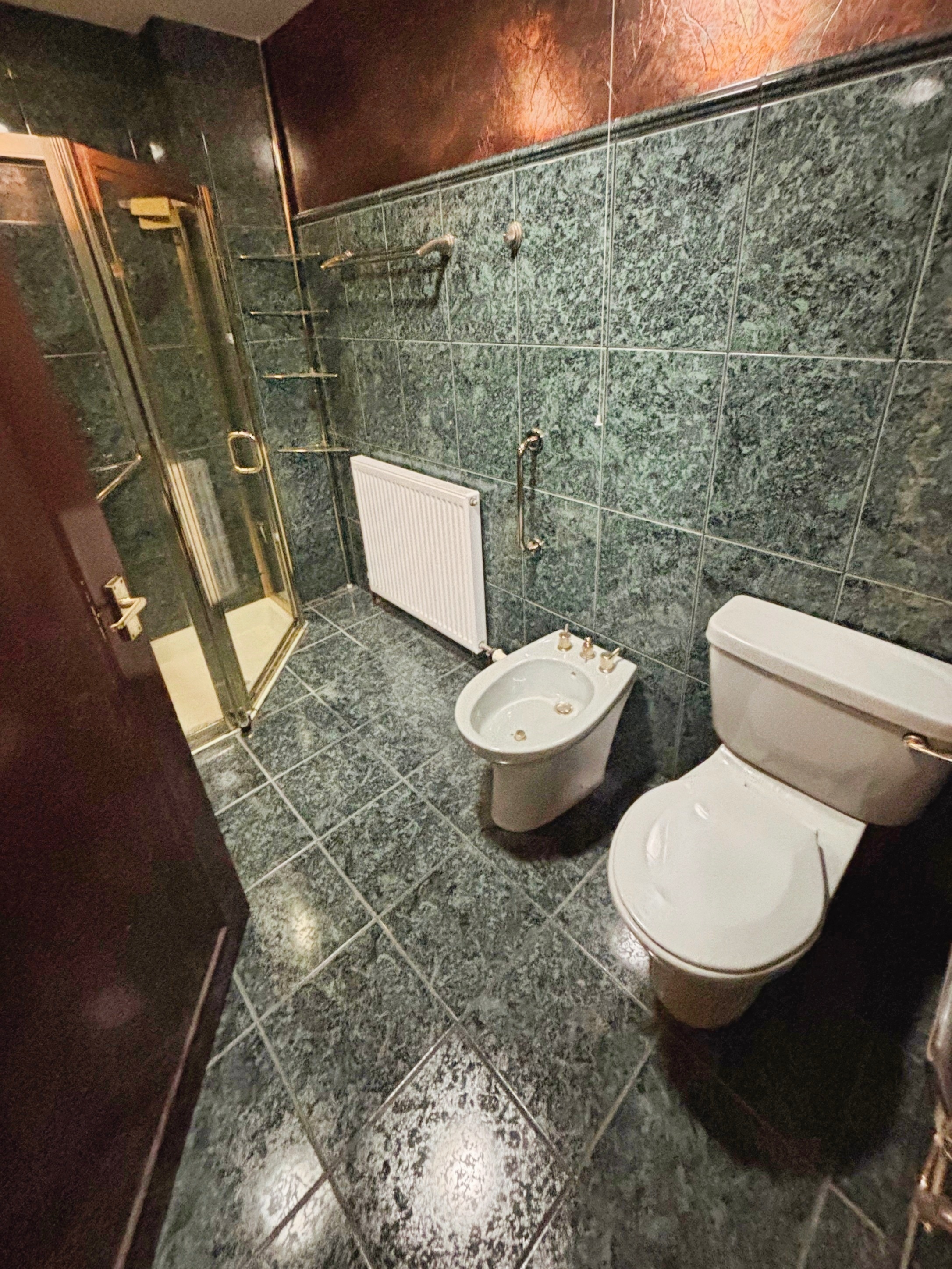 Large bathroom with tiled walls and floor. Shower cabinet, WC, bidet & hand basin.