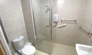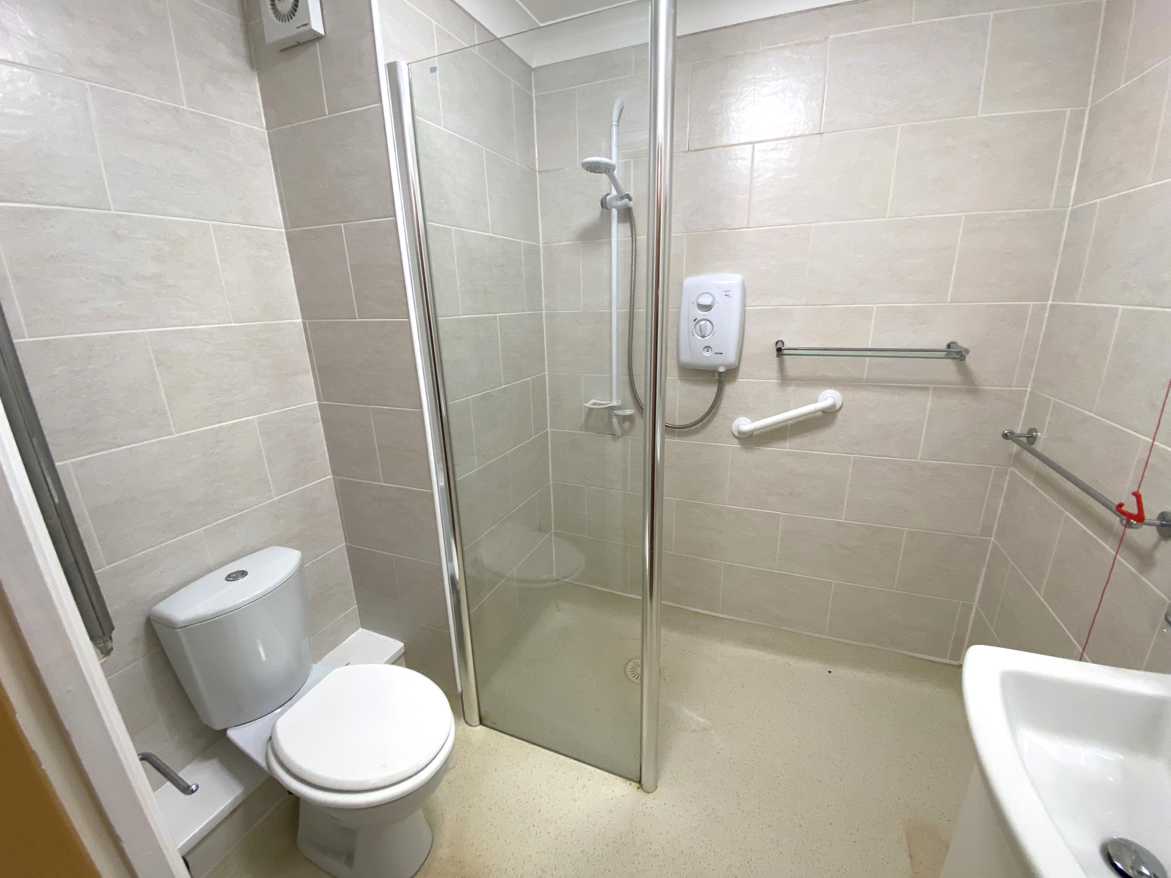 The wet room comprises an electric shower with screen, low level flush WC and wash hand basin with cupboards below. There is a wall mounted mirror with strip light and shaver point, tiled walls, extractor and electric wall heater.