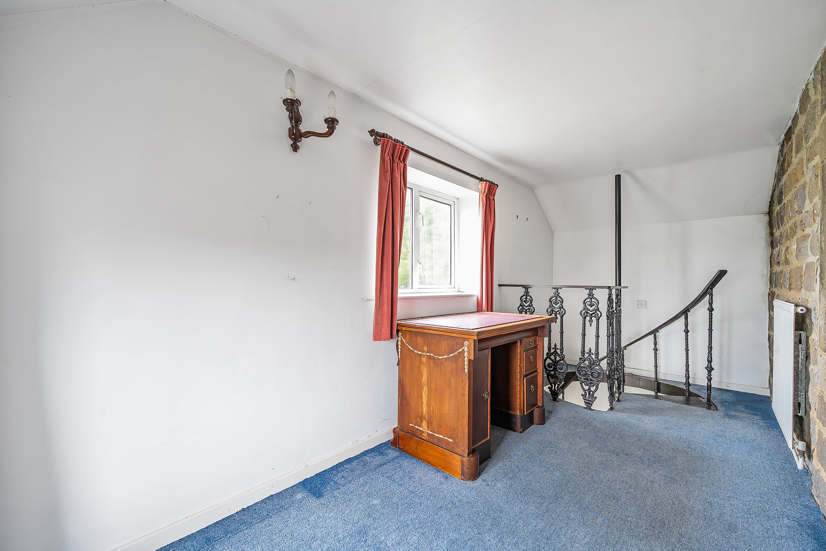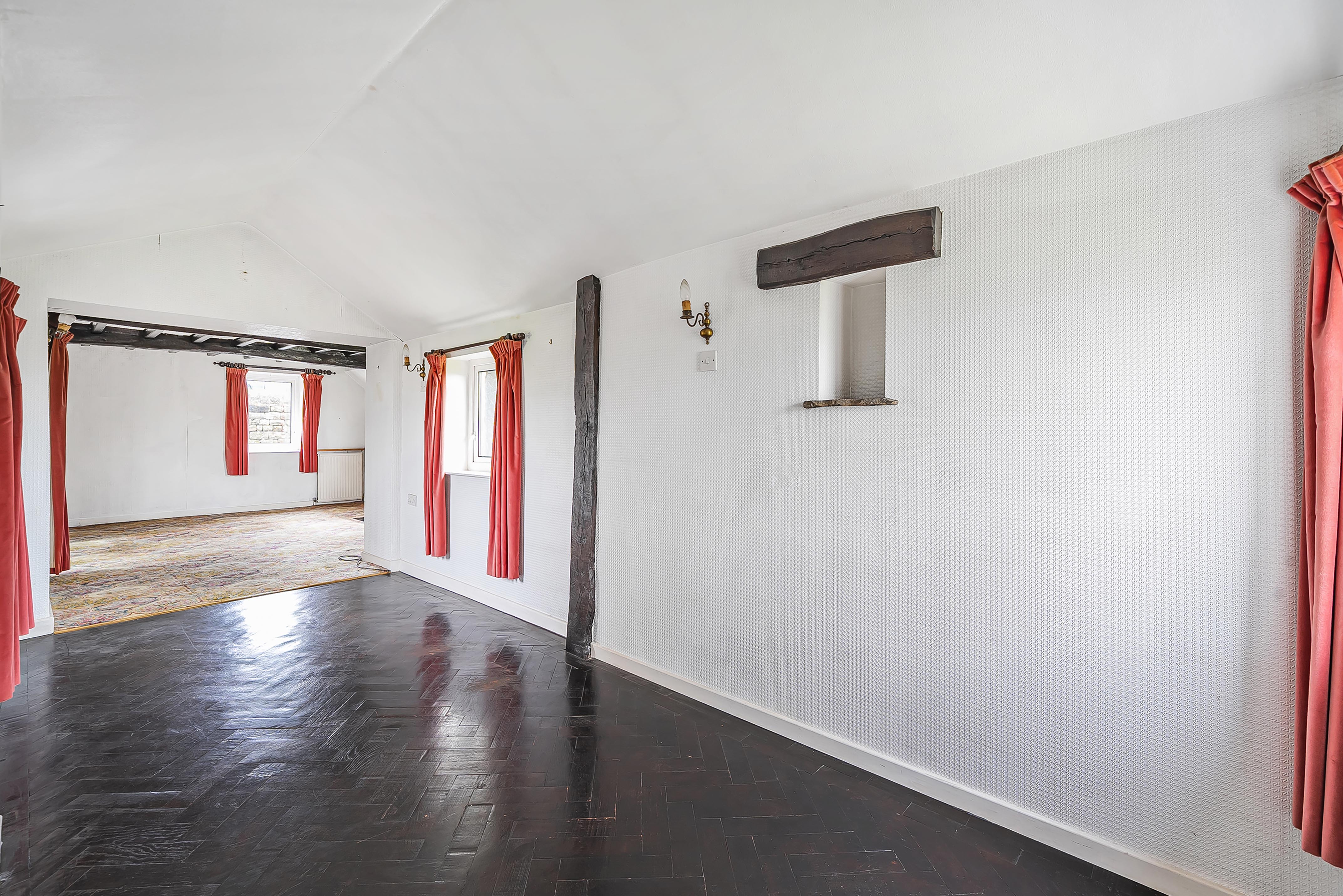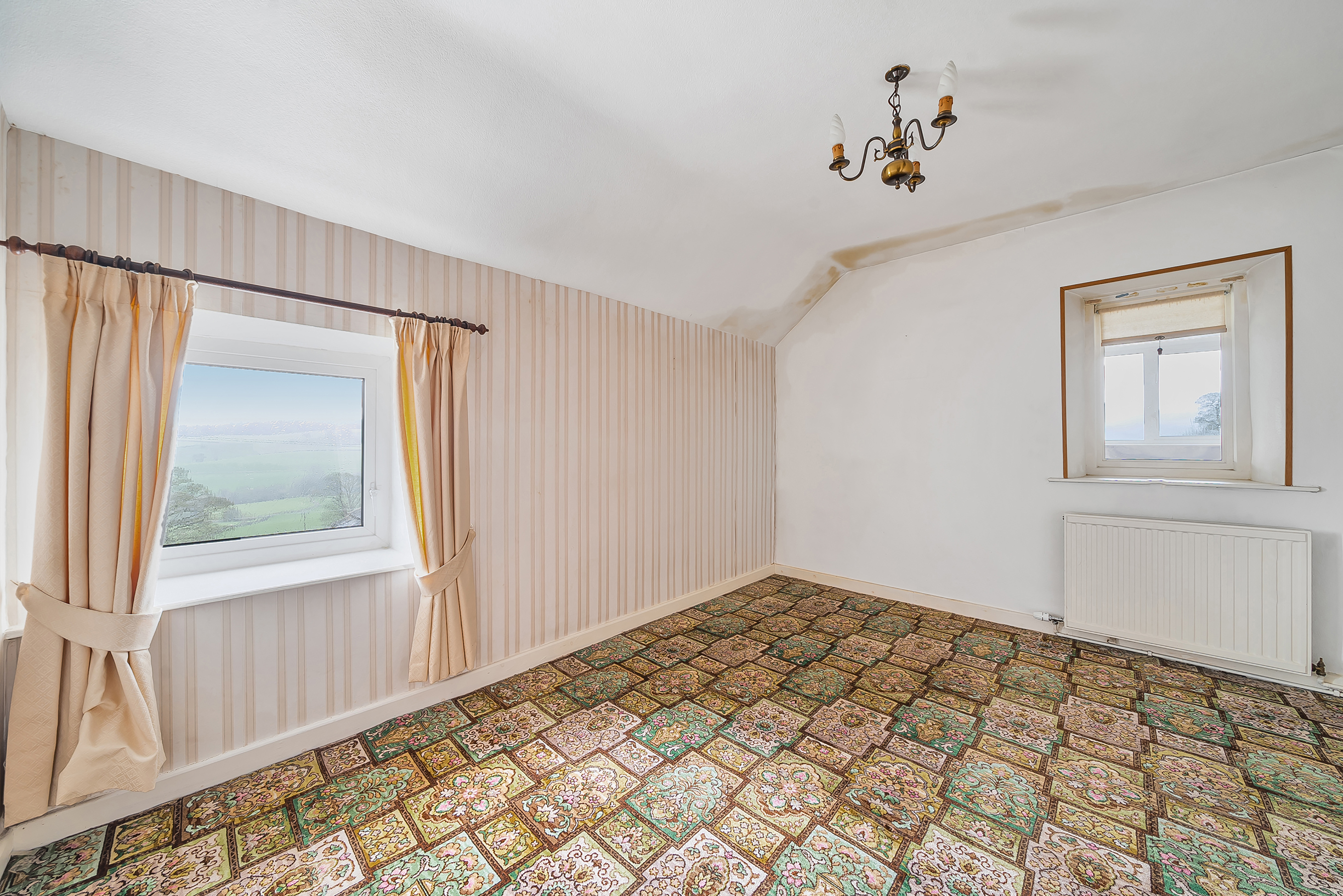 The property was a former Barn for the nearby Farm converted in the 1960’s and split into two properties. The front door opens into a large reception room spanning the entire width of the house. Branching off to the right there is a fitted kitchen complete with a range of units. A rear entrance hall provides access into a useful storage cupboard, downstairs w/c and a staircase leading to the two double bedrooms both enjoying fantastic elevated views and the house bathroom on the first floor. To the left of the reception room is a sun room with a feature spiral staircase leading up to a room ideal as a home office/study. Externally there is an adjoining storage room perfect for garden furniture and equipment. The private gardens are primarily laid to lawn with stocked, colourful borders and various areas to sit and enjoy the sun throughout the day. The adjoining paddock provides an additional area for green fingered enthusiasts!
