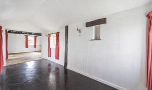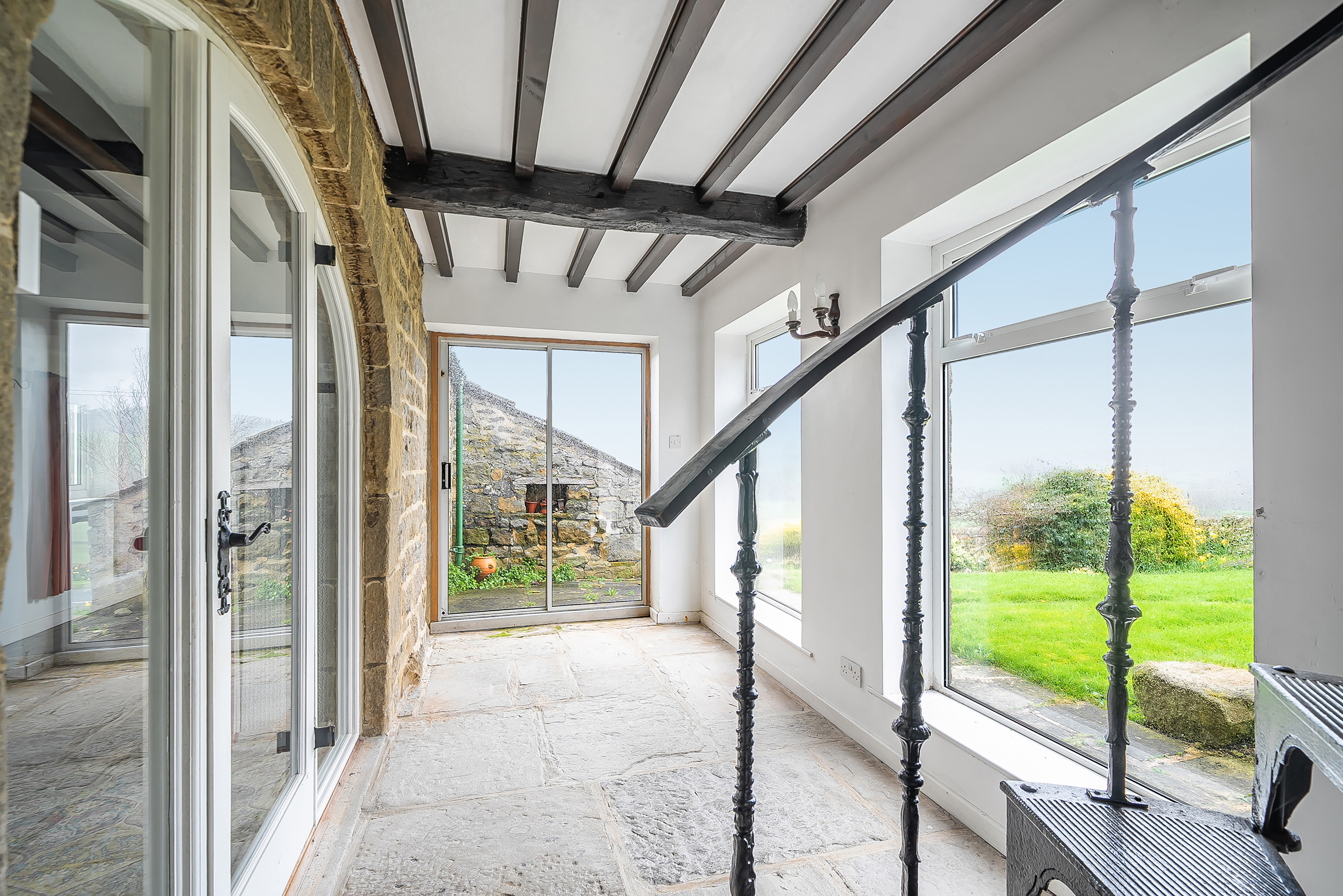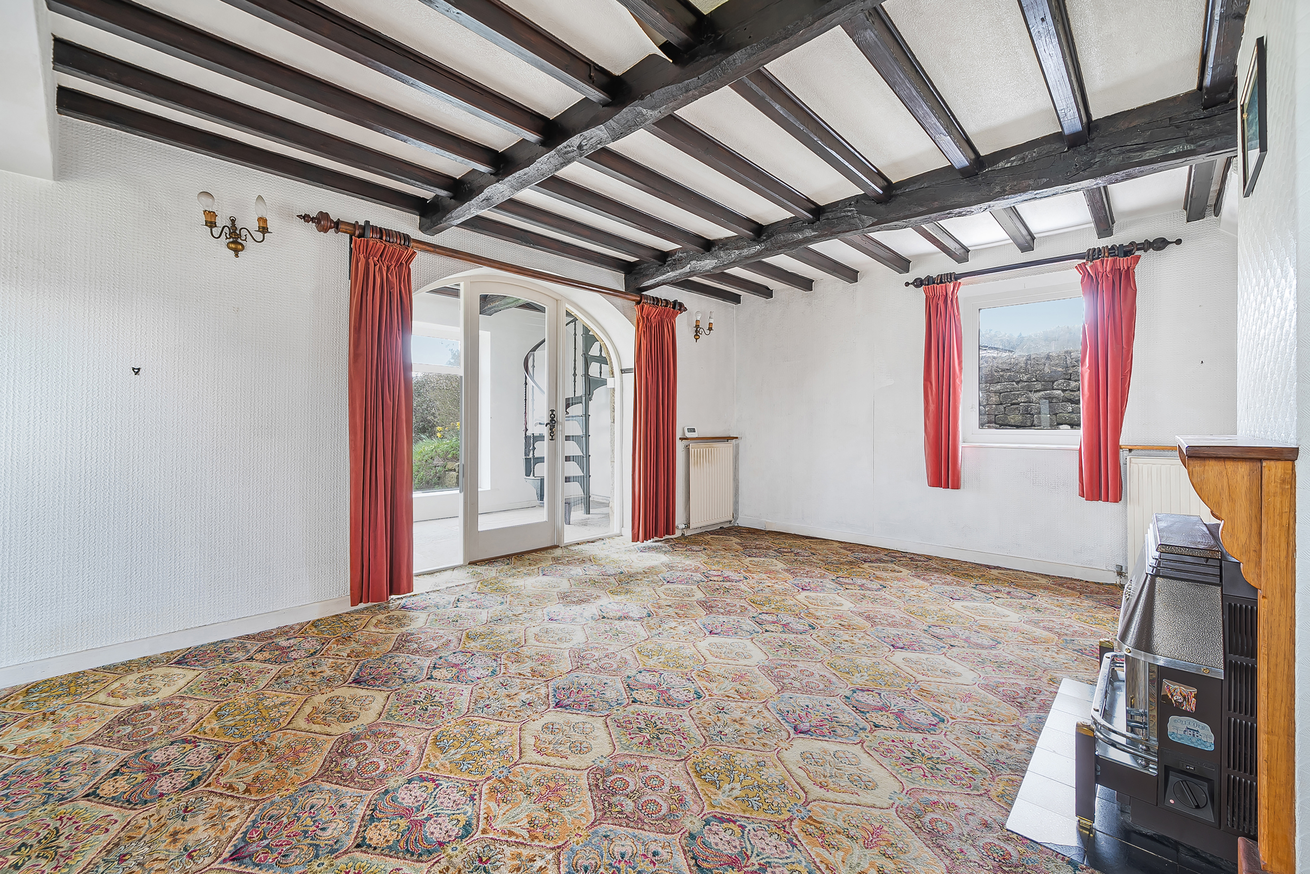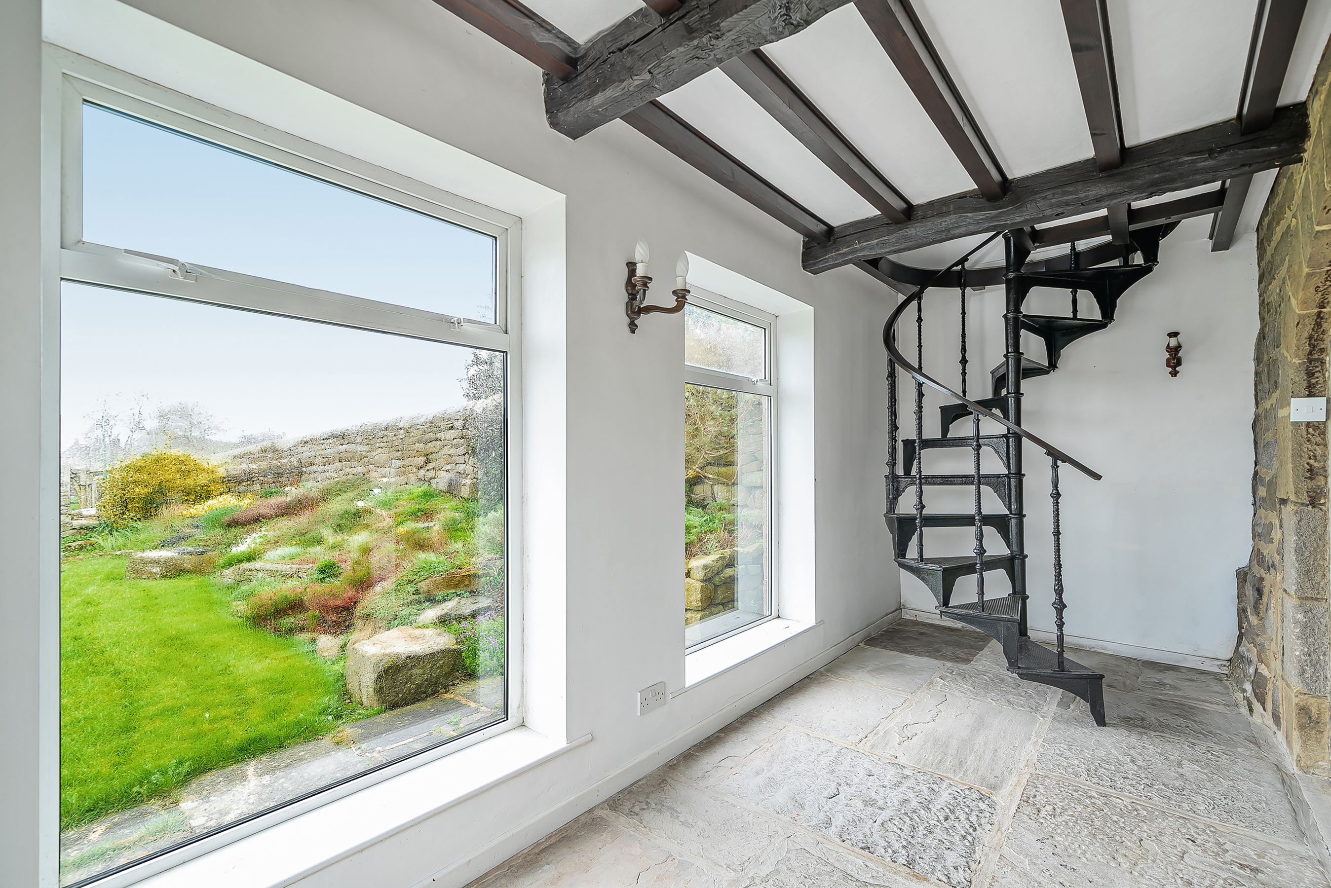 The property was a former Barn for the nearby Farm converted in the 1960’s and split into two properties. The front door opens into a large reception room spanning the entire width of the house. Branching off to the right there is a fitted kitchen complete with a range of units. A rear entrance hall provides access into a useful storage cupboard, downstairs w/c and a staircase leading to the two double bedrooms both enjoying fantastic elevated views and the house bathroom on the first floor. To the left of the reception room is a sun room with a feature spiral staircase leading up to a room ideal as a home office/study. Externally there is an adjoining storage room perfect for garden furniture and equipment. The private gardens are primarily laid to lawn with stocked, colourful borders and various areas to sit and enjoy the sun throughout the day. The adjoining paddock provides an additional area for green fingered enthusiasts!