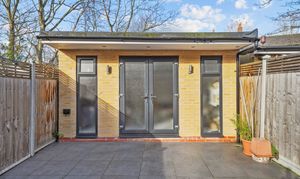 The garden extends beyond, leading to a substantial outbuilding, ideal as a studio, gym, or home office, along with additional storage.