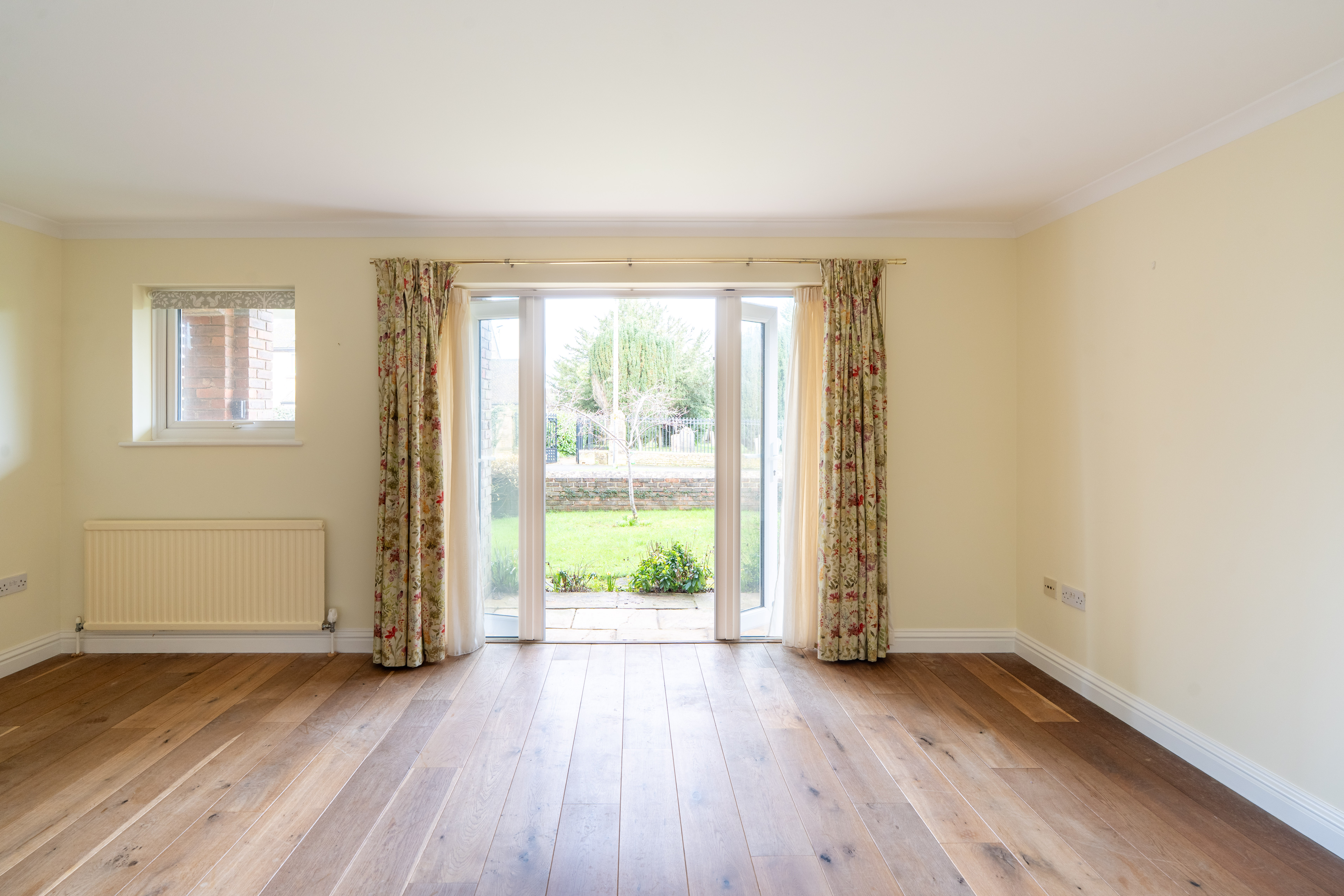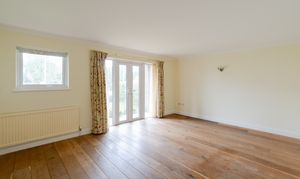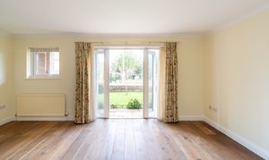 - Spacious reception room with glazed French doors opening onto a covered patio and communal gardens
