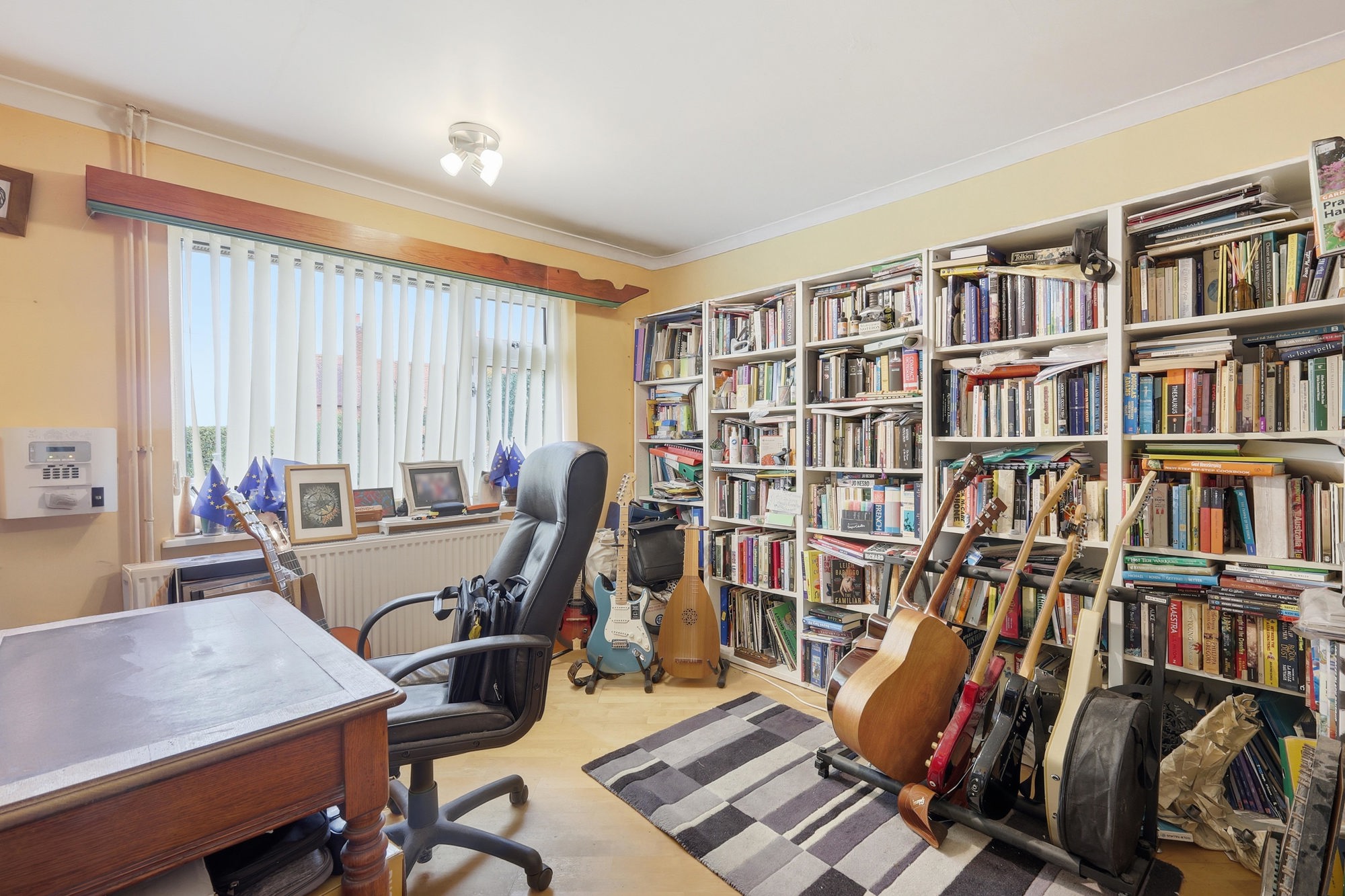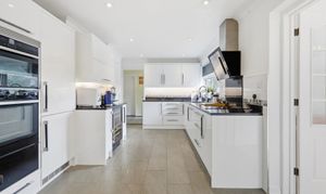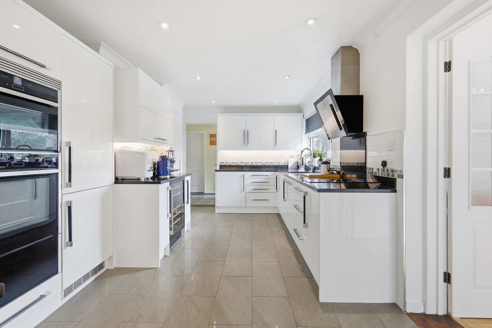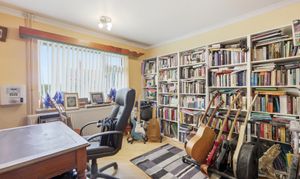 A welcoming entrance hall leads into a spacious dining area and a stunning kitchen complete with granite worktops, a Quooker boiling water tap, a Neff slide and hide oven with warming/proving drawer, and an integrated wine fridge. Additionally, there is a utility room providing internal access to the garage. The large living room benefits from air conditioning, large windows, and direct access to the rear garden, creating a bright and inviting space to relax. The ground floor also features two double bedrooms, one currently used as a study, and a wet room.