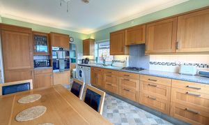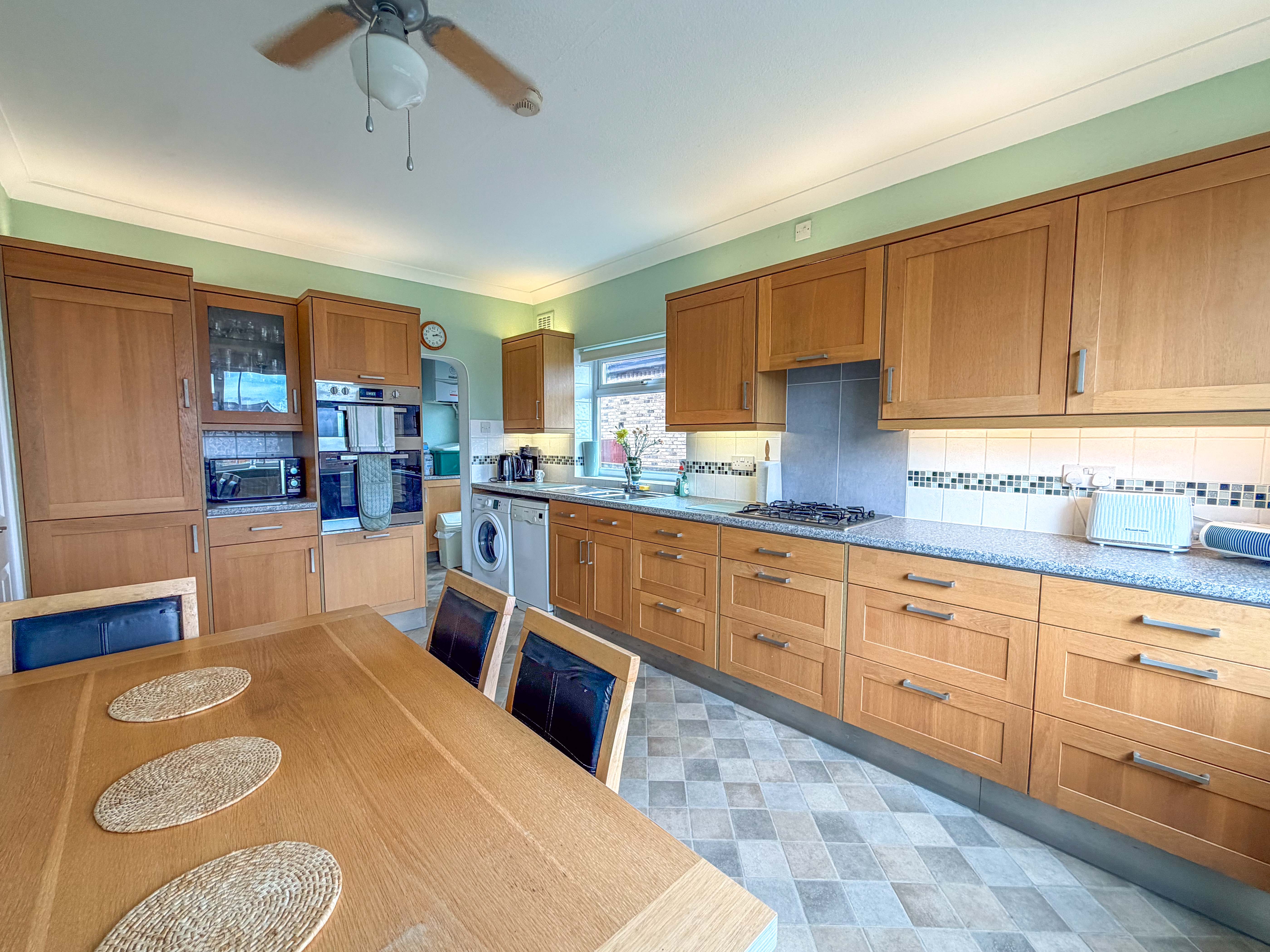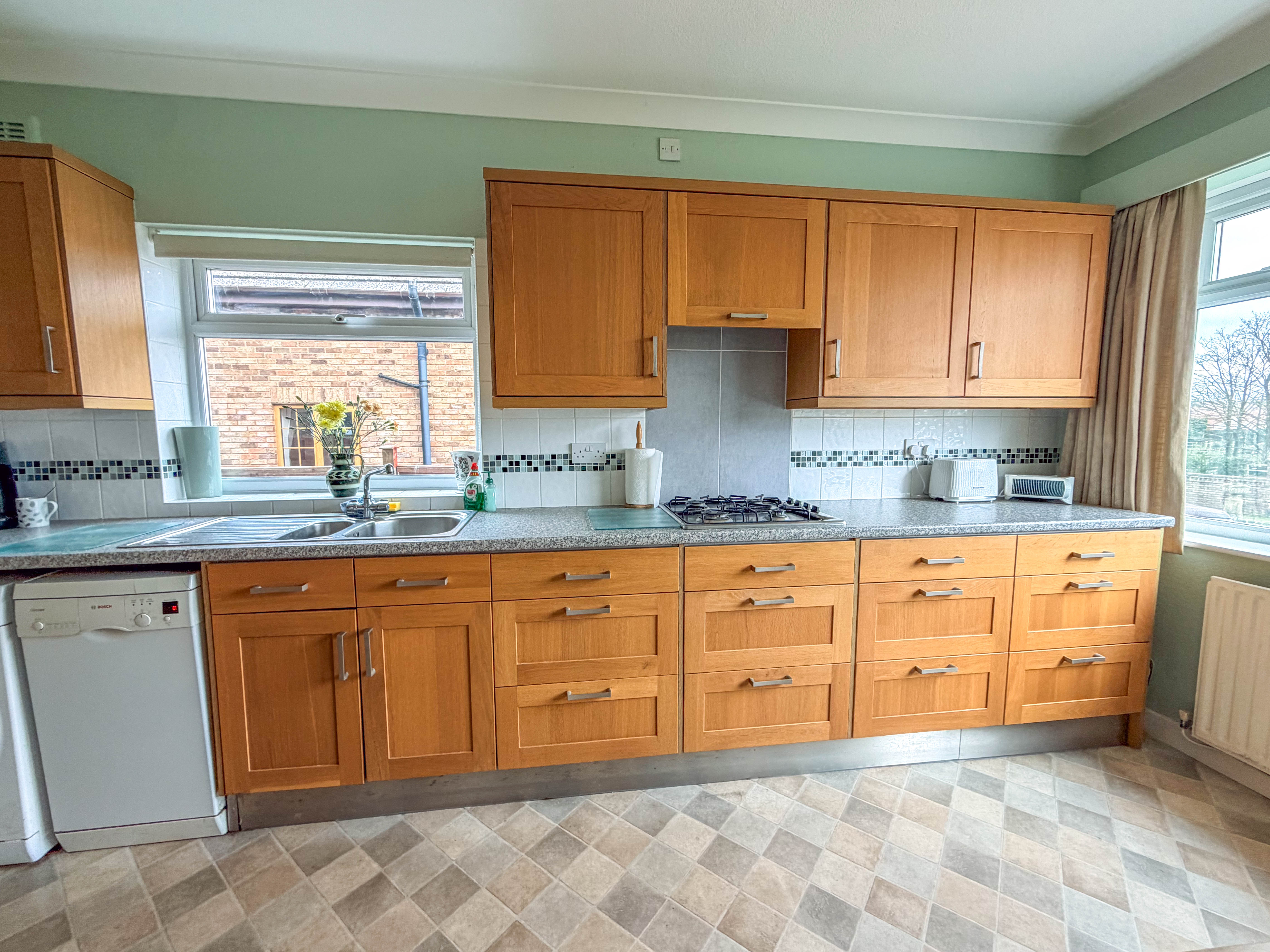 Also positioned to the front is the kitchen/diner, a room that already functions as a practical hub of the home but also offers significant potential for enhancement. Fitted with a range of units and complementary work surfaces, there is ample space for both cooking and dining, with the added benefit of front-facing views. Subject to personal taste, this space could be transformed into a stunning open-plan kitchen tailored to modern living. A useful utility room sits just off the kitchen, providing additional storage and functionality.