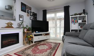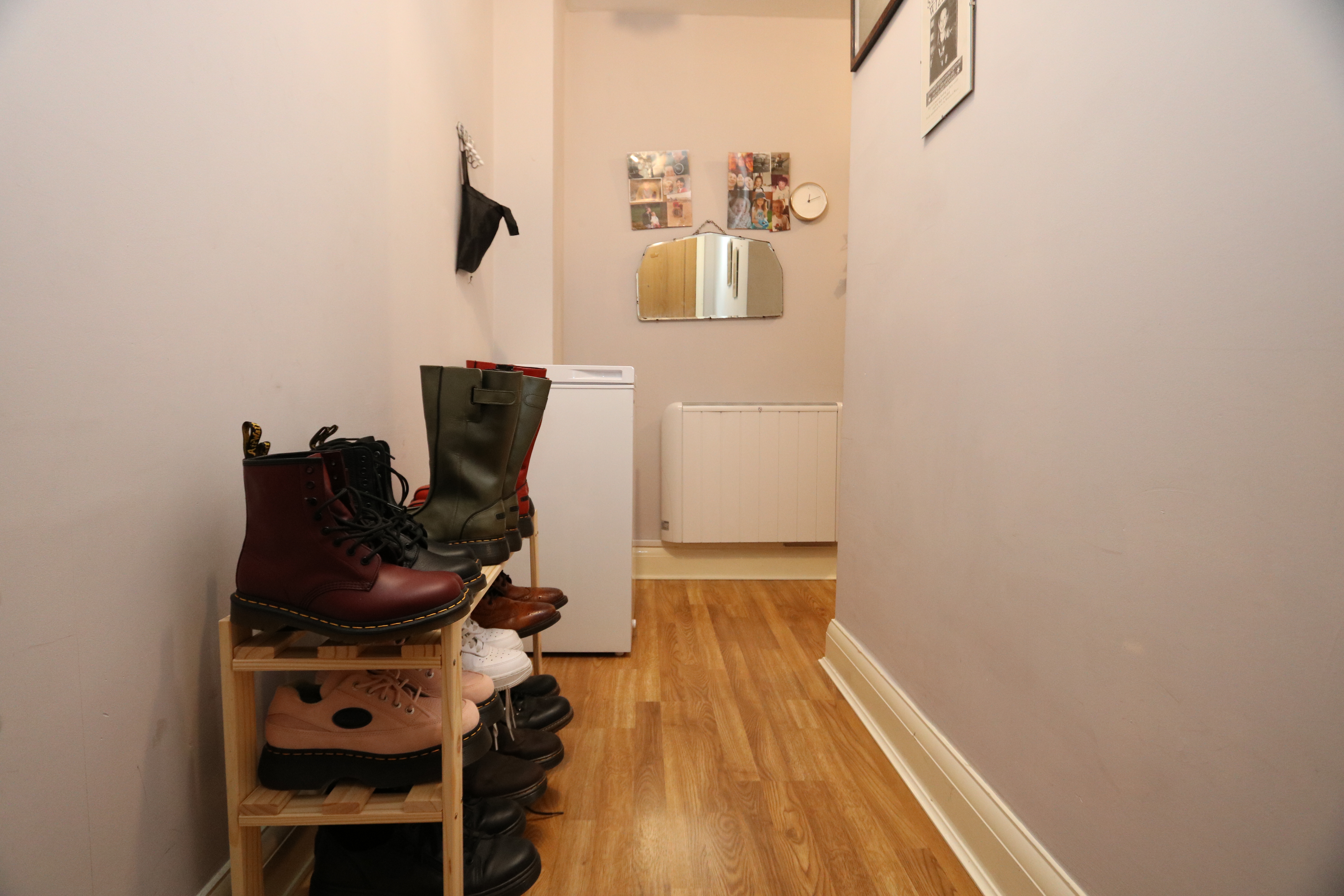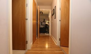 Entrance into the property via a wooden fire door complete with a peep hole into the hallway. The L-shaped hallway has wood effect flooring, smooth walls and a smooth ceiling. A wall mounted electric heater and doors leading off to the kitchen, lounge, bedroom and bathroom.