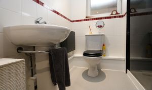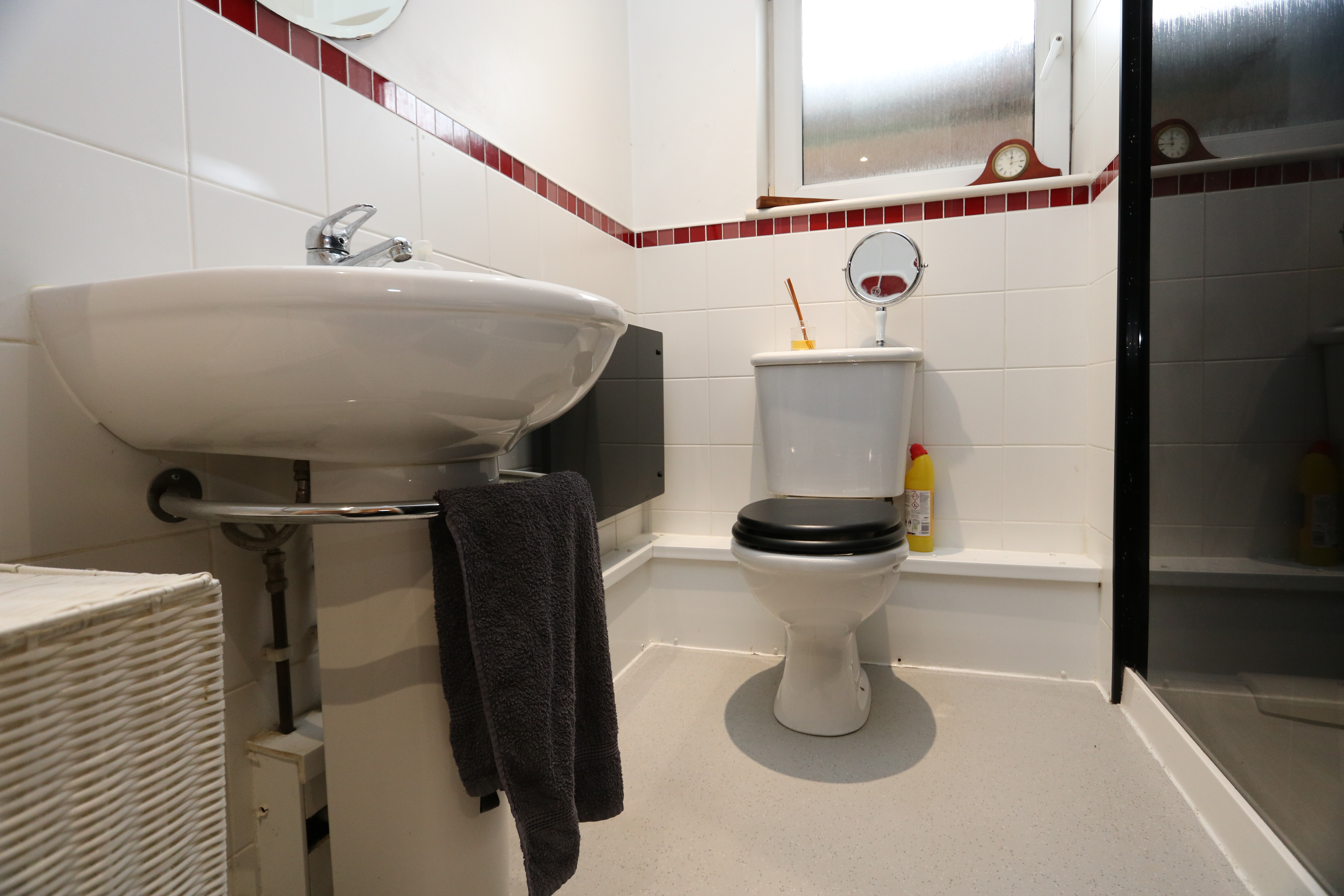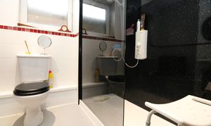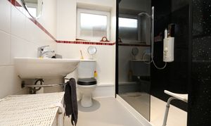 Vinyl flooring, half height wall tiling with the remainder of the walls being smooth and a smooth ceiling with spotlights. A three piece white suite comprising a WC with a push button flush, a pedestal wash basin with a stainless steel pillar tap overtop and a walk-in shower cubicle with an inset electric shower, modern waterproof wall panelling and a glass shower screen. A door giving access to a large storage cupboard housing the water tank and consumer unit.