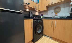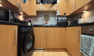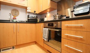 Wood effect flooring, smooth walls and a smooth ceiling with spotlights. A good range of wooden eye and base level units with complementing black worktops. A stainless steel sink inset with a stainless steel mixer tap overtop. Integrated appliances include a single oven, a four ring electric hob and a stainless steel extractor hood. Space and plumbing for a washing machine and space for a full size fridge/freezer. Undercounter lights, an extractor fan and a stainless steel splashback behind the hob.