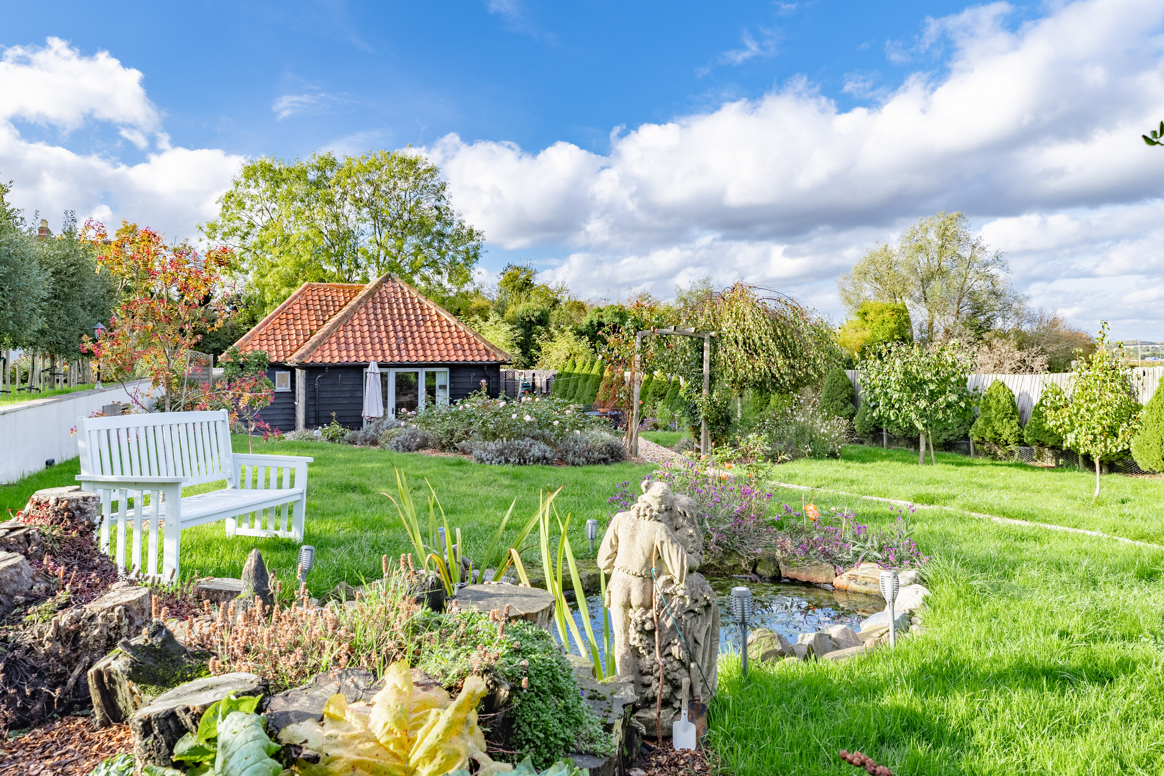 - Extensive grounds, including a large patio, landscaped gardens, and a shepherd’s hut