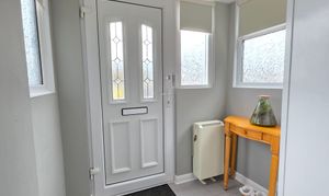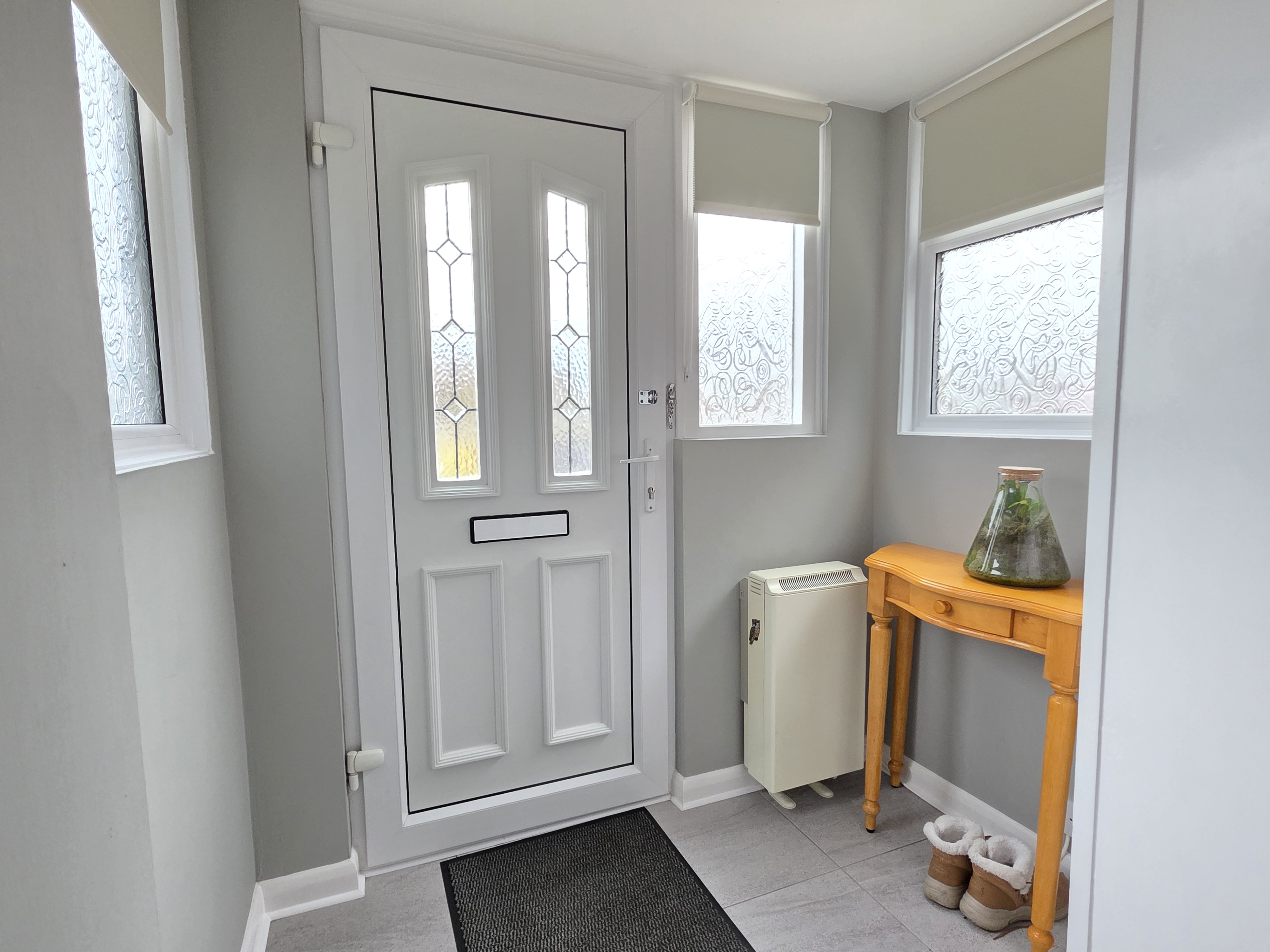 The initial porch area includes tiled flooring, electric storage heating plus storage & meter cupboard.
