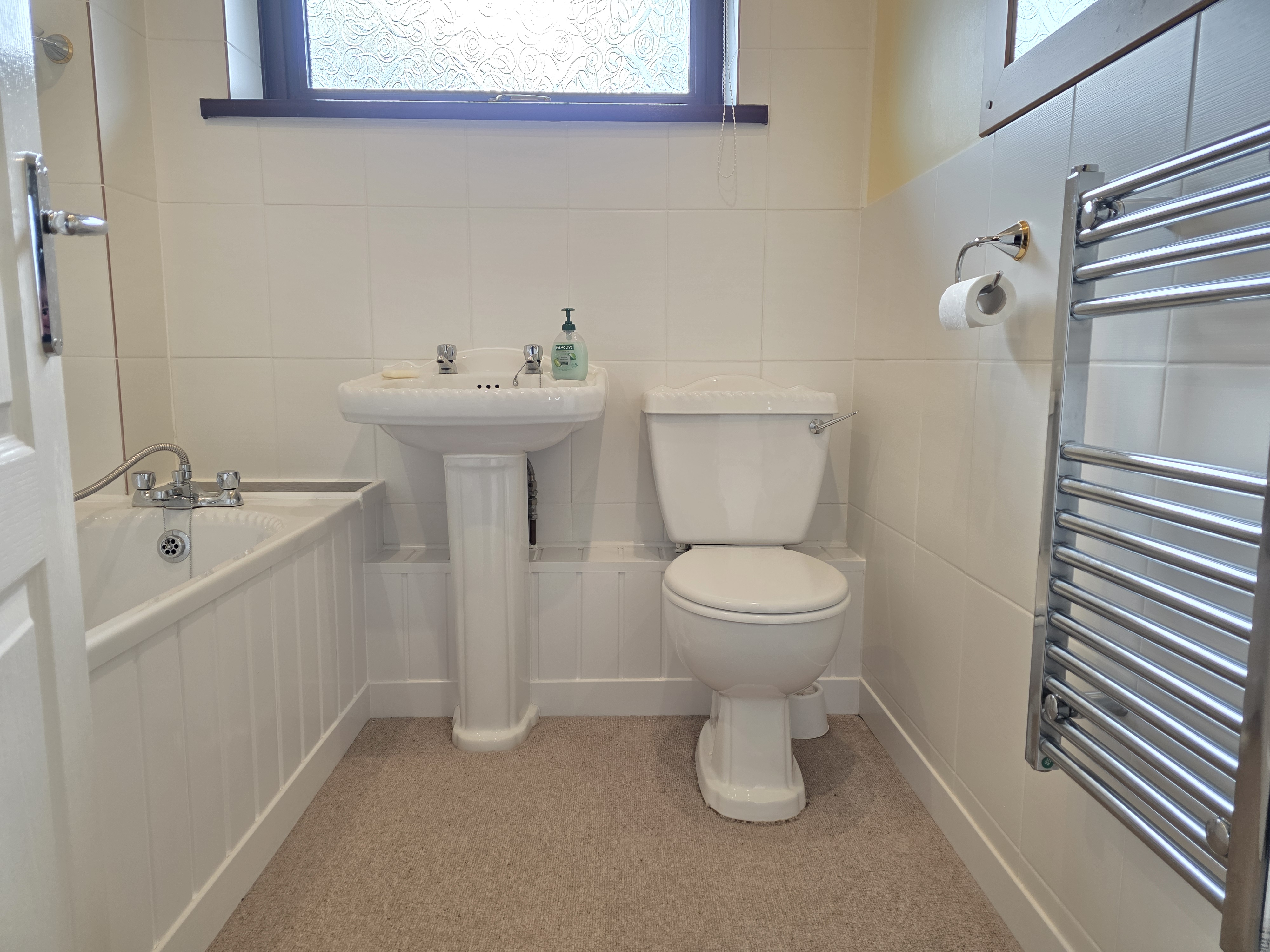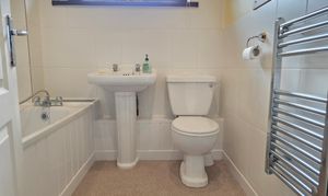 Includes a low level flush WC, wash hand basin, panel bath, part tiled walls, chrome heated towel rail and obscure UPVC double glazed window.