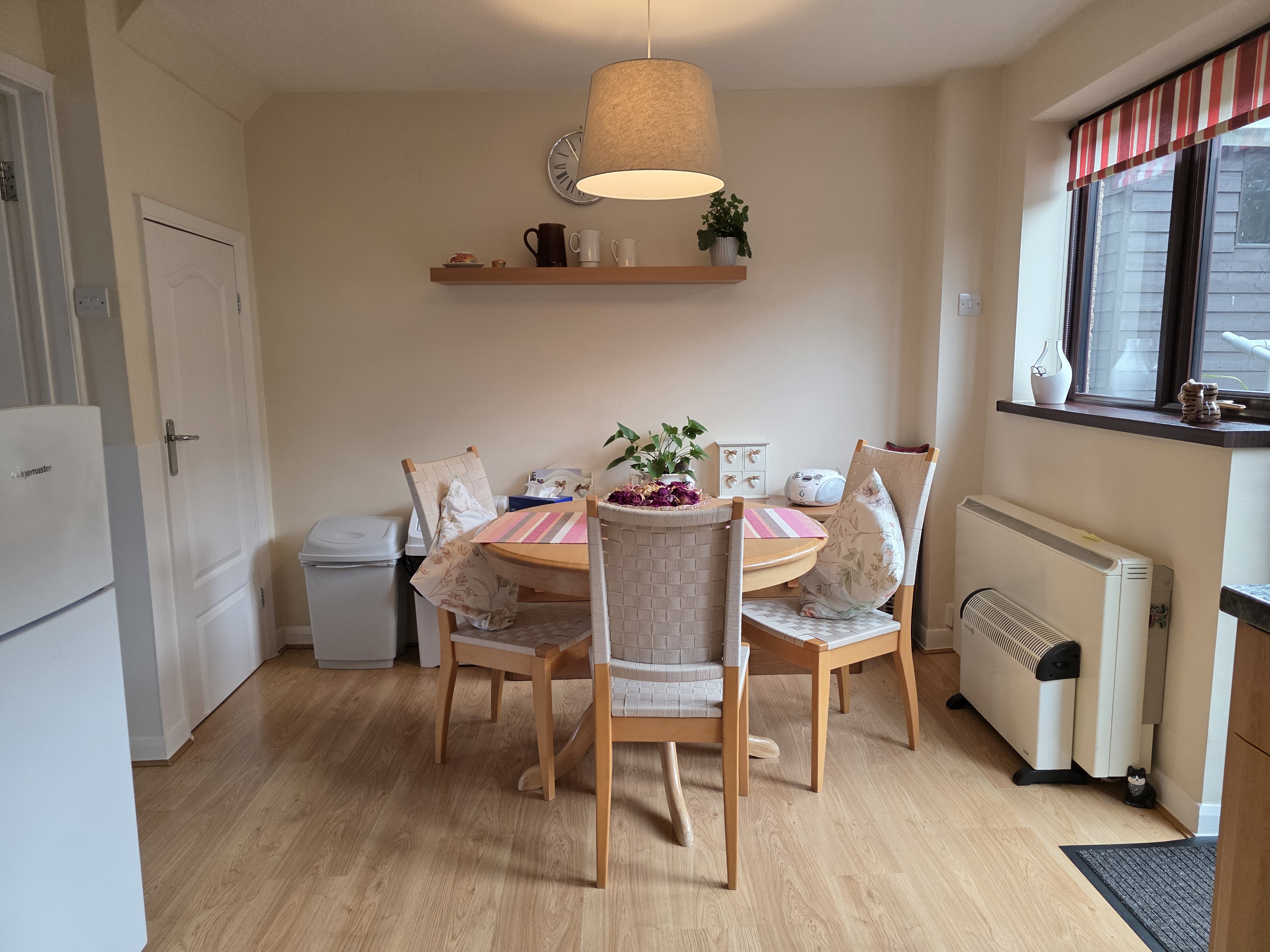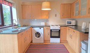 The kitchen benefits from a number of wall and base units with rollover worktop, space and plumbing for a washing machine, space for an electric cooker, one and a half sink and drainer with mixer tap, tiled splashbacks and space for a fridge/freezer. The room includes laminate flooring, space for a round 4 seater dining set, under-stair storage, two UPVC double glazed windows and door leading out to the rear garden.