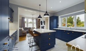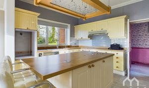 Spacious kitchen area leading to living space, currently features fitted units, central island, integrated appliances, and space for plumbed appliances and wash basin. Window to side. Door to inner hallway.