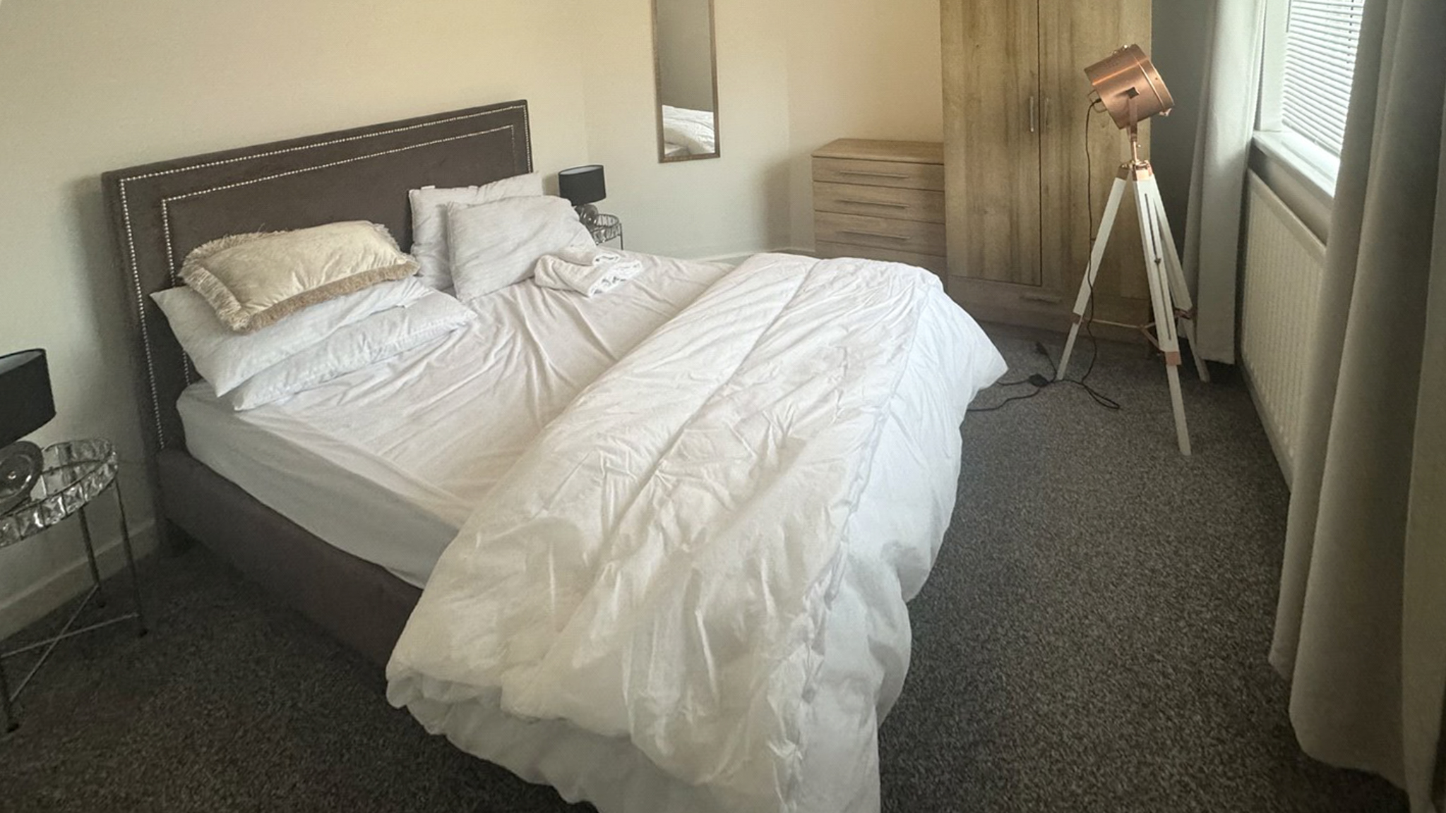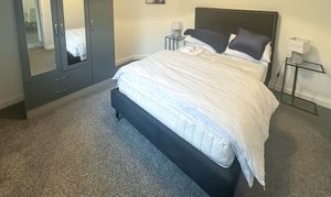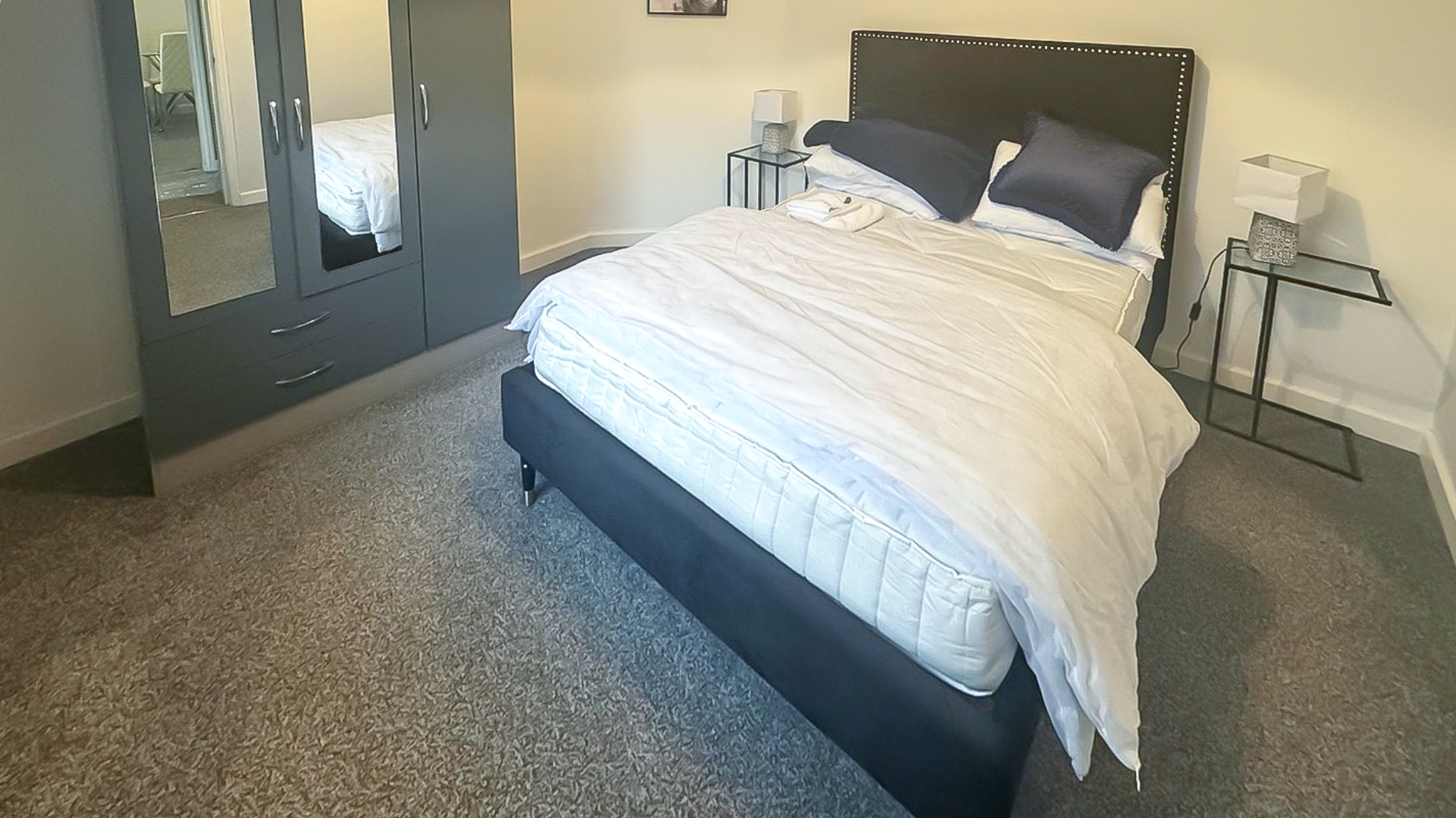 There are two inviting bedrooms, each offering plush comfort and practical storage solutions. The principal bedroom benefits from ample natural light, a contemporary wardrobe, and soft carpeting. The second bedroom is equally well-presented, featuring modern furnishings and a built-in mirrored wardrobe that enhances the sense of space.