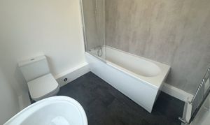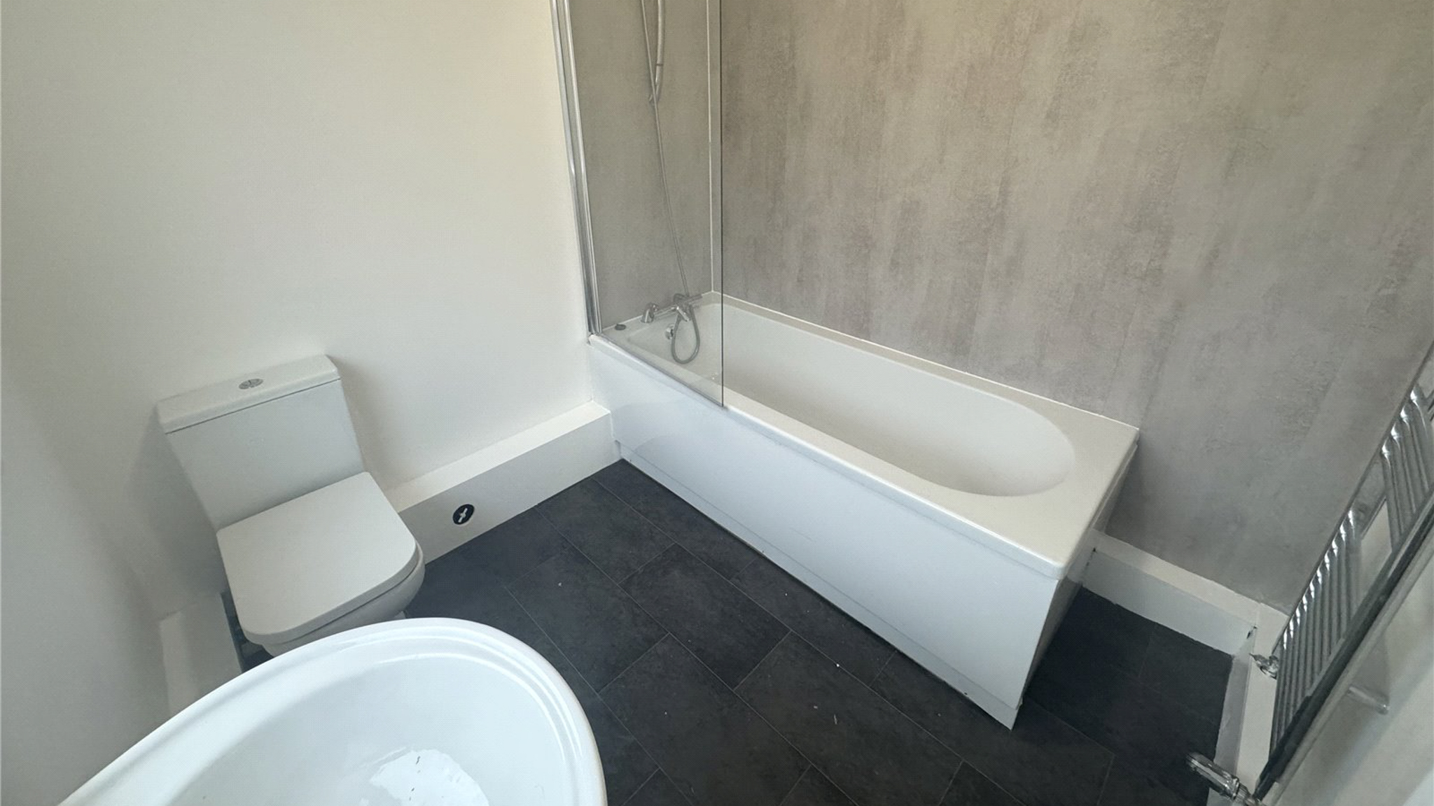 The modern bathroom is finished to a high standard, incorporating a bath with overhead shower, attractive tiled flooring, and a heated towel rail for added comfort.