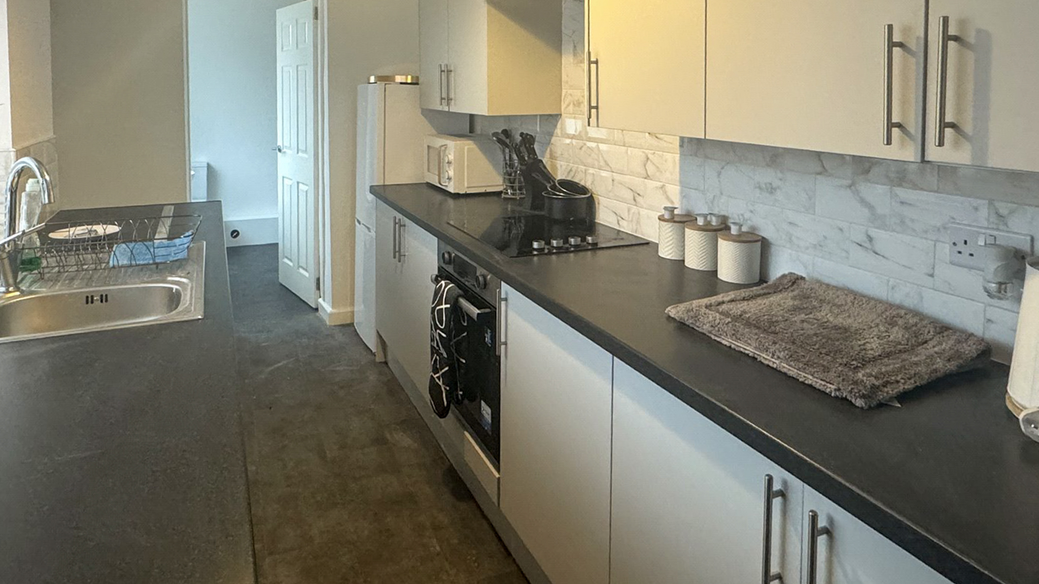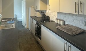 The thoughtfully designed kitchen offers sleek, modern units, integrated appliances, and generous worktop space. A stylish backsplash adds a touch of sophistication, ensuring the space is as functional as it is visually appealing.