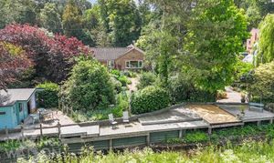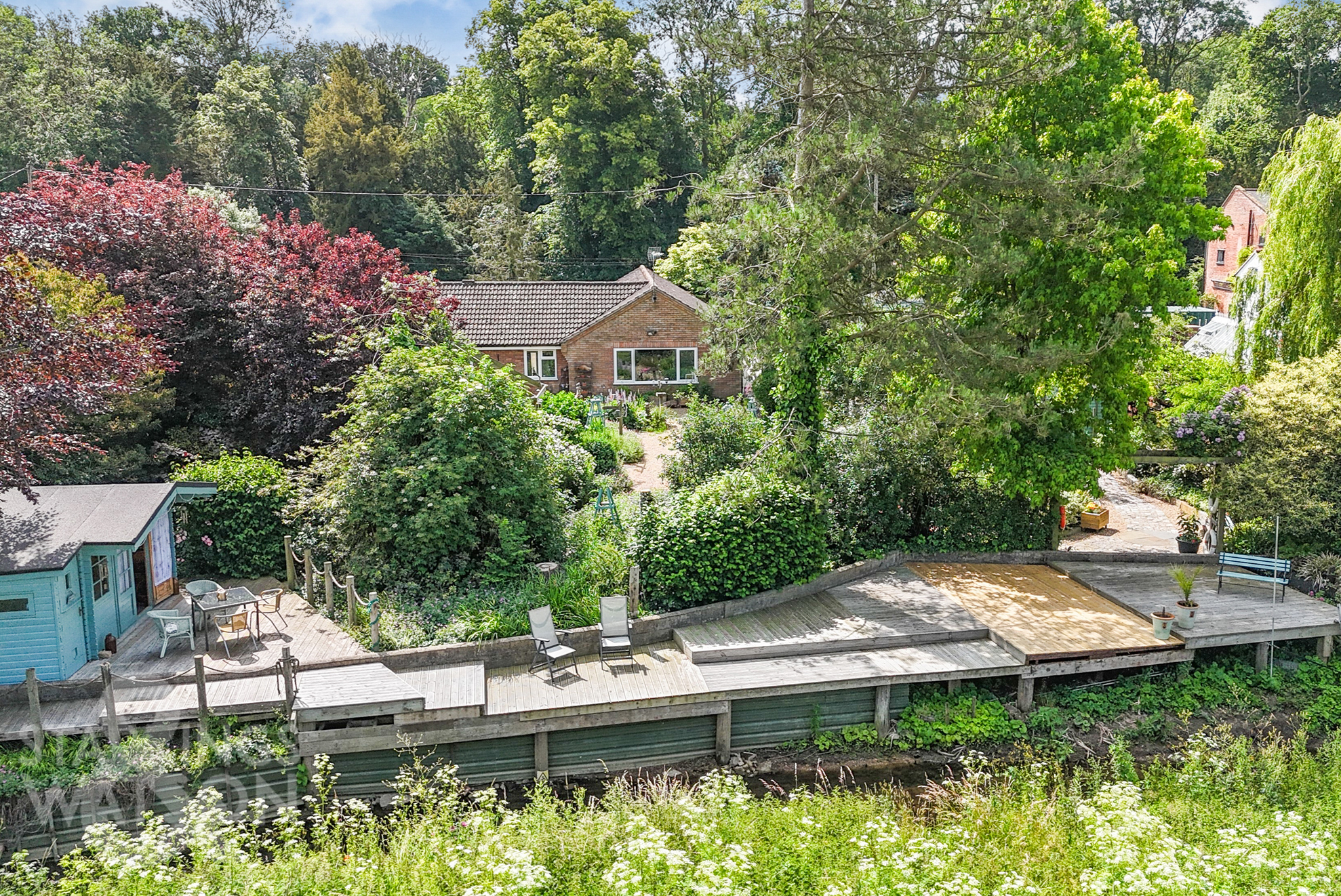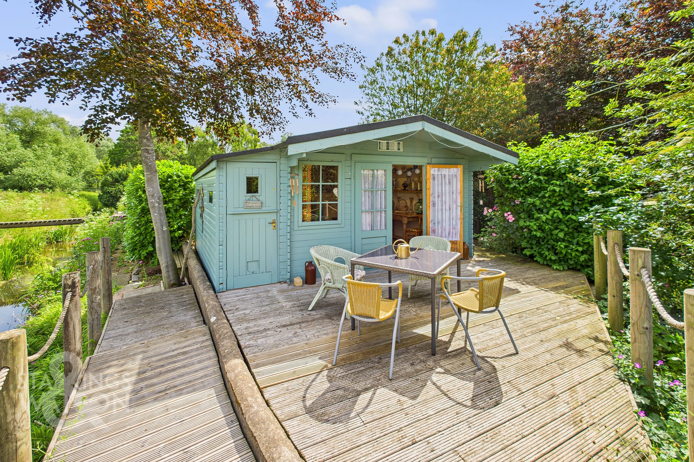 THE GREAT OUTDOORS Leading from either the side gate from the frontage or the door from the kitchen you will find the excellent garden area offering a good degree of privacy. The heavily stocked and mature, fully landscaped gardens have been beautifully designed with the addition of workshop, storage shed and summer house. There is a large paved terrace at the side of the house with an attractive covered area leading onto a shingled area as well as another newly created paved semi-circular terrace providing multiple options for outside dining. The rear section of garden is found via a covered pergola and is superbly landscaped with meandering paths and a wide array of planting and well stocked beds. The garden really must be explored as there are too many features to mention. The garden at the bottom runs down to the rivers edge with a large decked terrace benefitting from wonderful private views as well as another summer house.