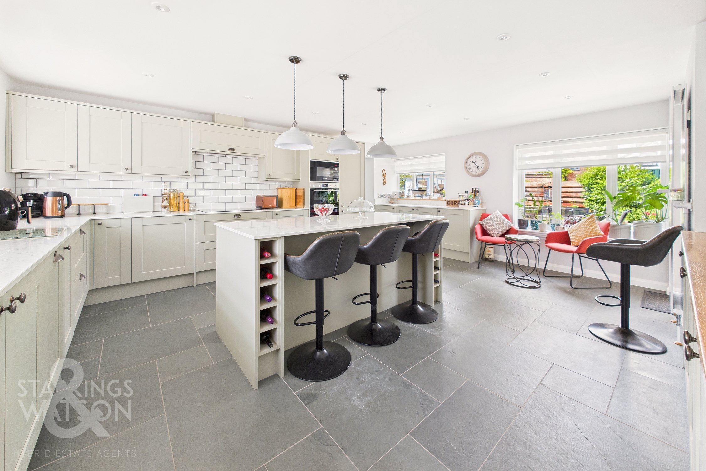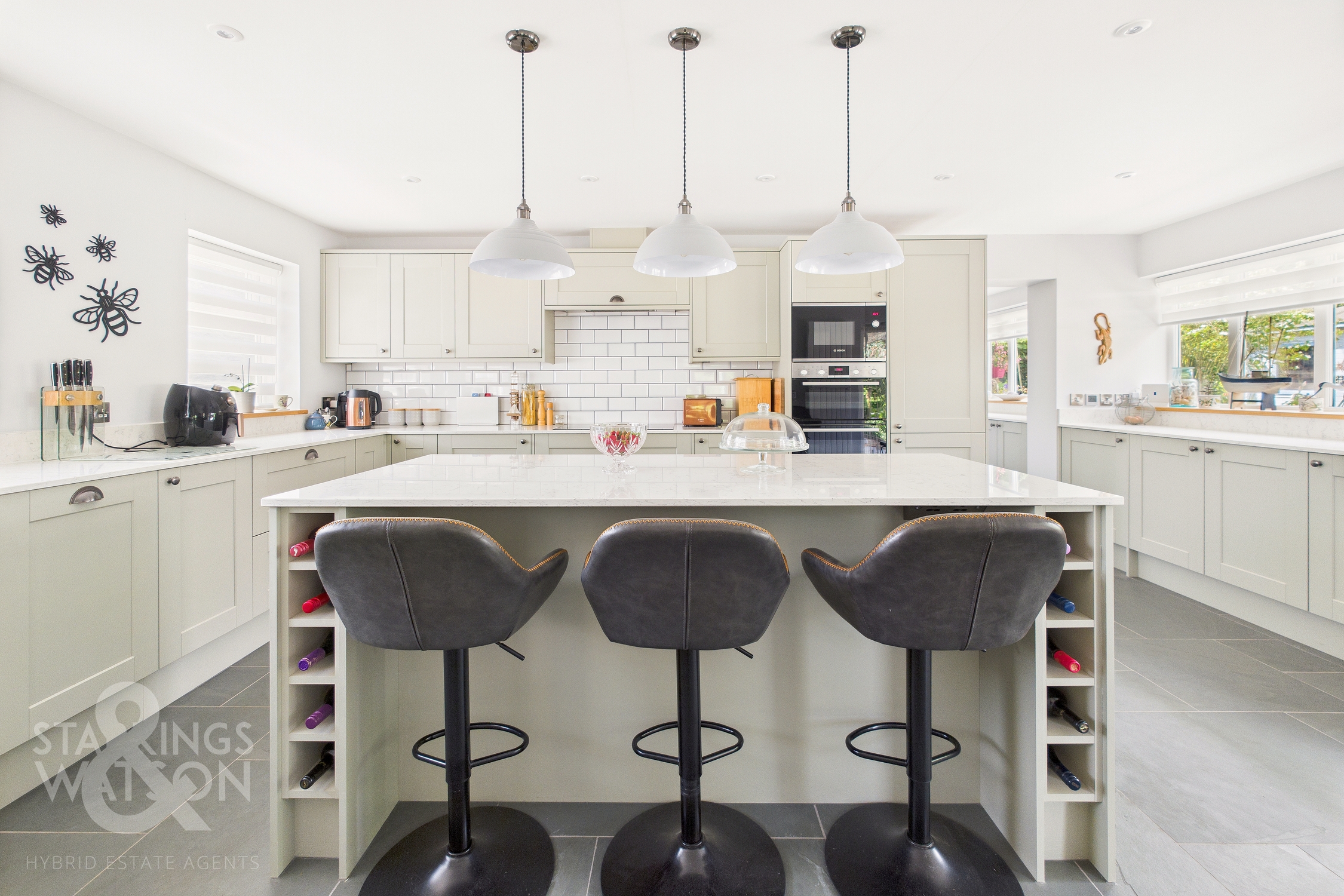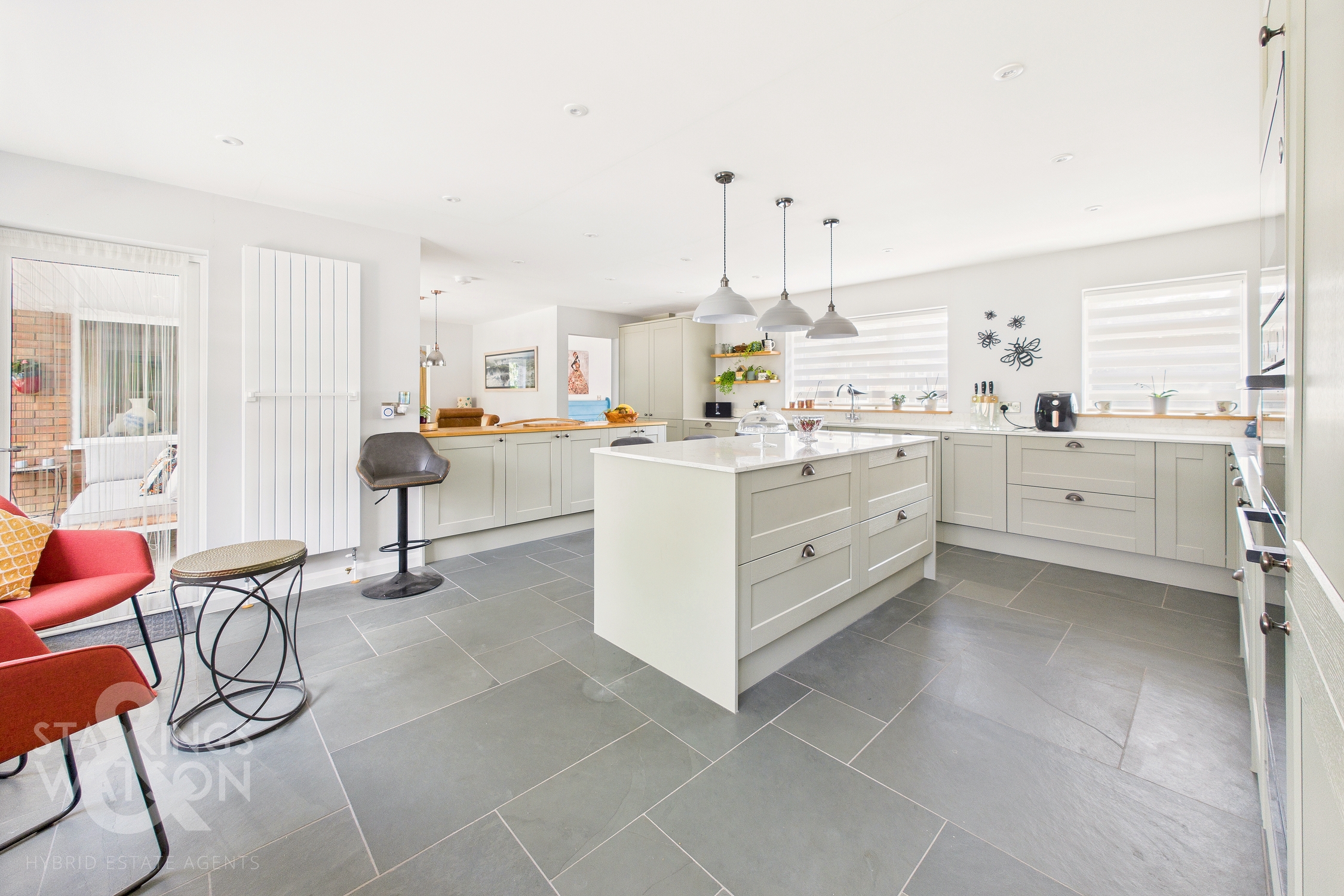 Entering via the main entrance door to the front there is a welcoming entrance hallway with access to the majority of rooms beyond. The hallway offers a tiled flooring throughout as well as various built in storage cupboards and loft hatch access. To the right of the hallway is the bedroom and bathroom wing creating a clear division between sleeping and entertaining spaces. To the very end of the bungalow there is a comfortable double bedroom with fitted storage. This bedroom is adjacent to the family bathroom which is fully tiled and offers a double shower instead of a bath as well as w/c and hand wash basin. The master bedroom is found opposite the bathroom and overlooks the garden providing a peaceful and quiet outlook. The main bedroom offers an array of fitted wardrobes as well as a fully tiled en-suite bathroom with bath and shower over, hand wash basin set within vanity unit and a w/c. Heading back down the hallway towards the reception space you will find the smallest bedroom currently used as a purpose office space overlooking the garden. To the rear of the property and accessed via the hallway is the main sitting room, a stunning room benefitting from a dual aspect to side and rear with wonderful views over the garden. The vendors have very cleverly opened out the reception space creating an excellent open plan flow between sitting, dining and kitchen areas which are all linked effortlessly. Via an arch off the sitting room you will find the dining space with a range of cabinetry dividing the dining and kitchen areas. There is also a door from the hallway connecting the kitchen in a circular loop. The highly impressive kitchen space has been planned perfectly offering a huge range of shaker style style wall and base level units with a stylish quartz worktop over. There is an excellent central breakfast bar/island as well as integrated appliances to include double oven/grill, warming draw, microwave, dishwasher and fridge/freezer. The same matching units continue down an inner hallway providing further storage which in turn leads to the separate utility room and the bedroom/reception to the far end. The utility room, a very generous room in its own right offers further matching units with quartz worktops over as well as ample space for a range of white goods. There is a door to the frontage also providing a separate access ideal for muddy boots. The final room completing the accommodation is the bedroom or reception depending on preference offering a dual aspect to front and rear.