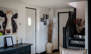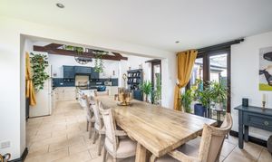 The ground floor opens into a welcoming entrance hall with a traditional stable door, ideal for country living, muddy boots and dog walks. The heart of the home is the impressive open-plan kitchen, dining and entertaining space, a wonderfully social room flooded with natural light. The kitchen is fitted with a tasteful combination of warm white and blue cabinetry, complemented by granite worktops and a classic range cooker, while the generous dining area provides ample space for hosting family and friends.