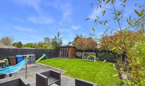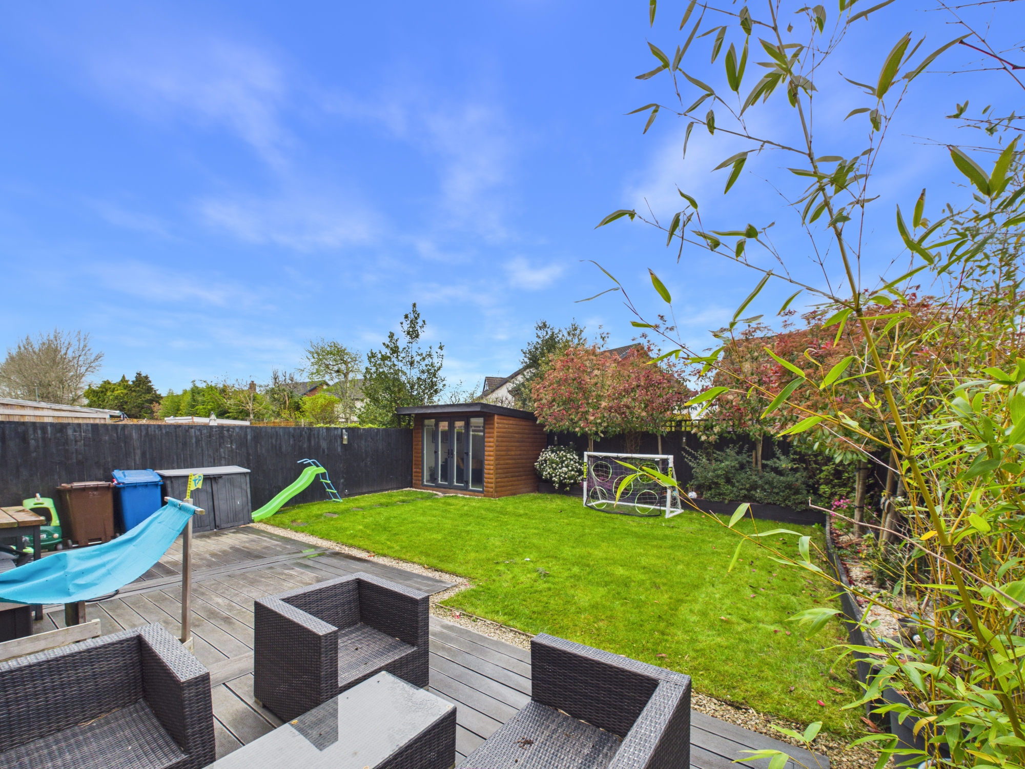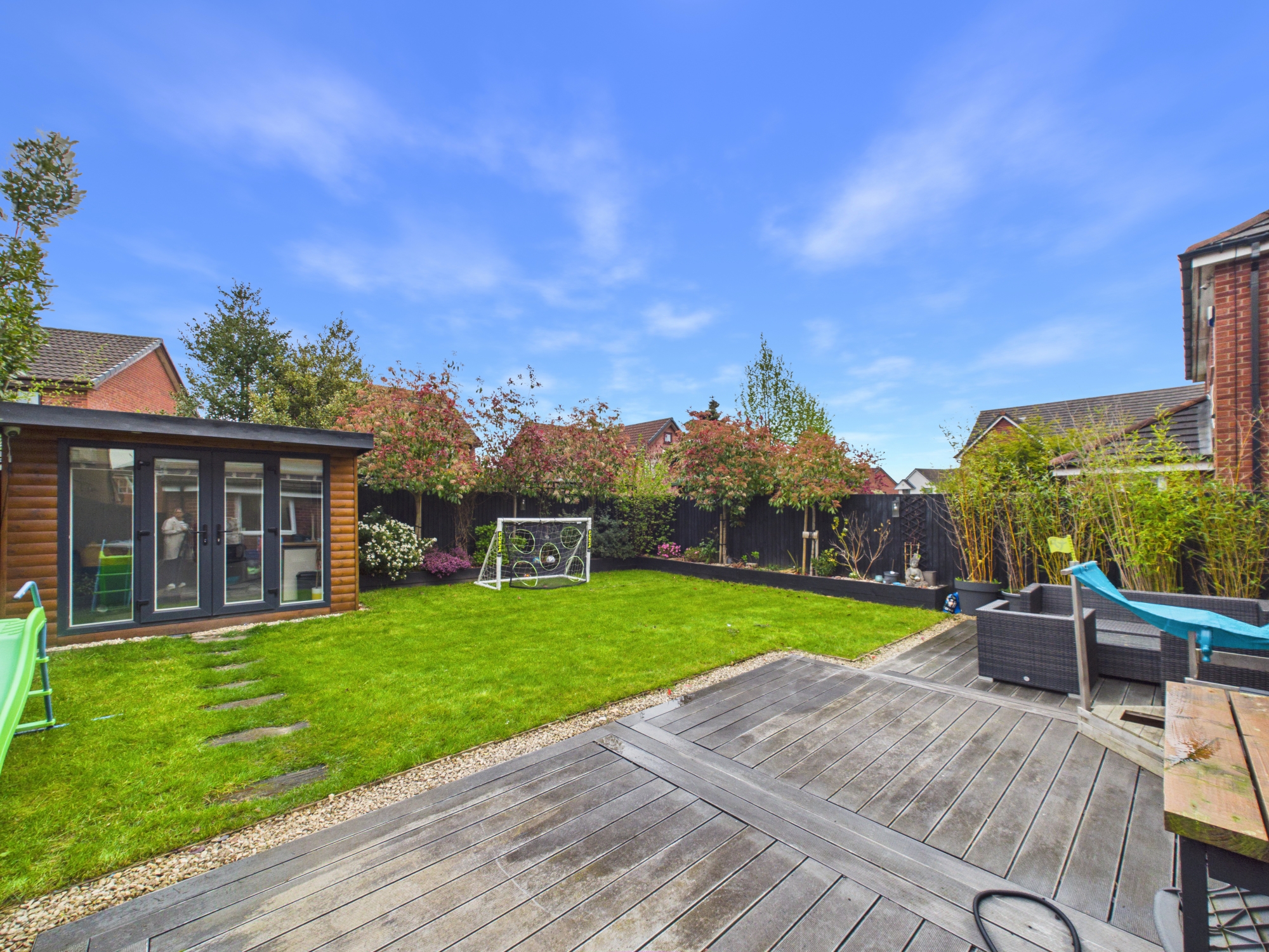 Good size rear garden, mainly laid to lawn with spacious decking area and garden room.