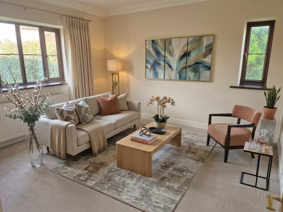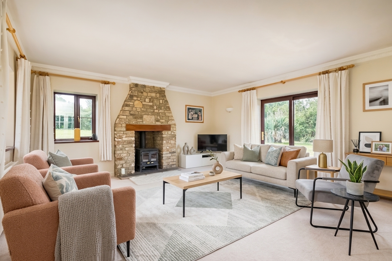 Triple aspect windows with pleasant views out, sliding patio doors to side, log burner in stone fireplace and tiled hearth, wall lighting.