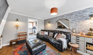 The lounge is a very good size and benefits from a window to a front aspect, stylish decor, wood flooring, pendant lighting, stairs to the first floor with open balustrades and ample space for a variety of lounge, dining and storage furniture.