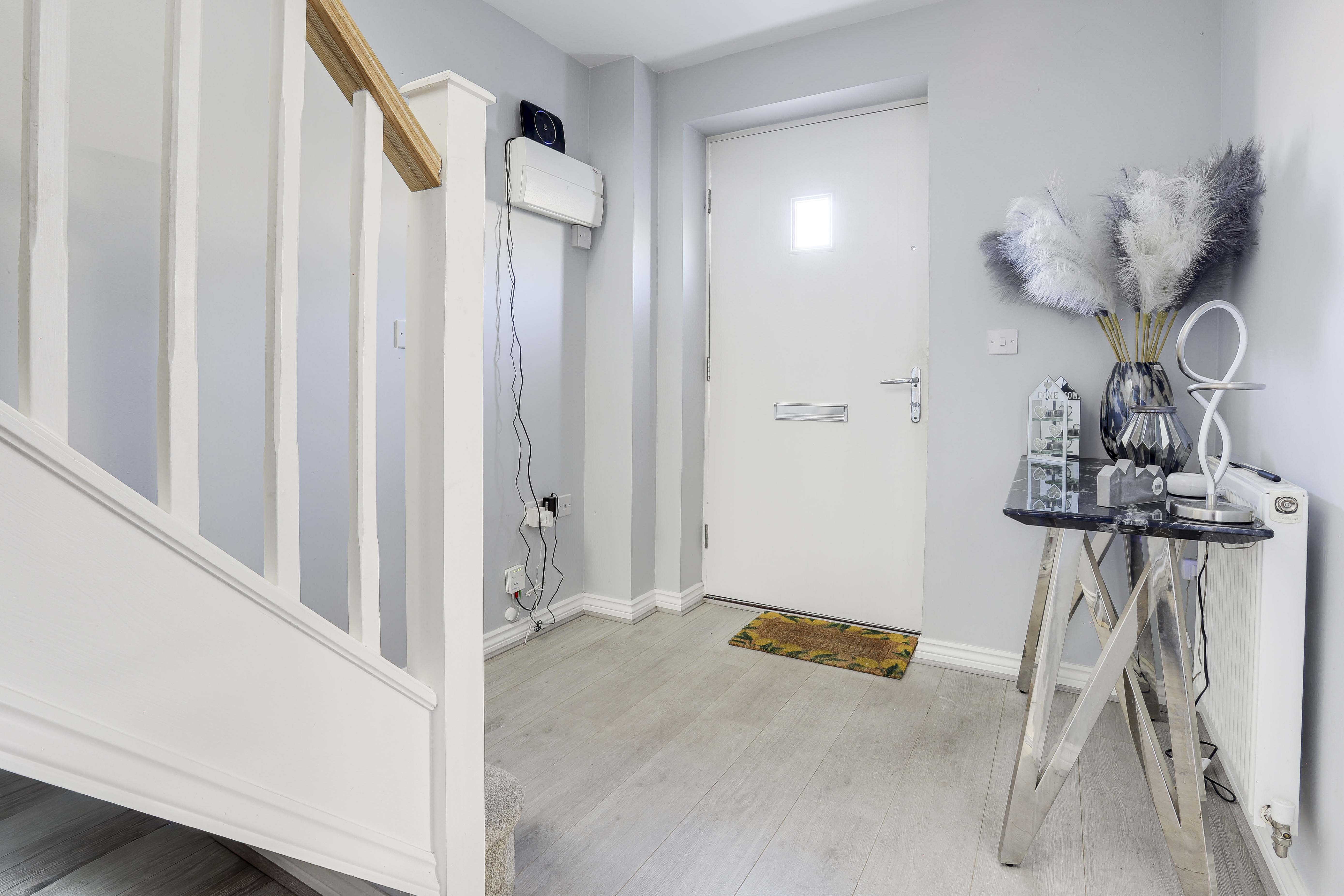 The entrance hall has wood-effect flooring, carpeted stairs, a built-in storage cupboard, a radiator, recessed spotlights, and a single composite door providing access into the accommodation.