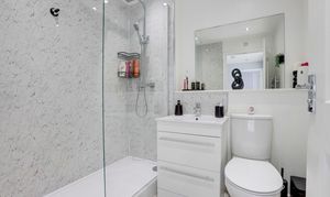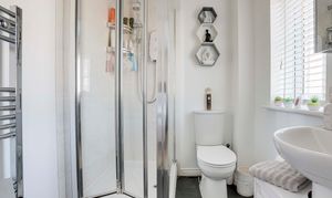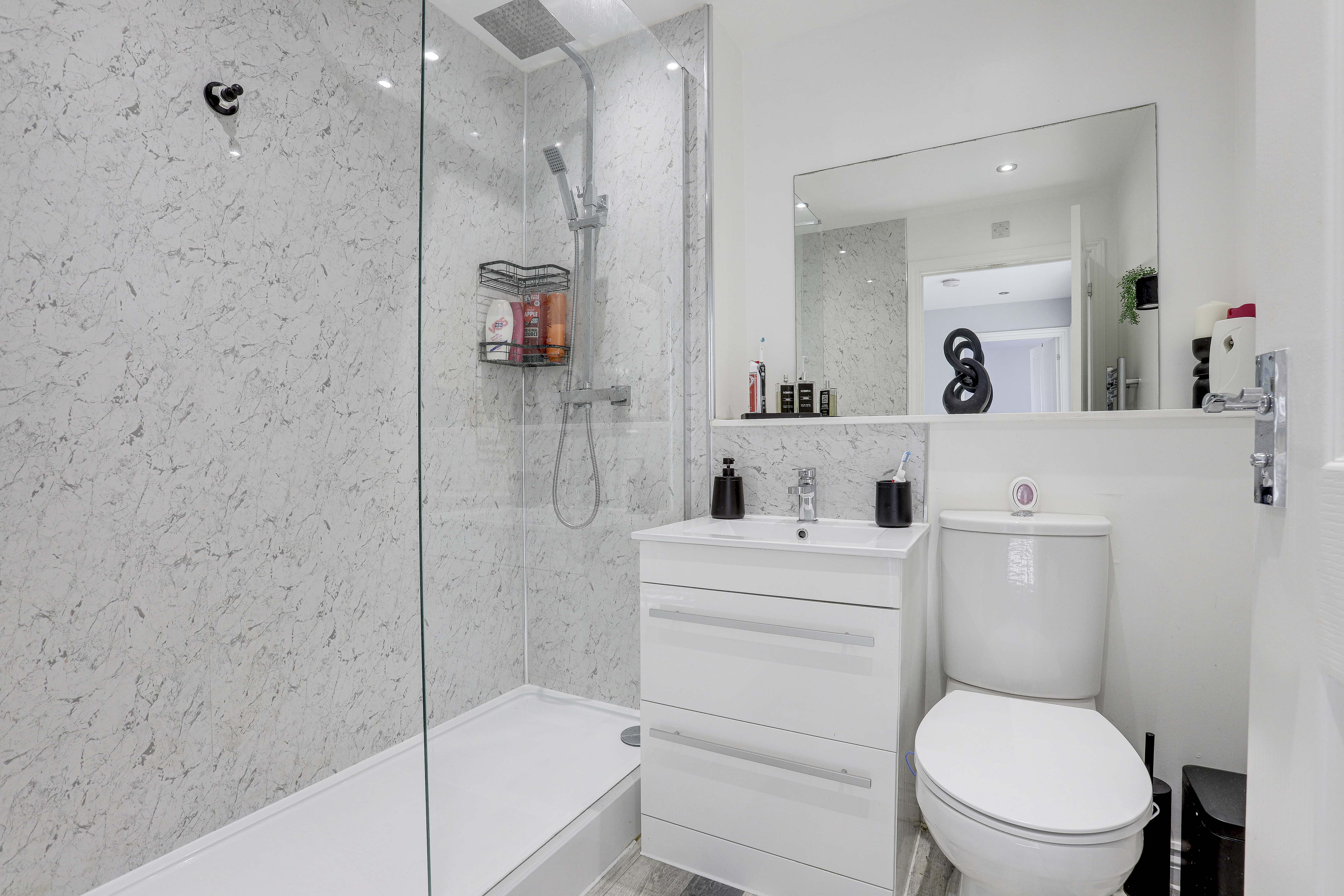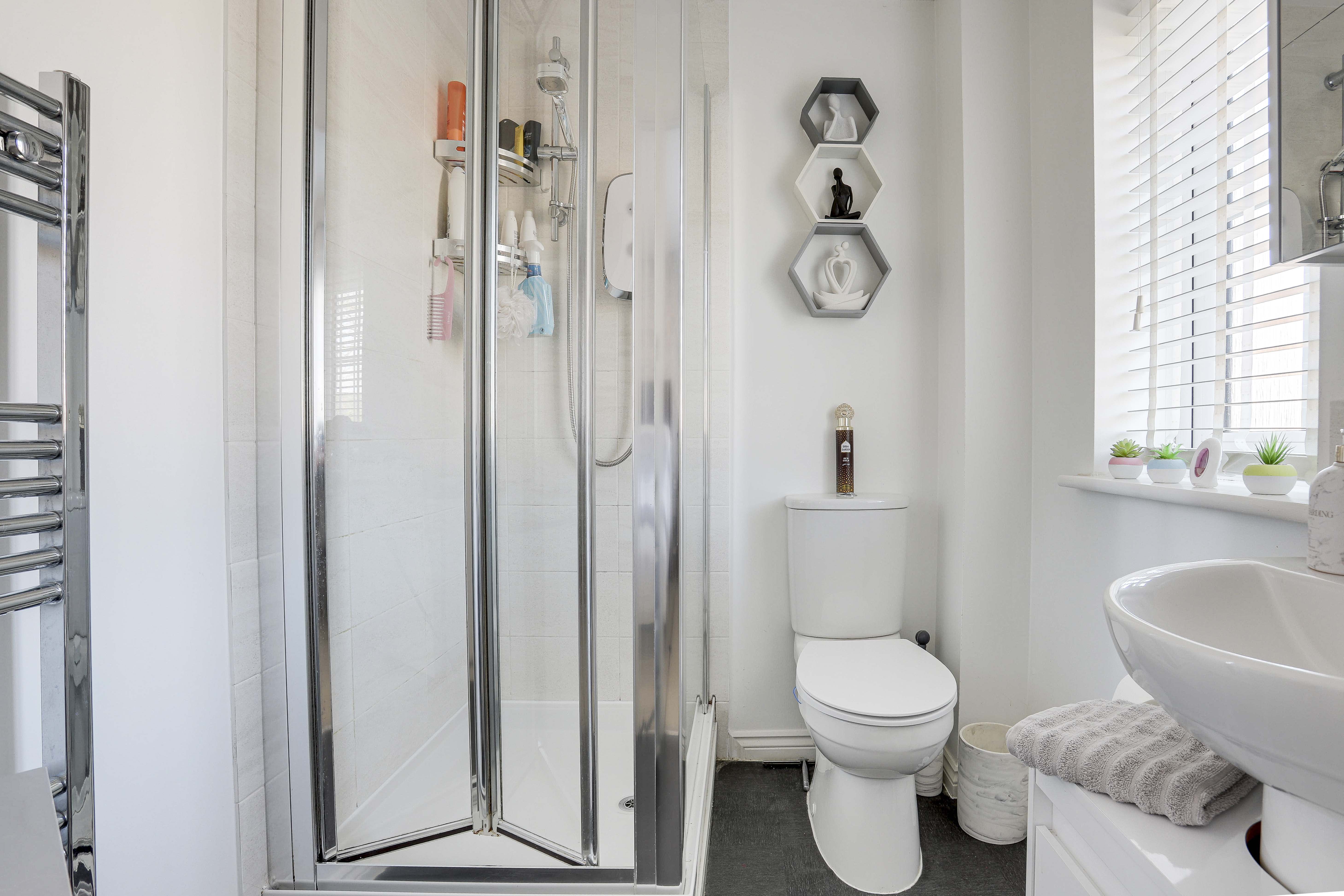 The en-suite has a low level flush W/C, a pedestal wash basin with a mixer tap, a shower enclosure with a wall-mounted electric shower fixture, vinyl flooring, partially tiled walls, a chrome heated towel rail, recessed spotlights, an extractor fan, and a UPVC double-glazed obscure window to the front elevation.