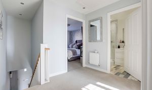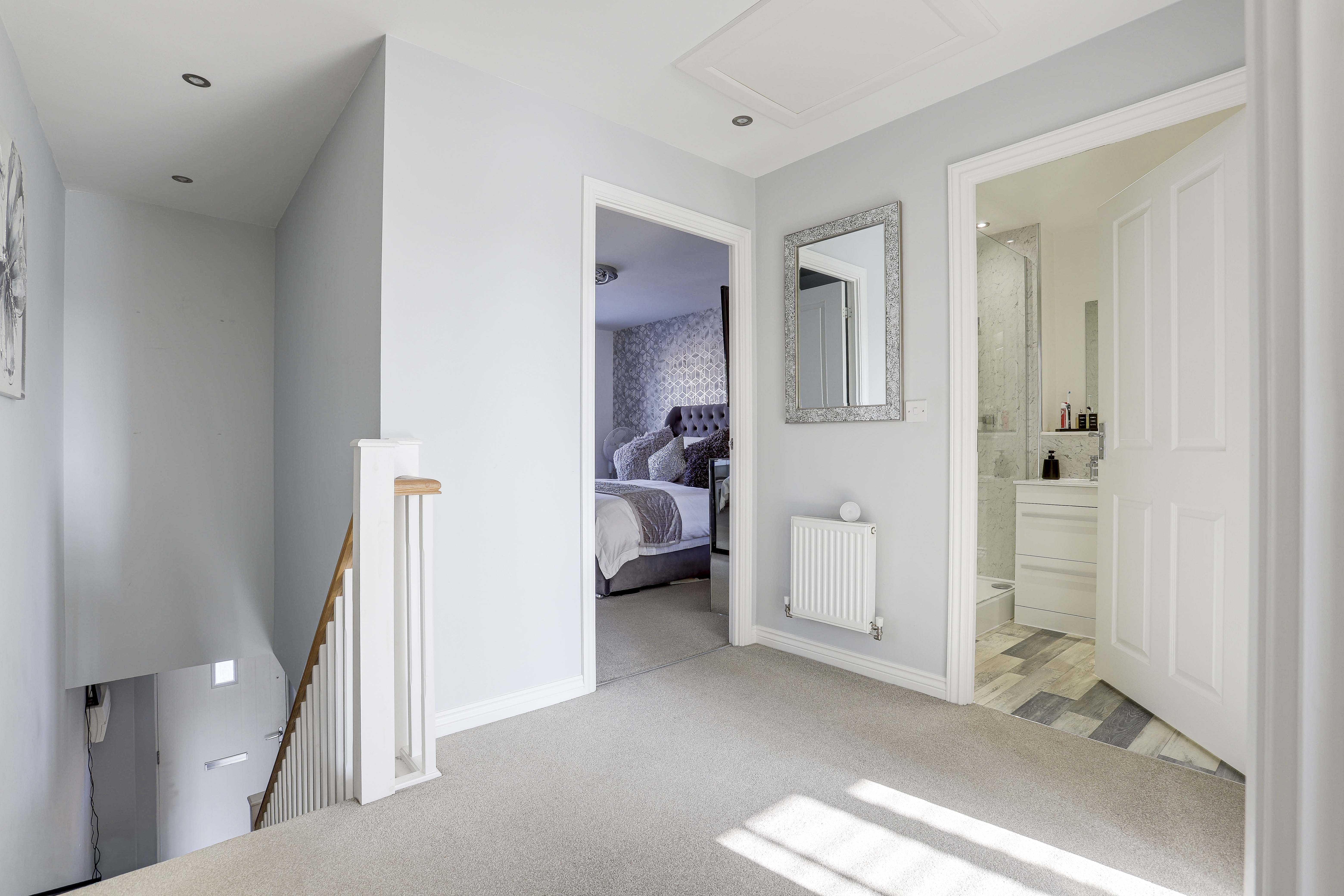 The landing has carpeted flooring, a radiator, access to the loft, recessed spotlights, and access to the first floor accommodation.