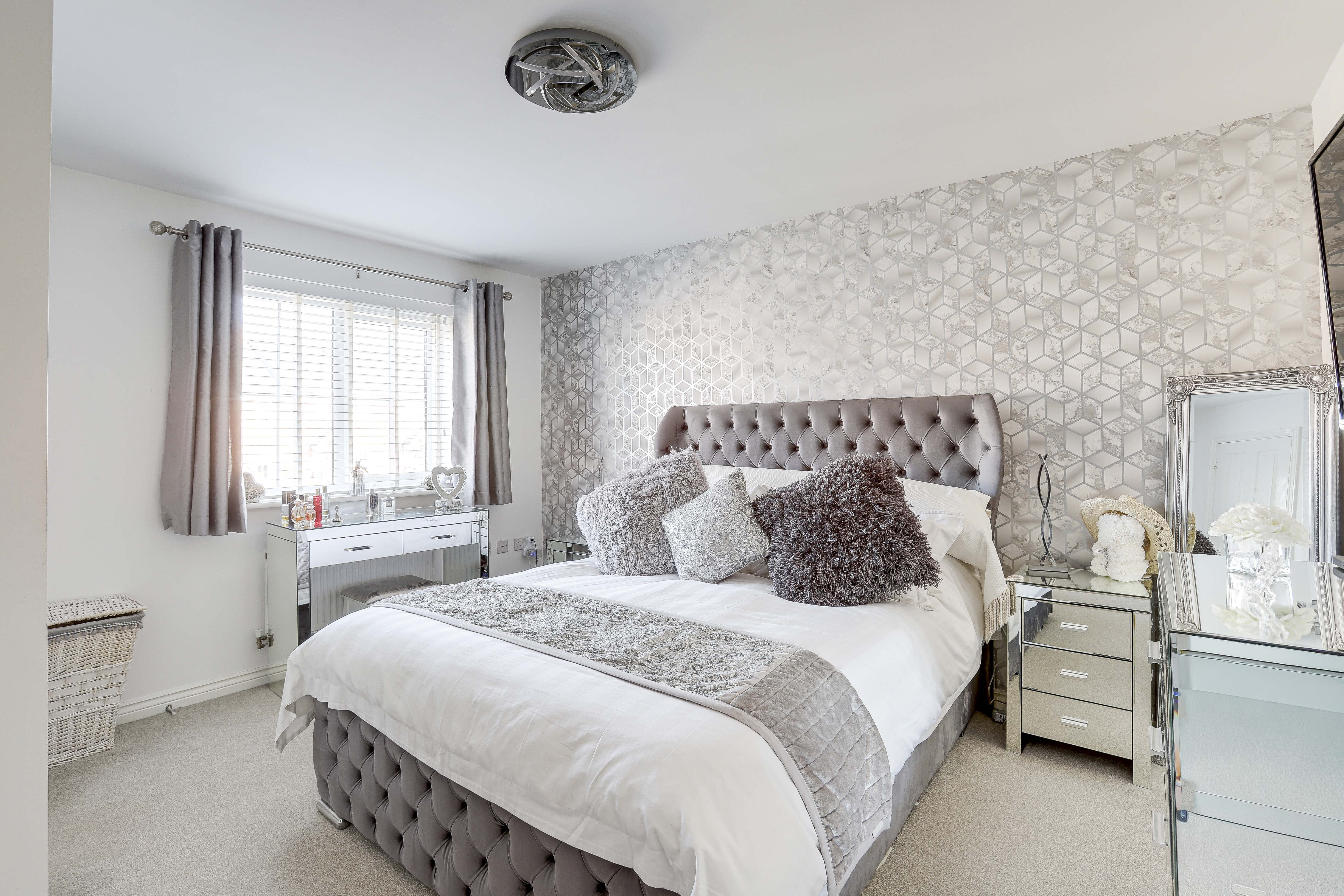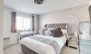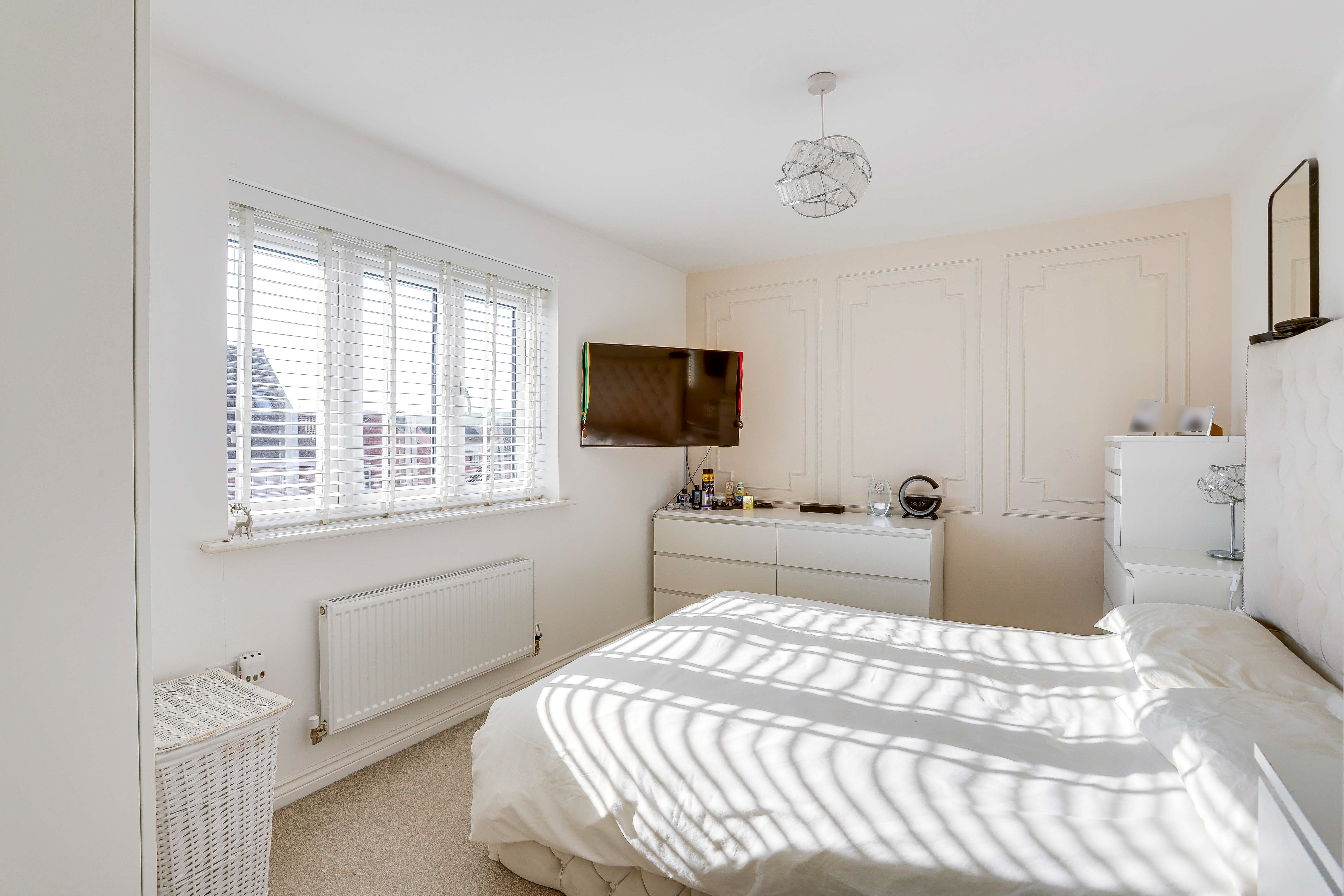 The main bedroom has carpeted flooring, a radiator, a UPVC double-glazed window to the front elevation, and access to the en-suite.