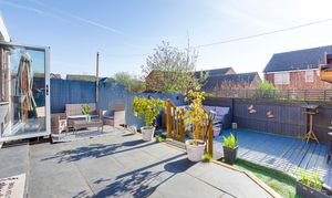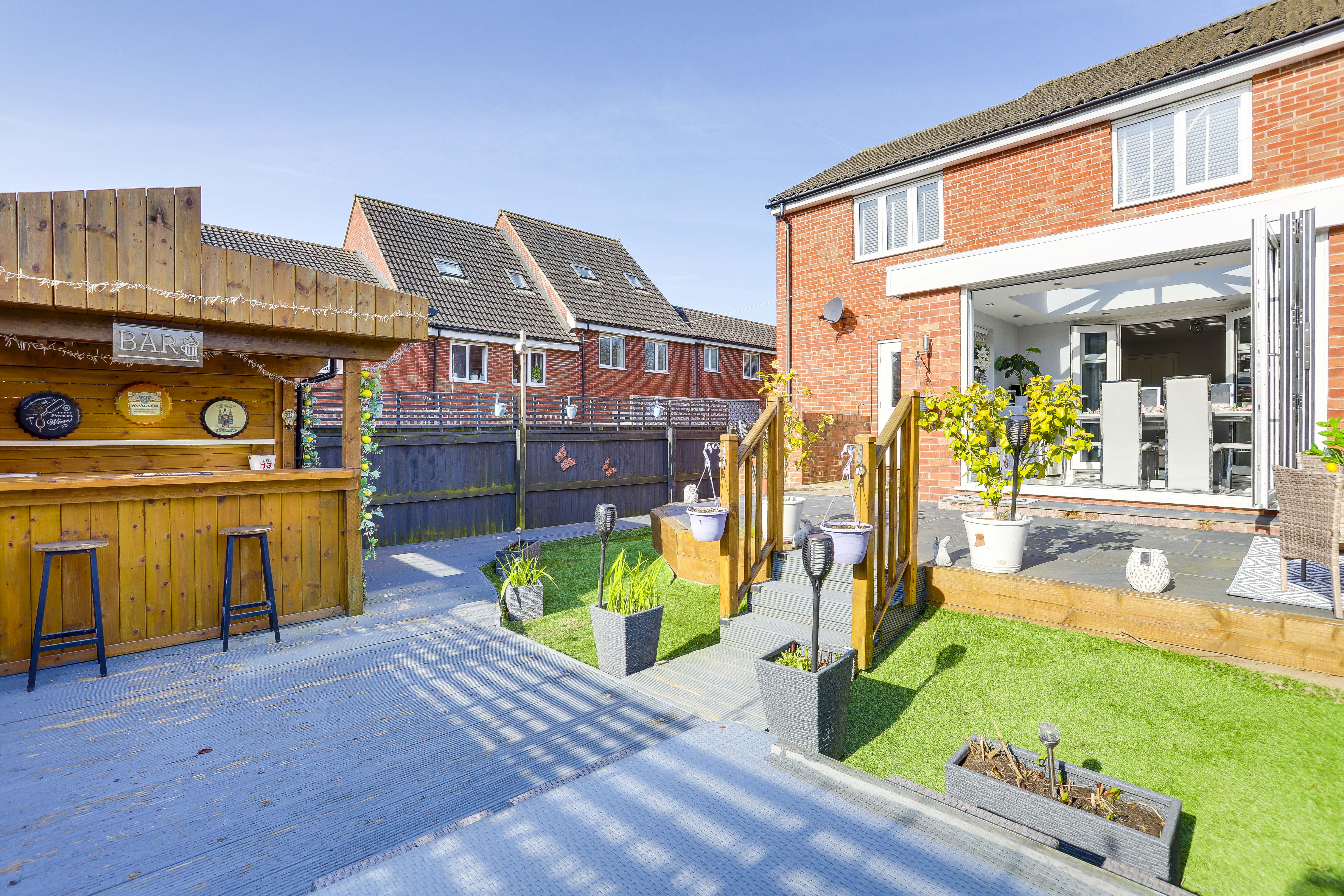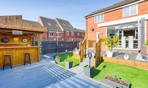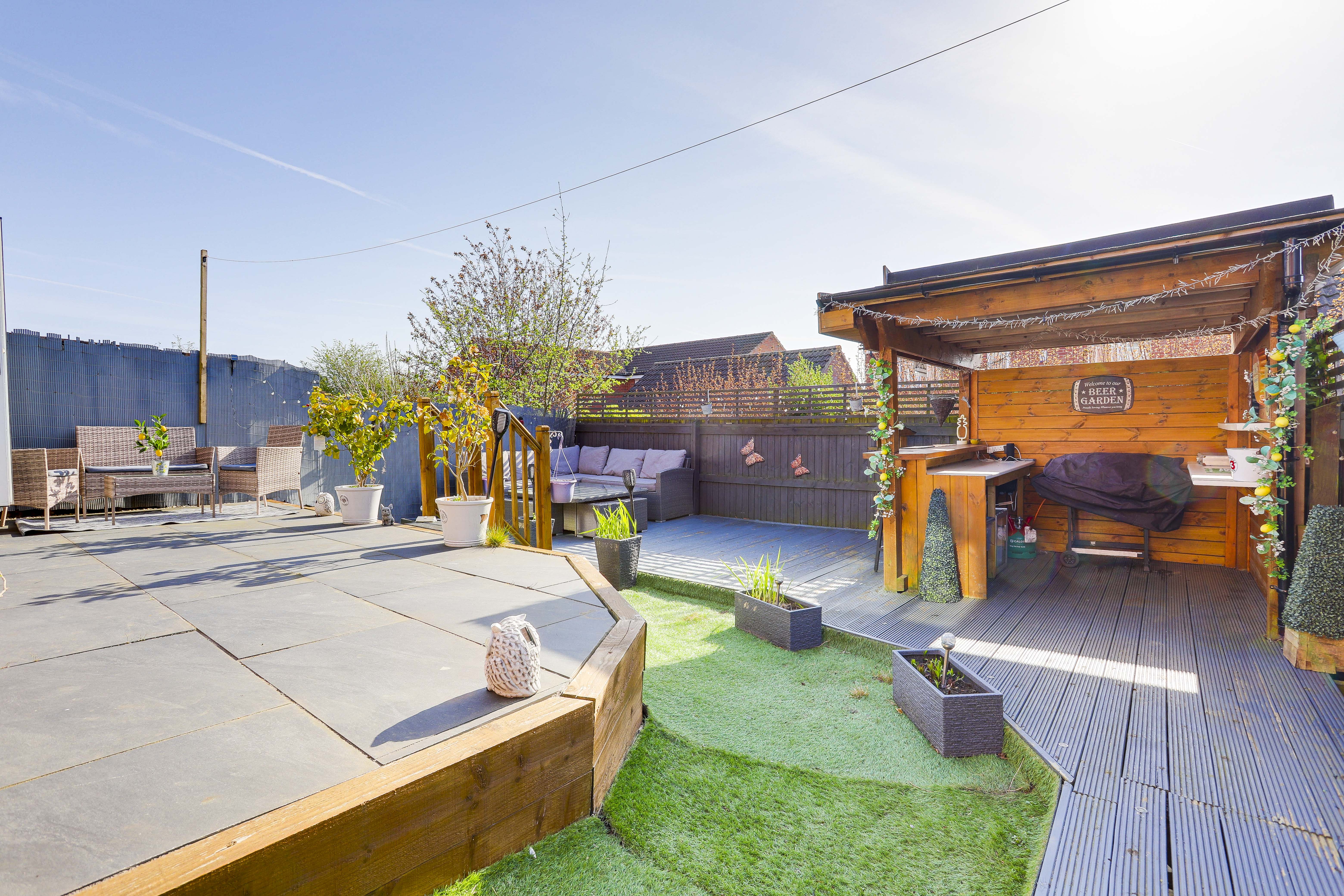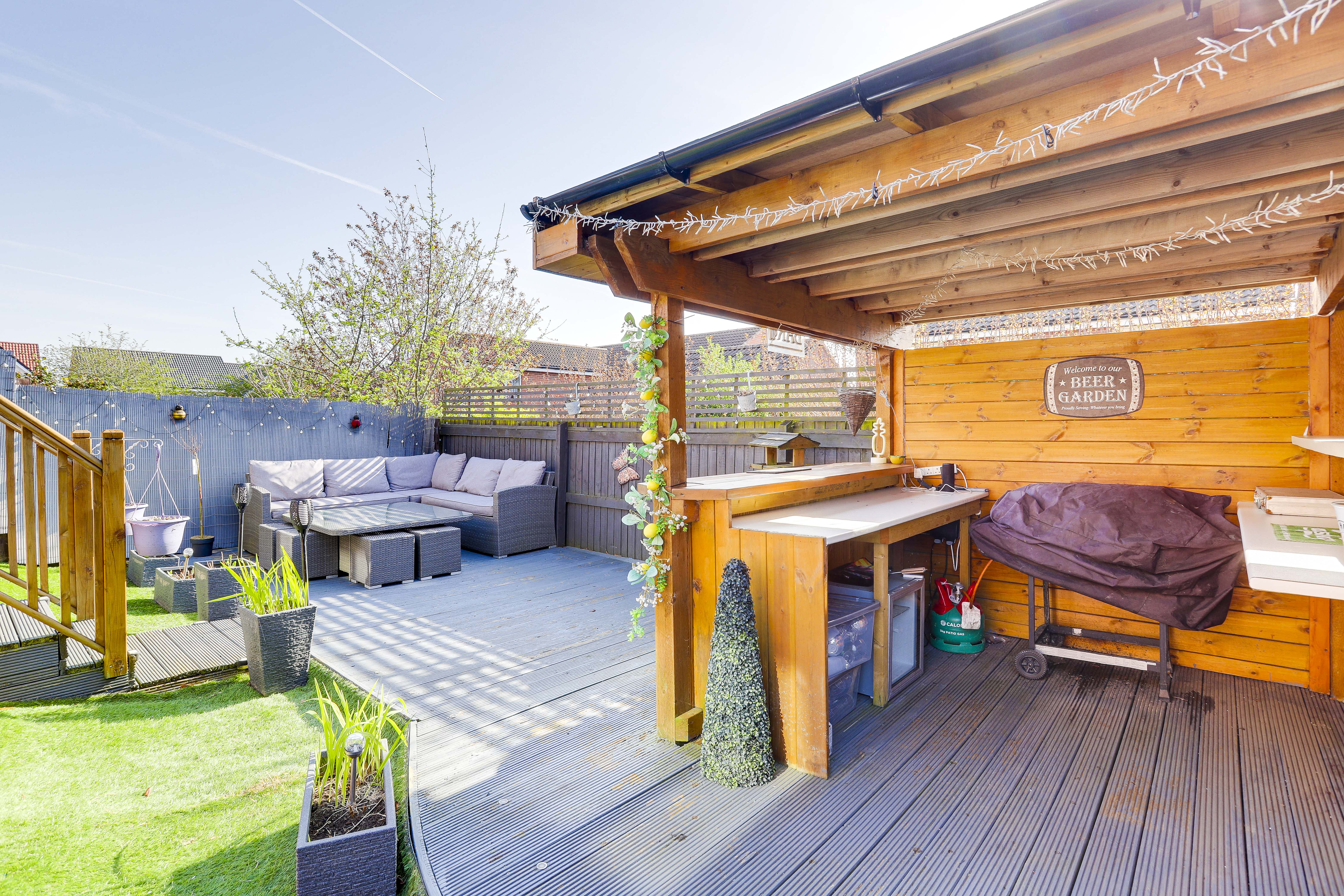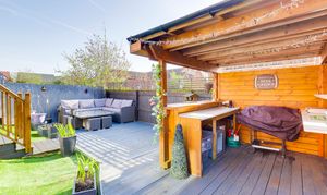 To the rear of the property is a low maintenance garden with a fully tiled patio seating area leading to an artificial lawn and to the decked patio seating area, a bar with full electricity, several electric sockets, an outdoor tap, access to the garage, and fence panelled boundaries.
