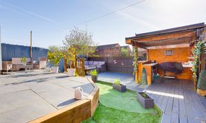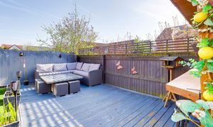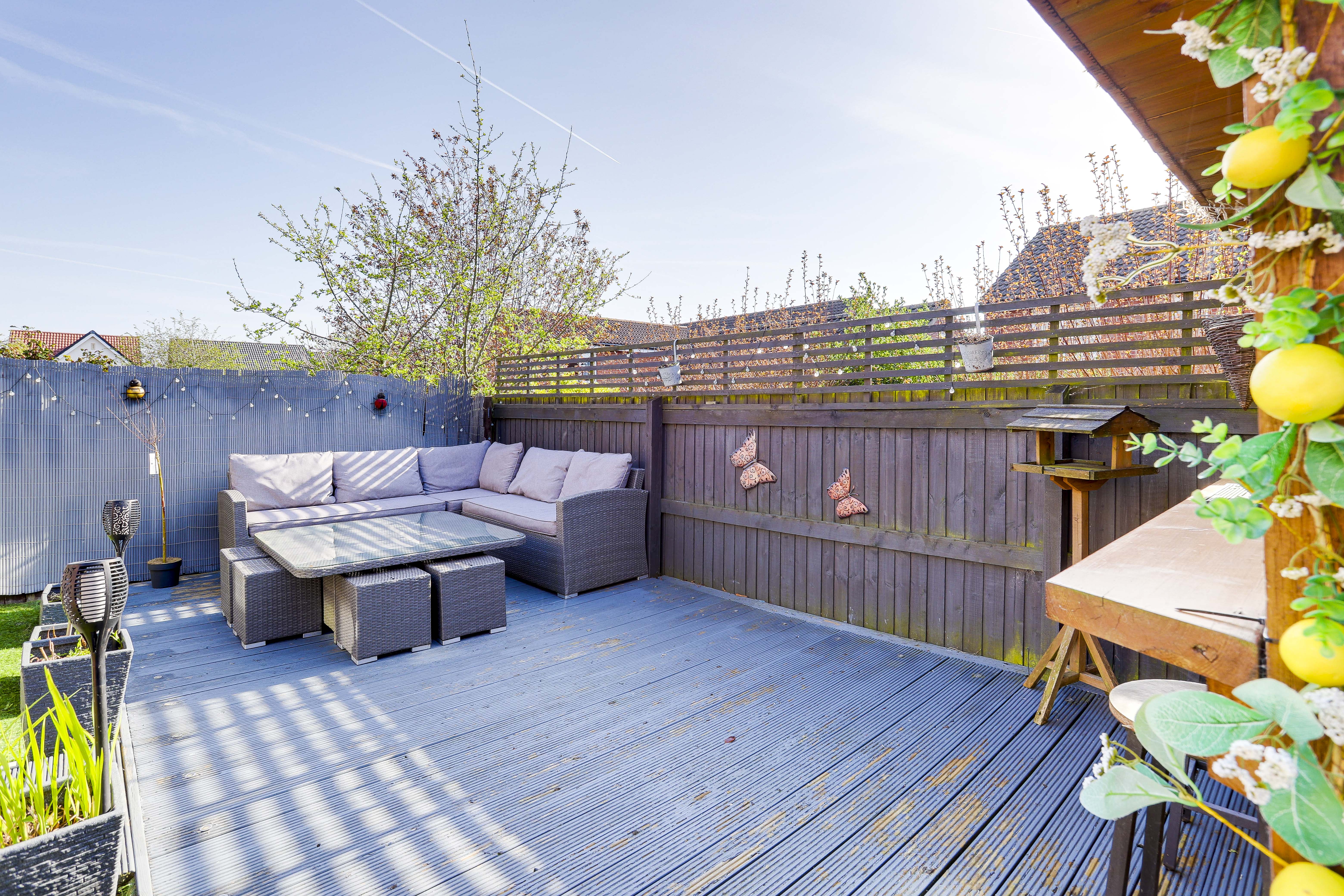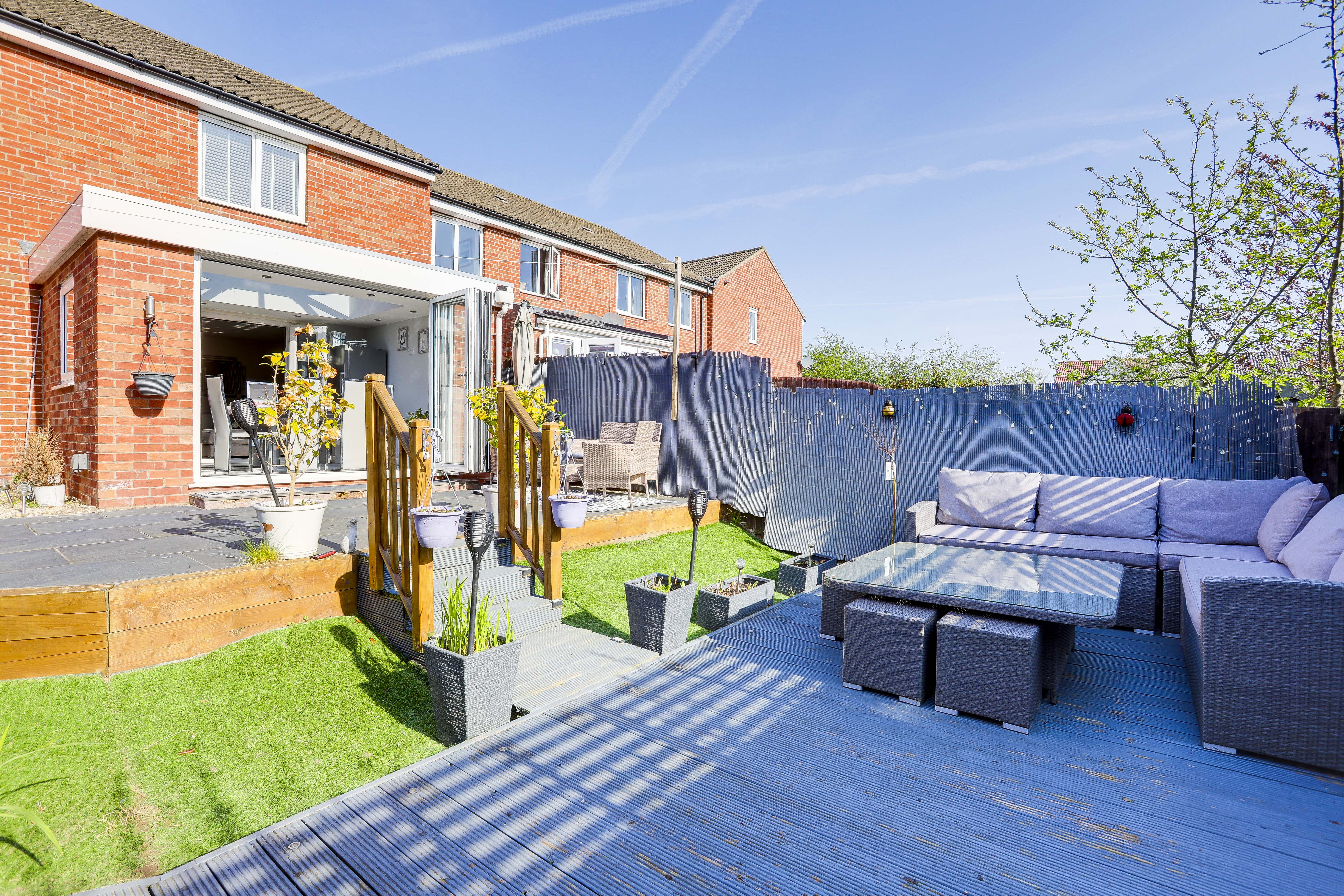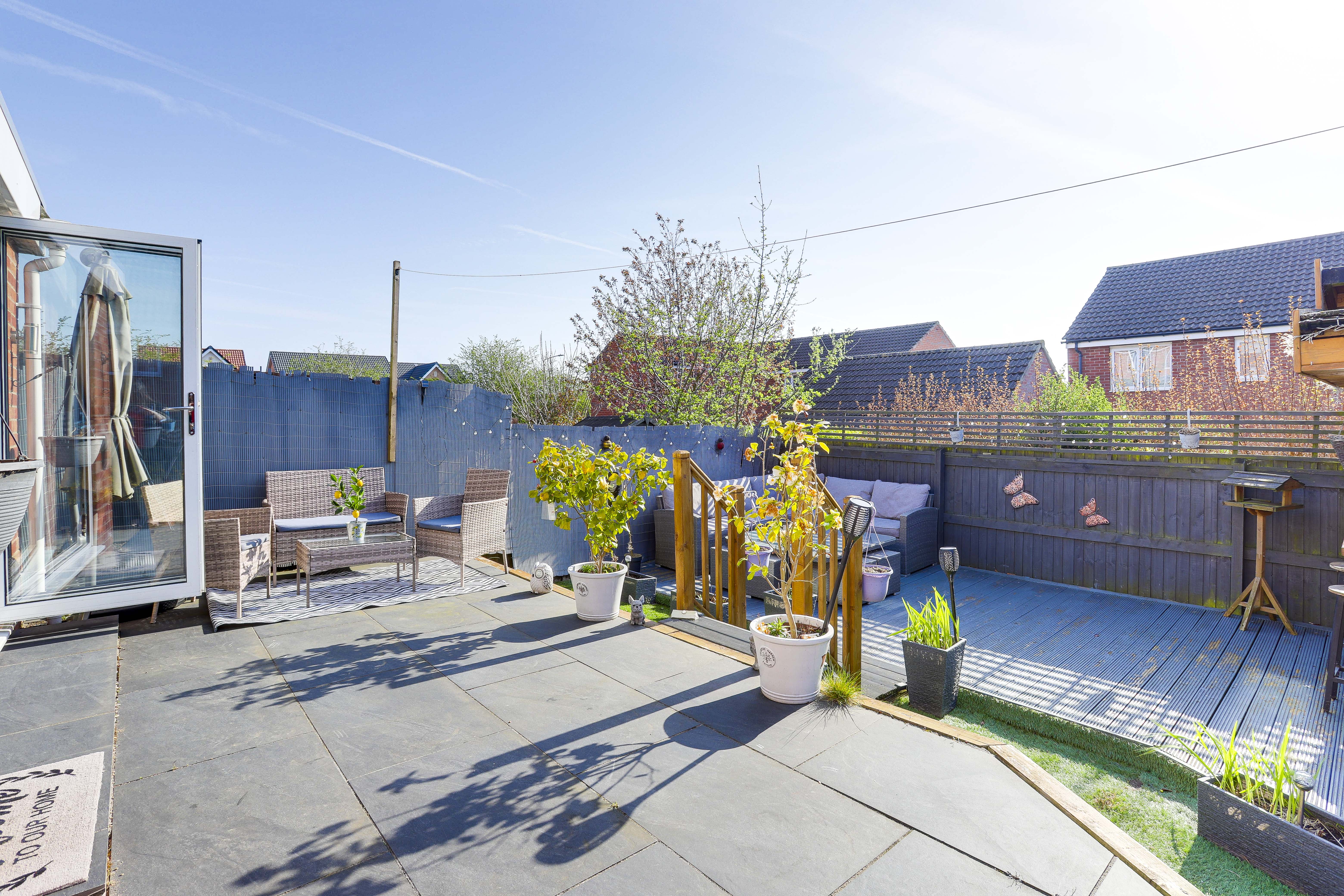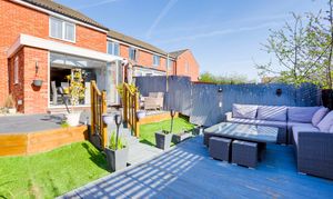 To the rear of the property is a low maintenance garden with a fully tiled patio seating area leading to an artificial lawn and to the decked patio seating area, a bar with full electricity, several electric sockets, an outdoor tap, access to the garage, and fence panelled boundaries.