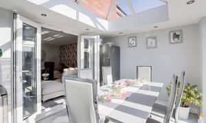 The orangery has tiled flooring, recessed spotlights, UPVC double-glazed windows to the side elevation, a glass pitched roof, and bi-fold doors leading out to the garden.