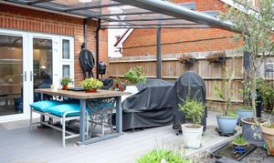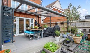 Outside, the rear garden faces south and includes decking with a covered glass veranda, along with lawn and patio areas. There is also a garage, off street parking and side access.