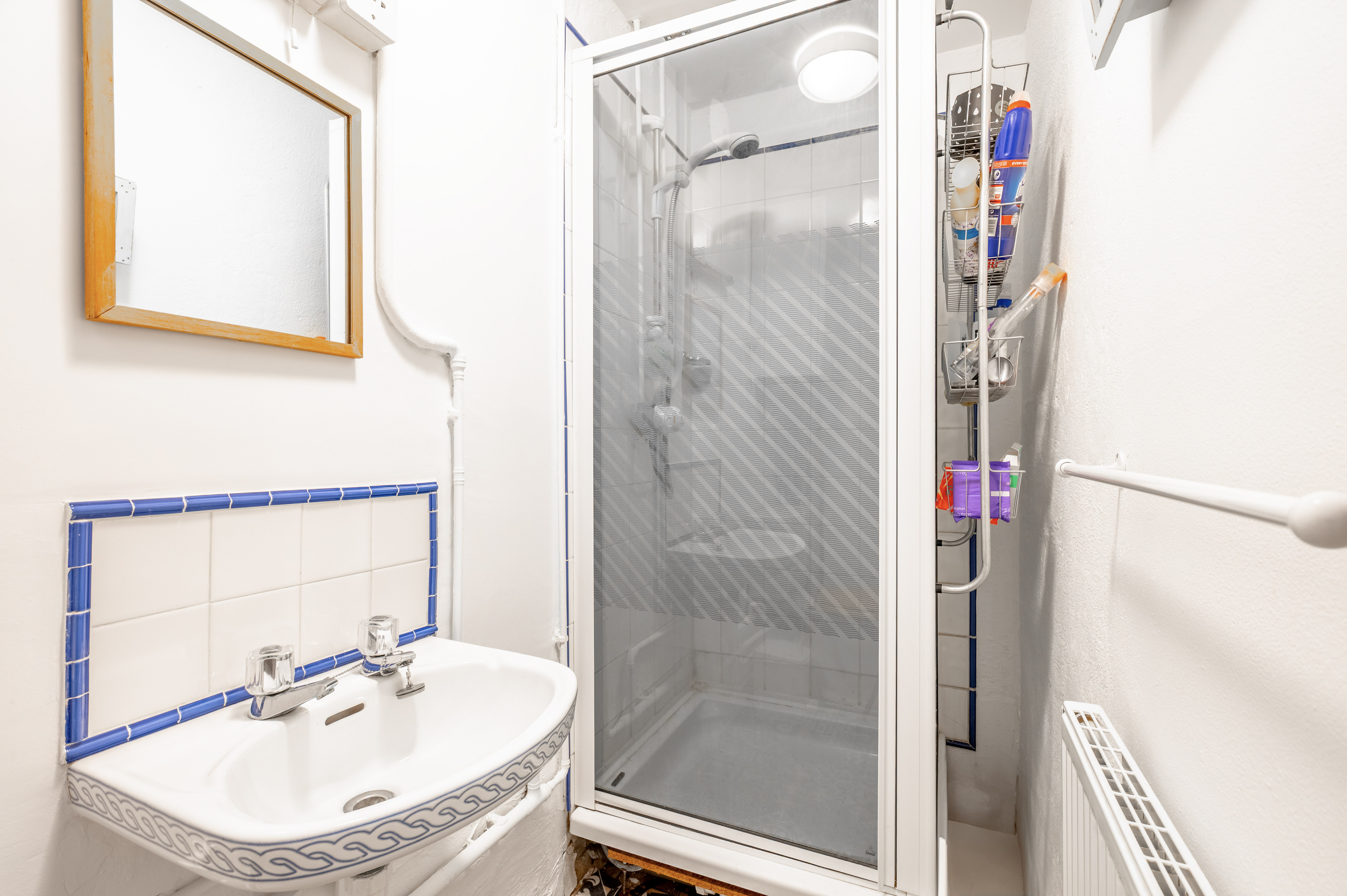 Completing the interior, the family shower room is finished with patterned detailing and tiled surrounds, offering a shower enclosure, WC, and wash basin, with exposed pipework and a fitted boiler reflecting the home’s authentic character. Bright finishes and a straightforward layout ensure the room remains practical and easy to maintain.