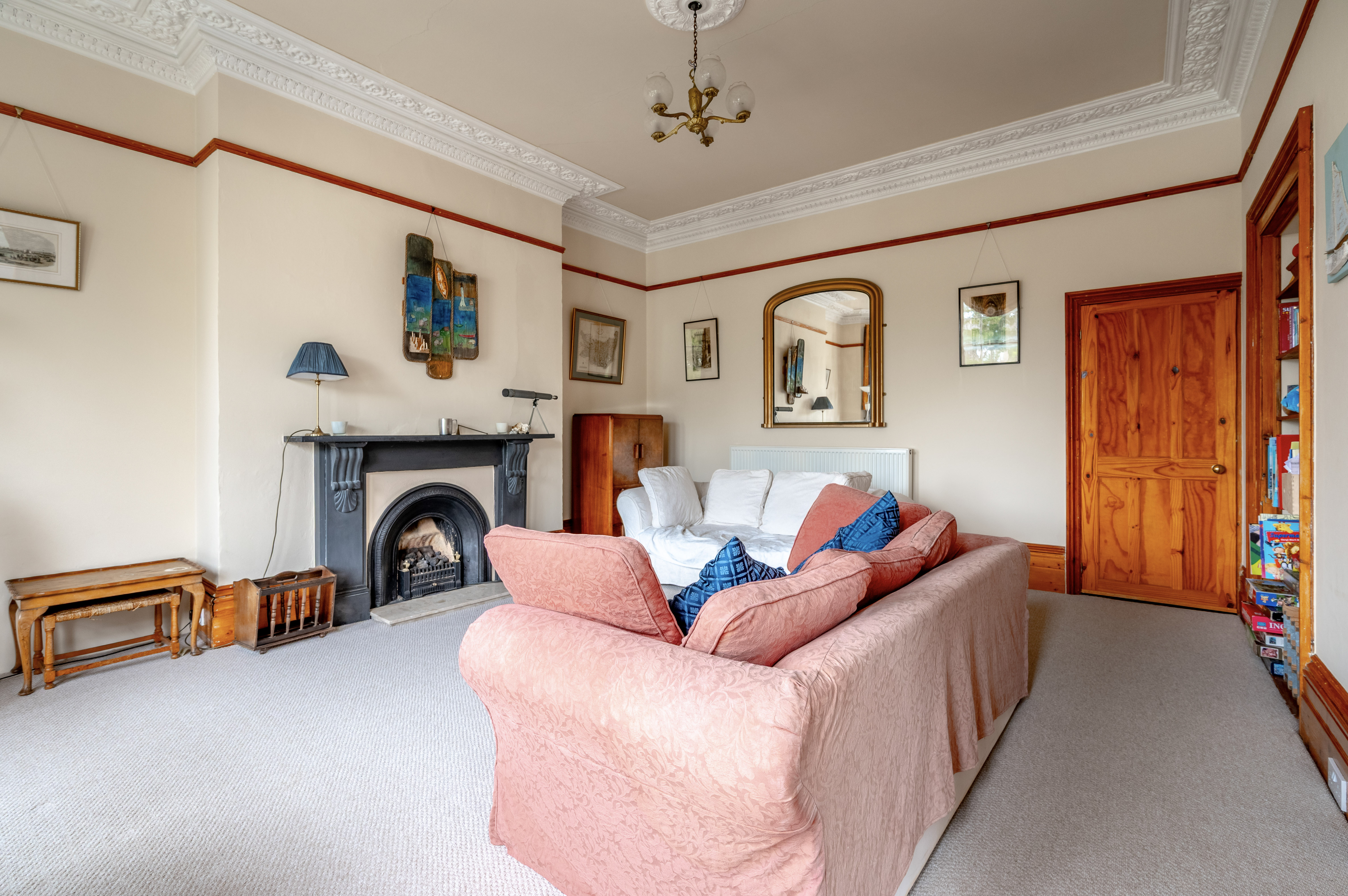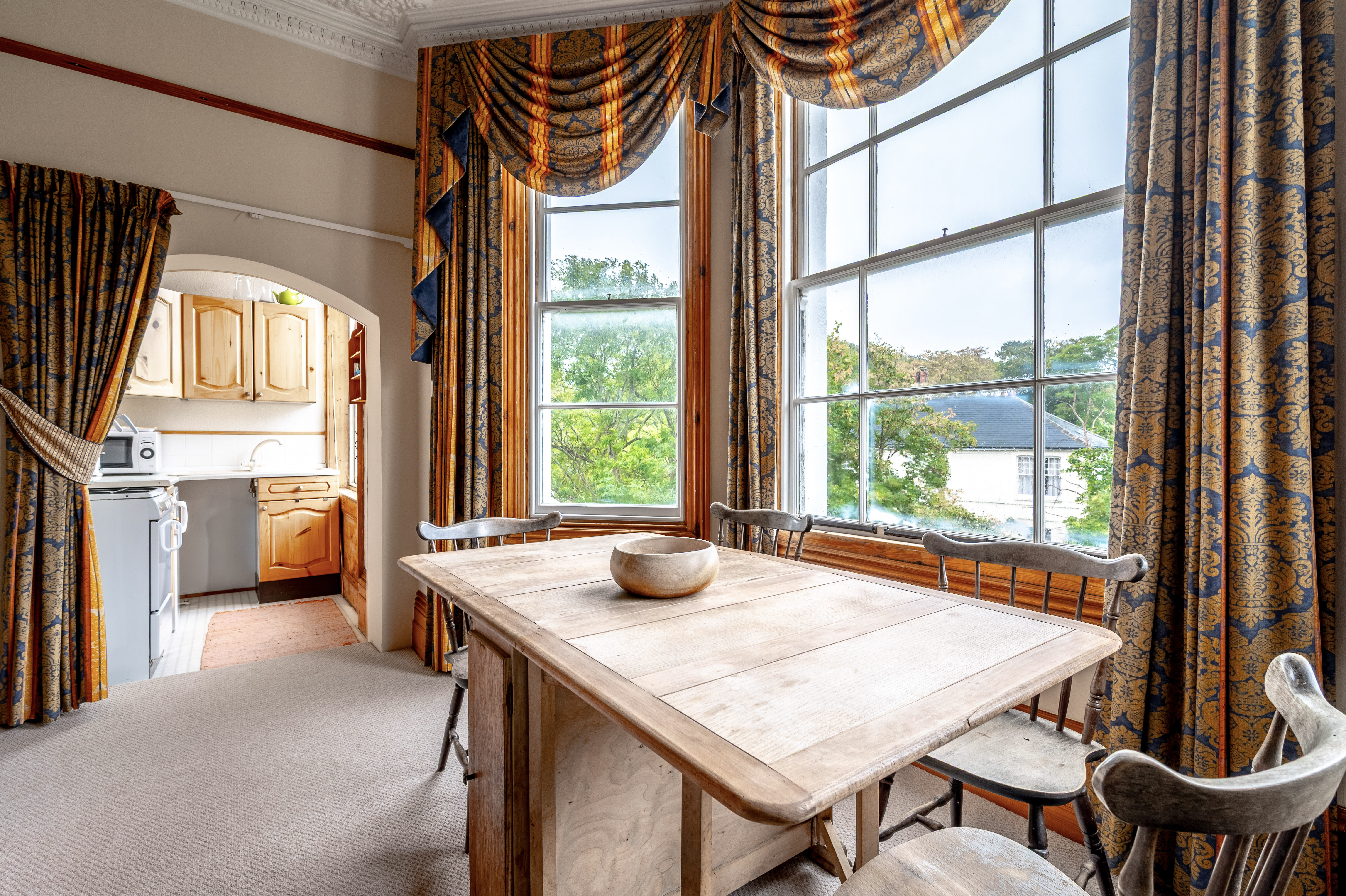 Stepping in through the entrance hall, you are drawn into the striking bay-fronted lounge and dining area, a reception space that radiates period charm. Ornate ceiling cornices, a decorative ceiling rose, and a traditional fireplace create an elegant focal point, while the large bay window allows light to cascade across the room and offers wide views of the greenery beyond. The rich woodwork around the windows and doors enhances the atmosphere, adding depth and warmth to the grandeur of the proportions. Built-in shelving adds both character and functionality, while carpet flooring softens the feel of the room.