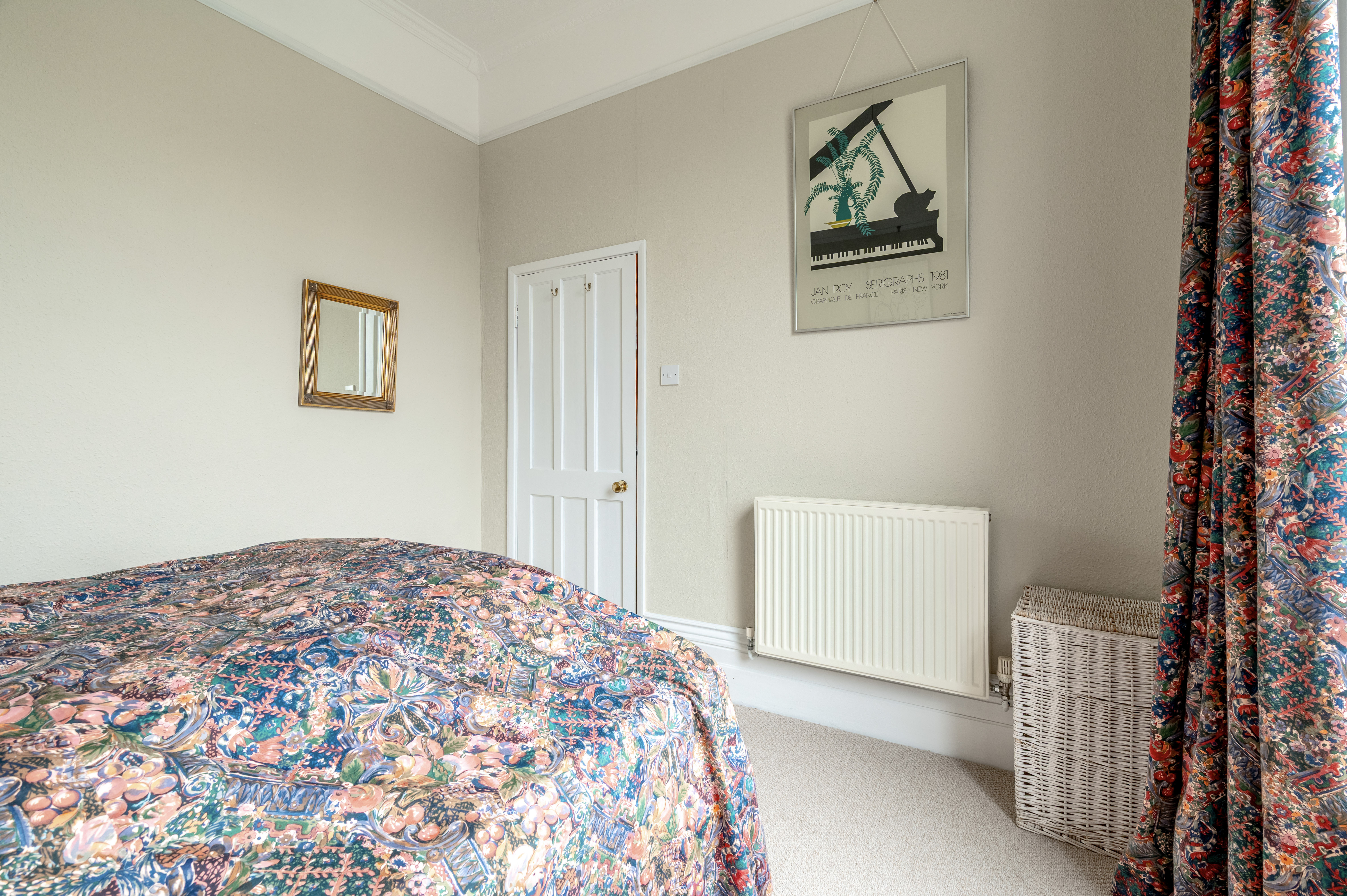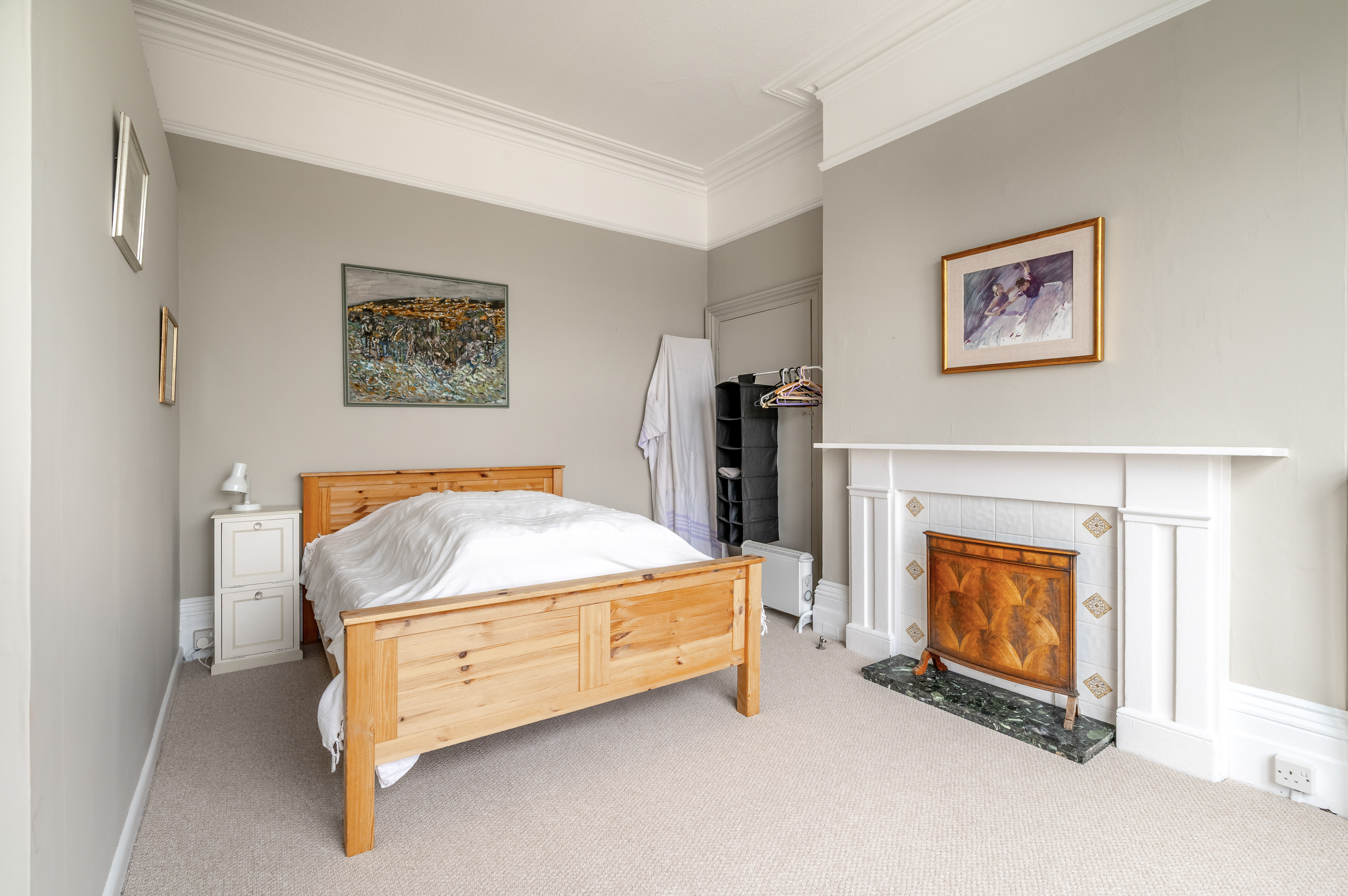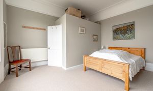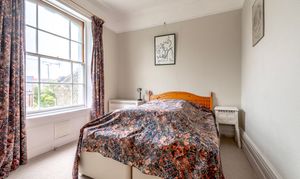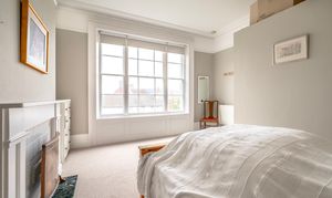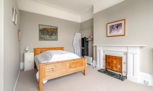 The apartment presents two well-sized double bedrooms, both with carpet flooring and filled with light from tall sash windows that speak to the property’s heritage. The principal bedroom is particularly impressive, with elevated rooftop views and a period fireplace featuring tiled detailing and a marble hearth, offering a refined and characterful touch. The second bedroom continues the theme of light and height, with sash windows enhancing the sense of space.