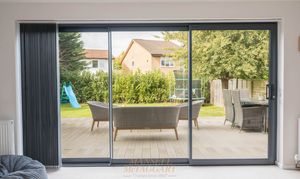A covered porch gives access to a large entrance hallway, partly laid to wooden flooring with useful understairs storage cupboard. At the front of the house are a study and further reception room, ideal for use as a playroom or ‘snug’. There is access to the garage and to a downstairs shower room which has a frosted window to the side, shower cubicle with half screen, low level WC and wash hand basin, with wall mounted heated towel rail. At the rear of the house the living room has an open fireplace and sliding triple doors across the back lead straight out to the decked area of the garden. The modern kitchen is fitted with an attractive range of white gloss wall and base units, a sink drainer unit is set into work surfaces below a window to the side, there is space and plumbing for a washing machine and dishwasher, space for a range style cooker and a free-standing fridge/freezer. Spotlights have been added by the current owners, and wooden flooring runs under an archway through to the dining area, with sliding doors leading outside to both the side and rear.