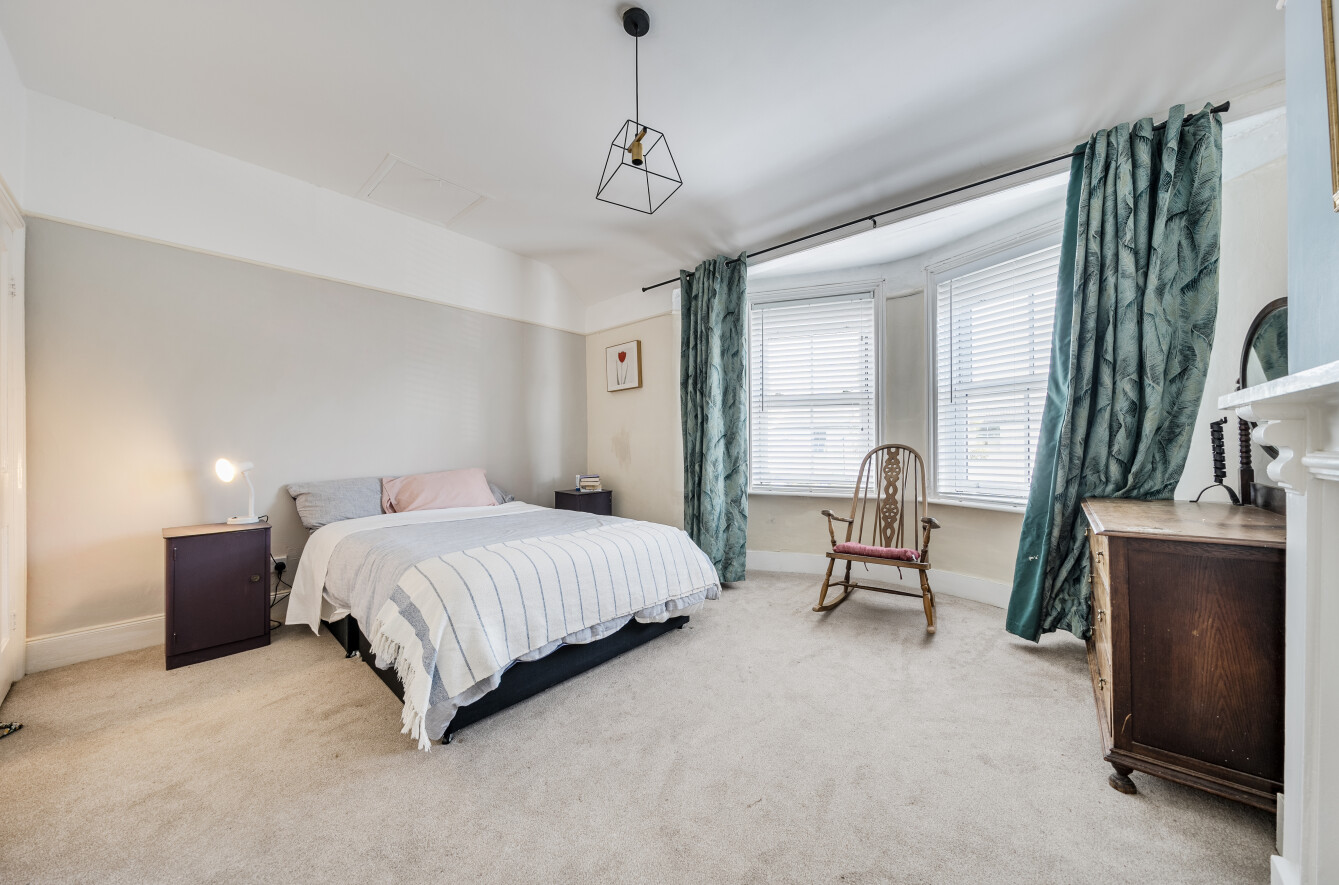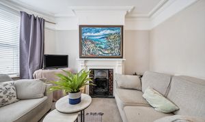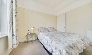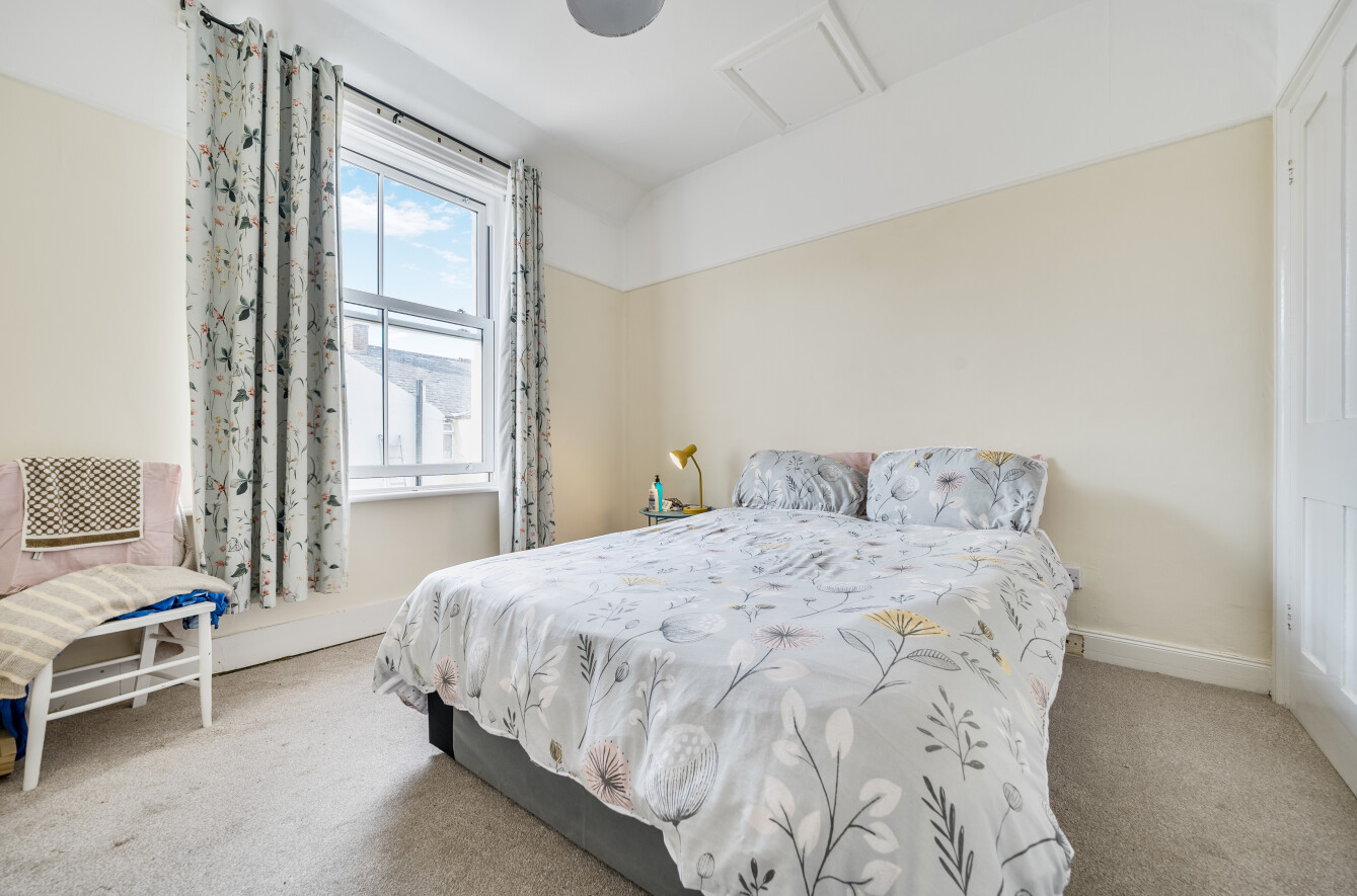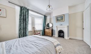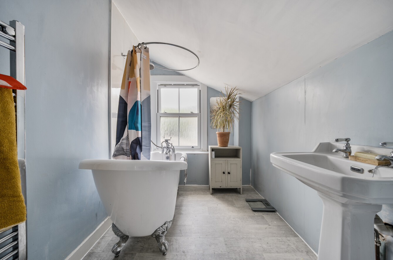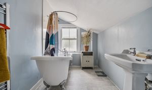 On the first floor, there are two double bedrooms, the principal bedroom has a beautiful cast iron fireplace and feature bay window. The bathroom is fitted with a modern white suite with shower over the free-standing bath.