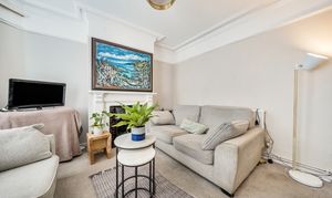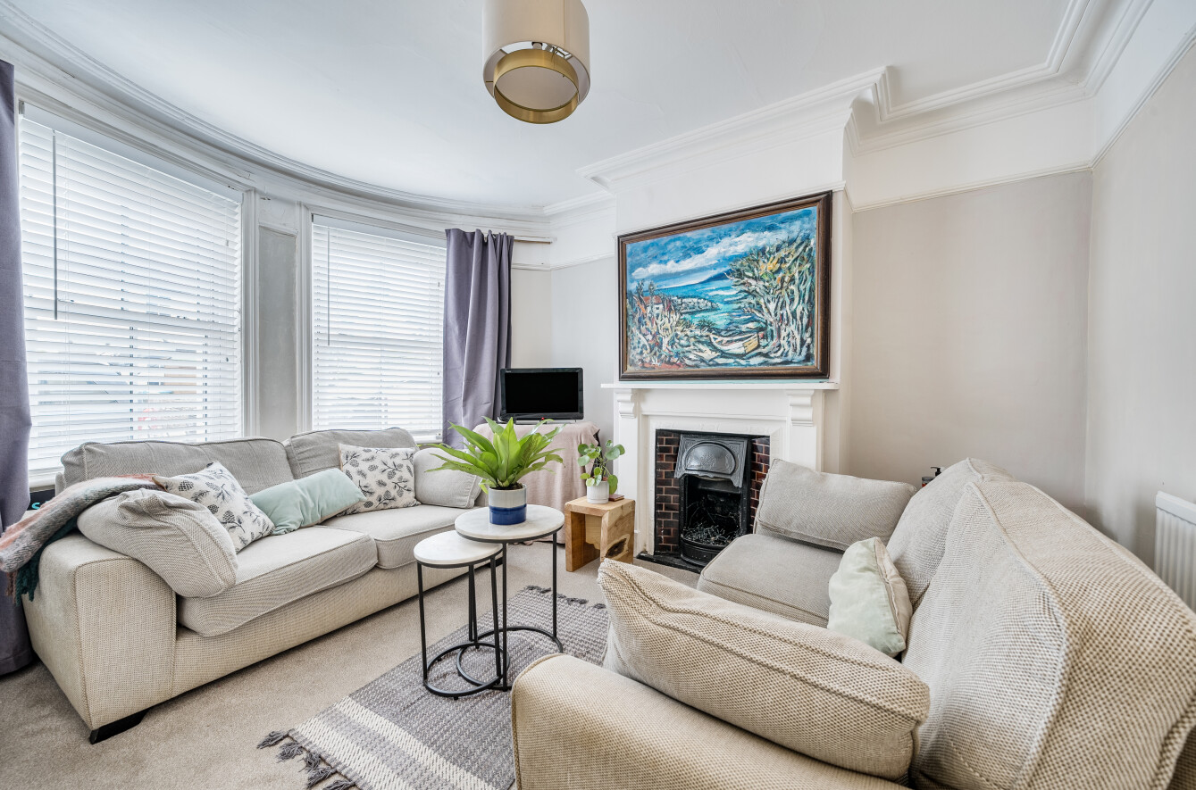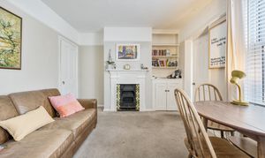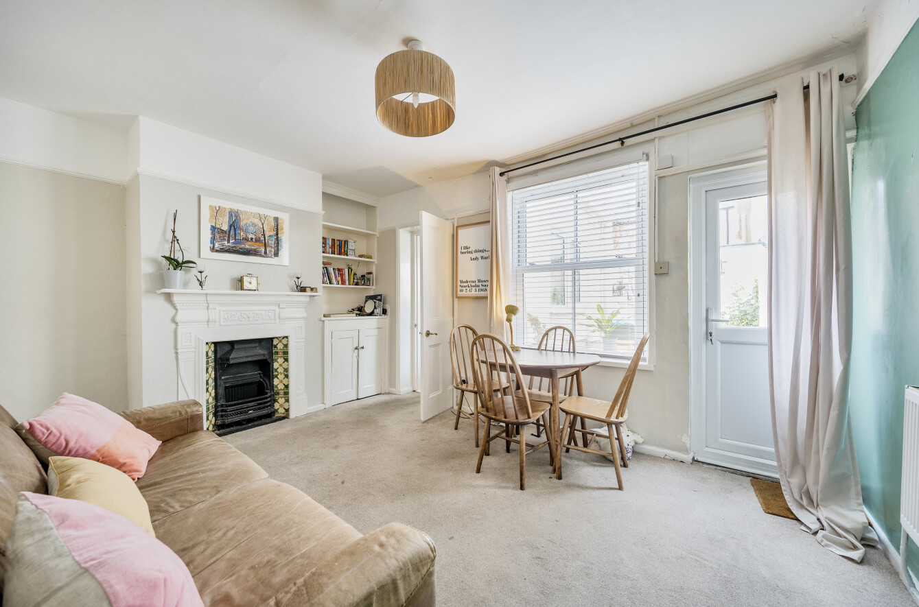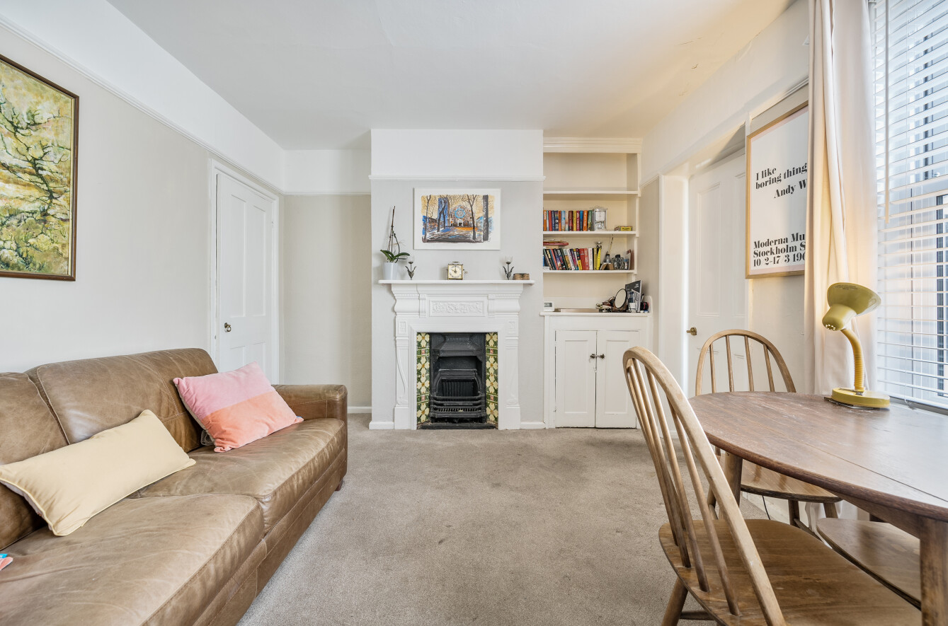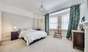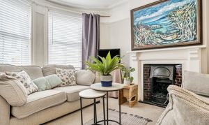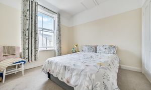 On the first floor, there are two double bedrooms, the principal bedroom has a beautiful cast iron fireplace and feature bay window. The bathroom is fitted with a modern white suite with shower over the free-standing bath.