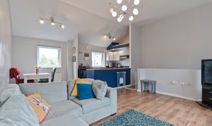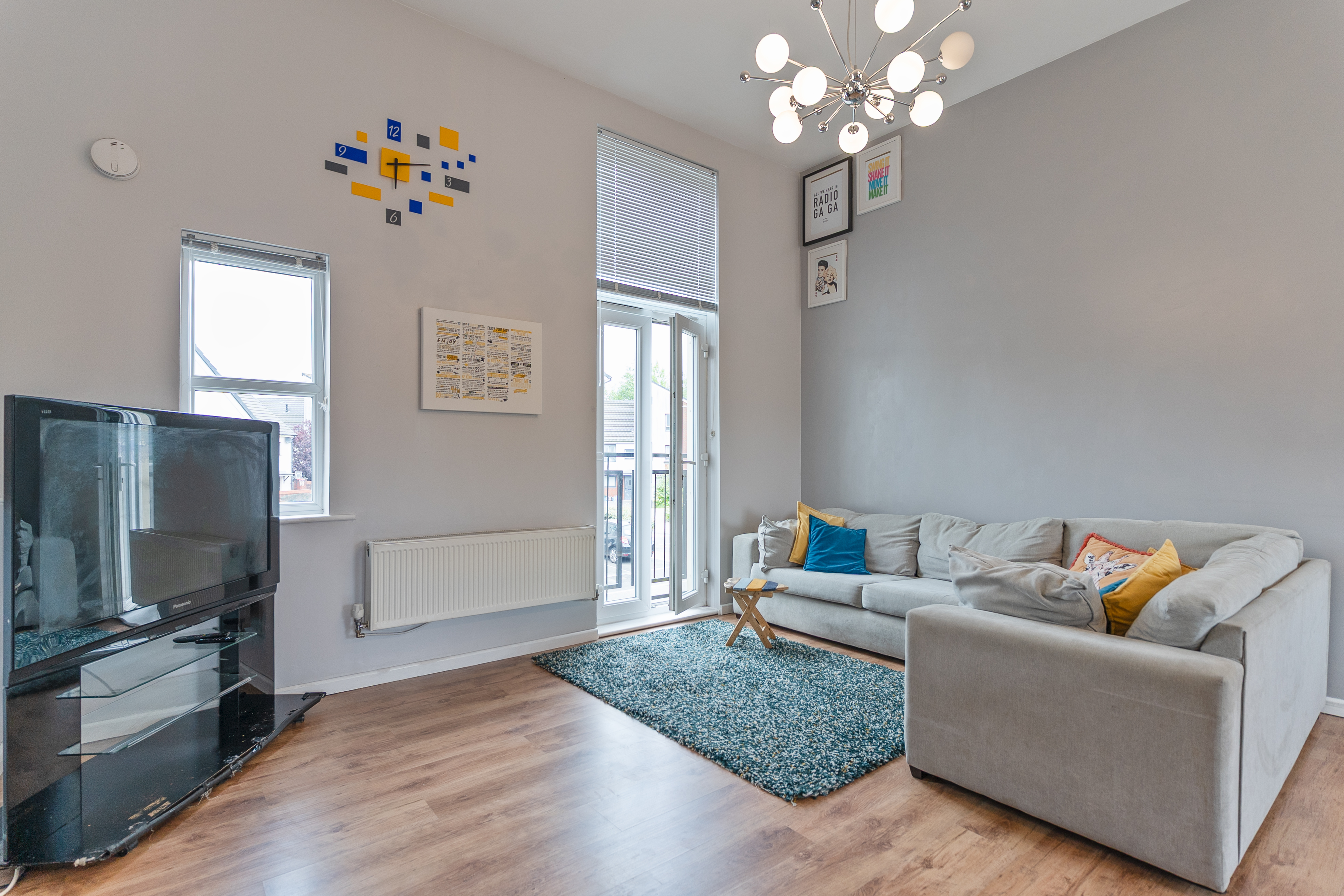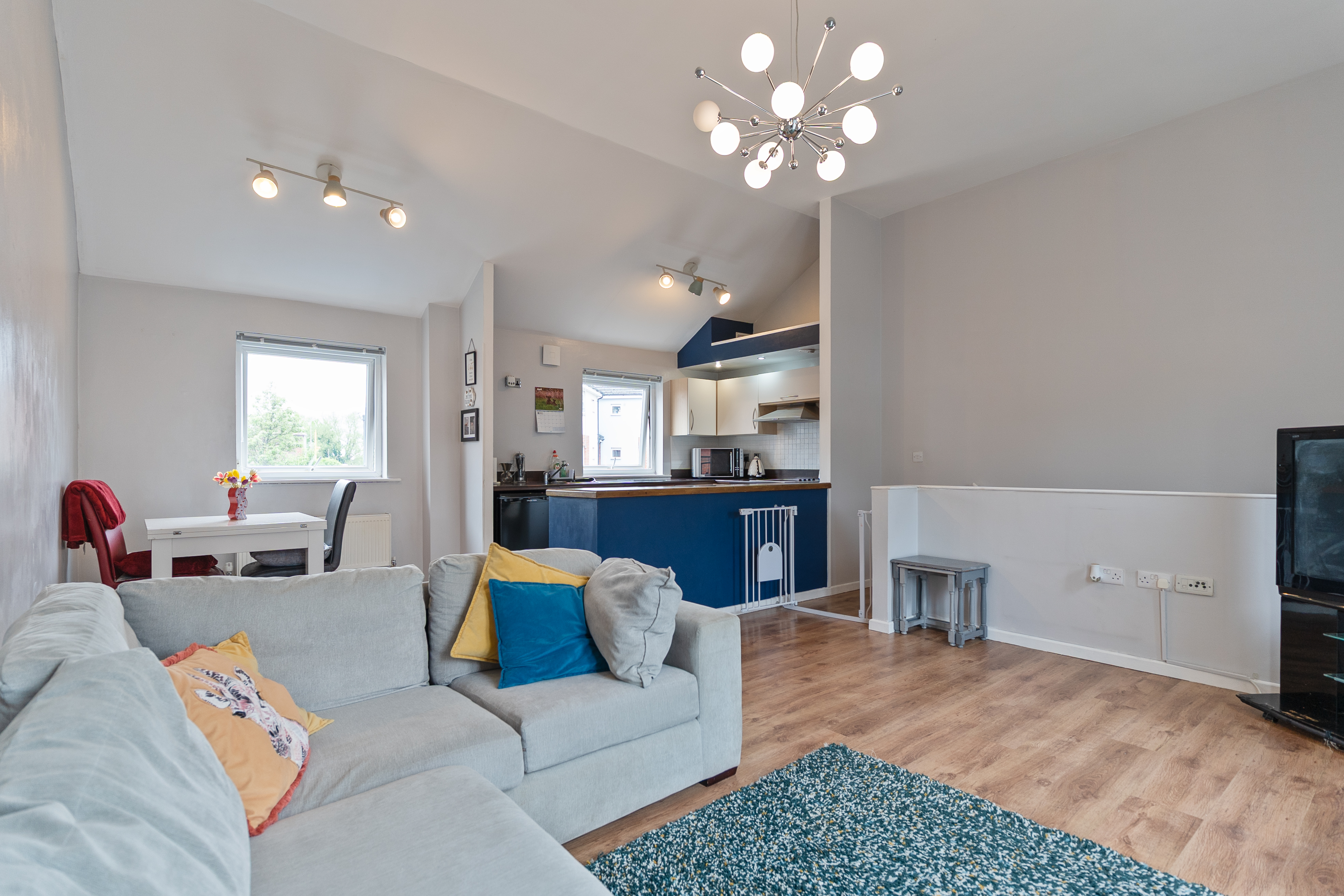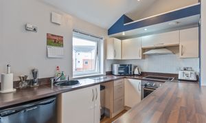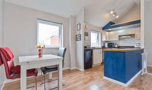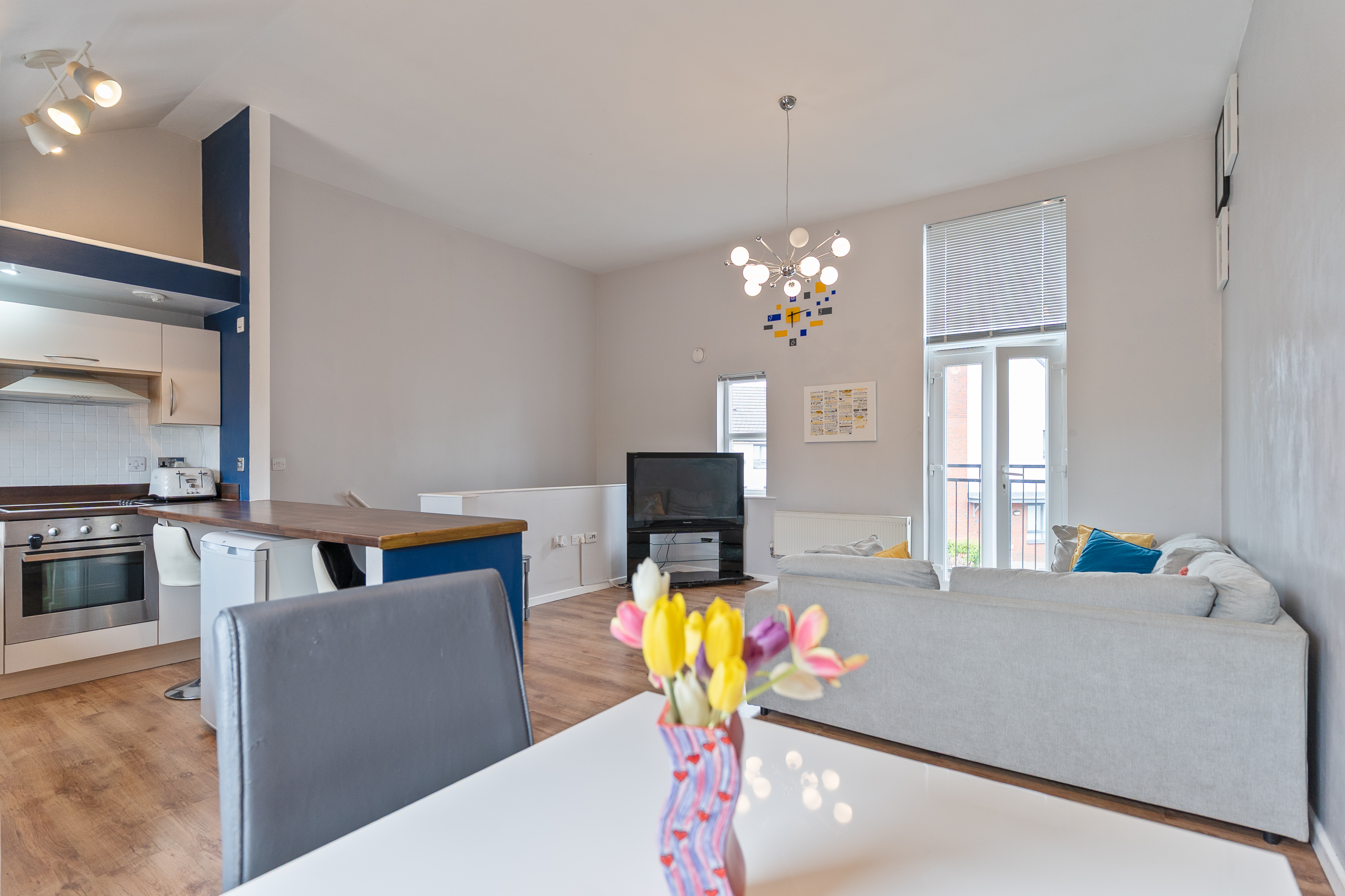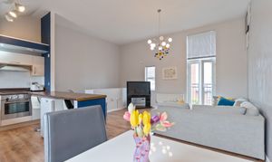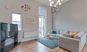 On the first floor is the impressive open plan living space, which benefits from tall ceilings and dual aspect windows, allowing an abundance of natural light to fill the room. The space also features a Juliet balcony, enhancing the bright and airy feel. There is ample room for both seating and dining, alongside a good-sized fitted kitchen, making it a perfect space for modern living and entertaining.