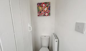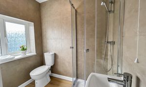 Shower, Low level cistern, hand basin, heated towel rail, wood effect floor.