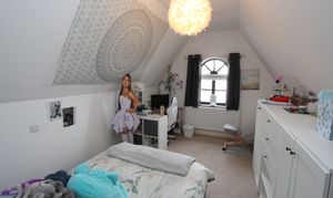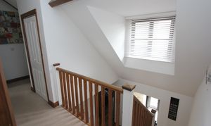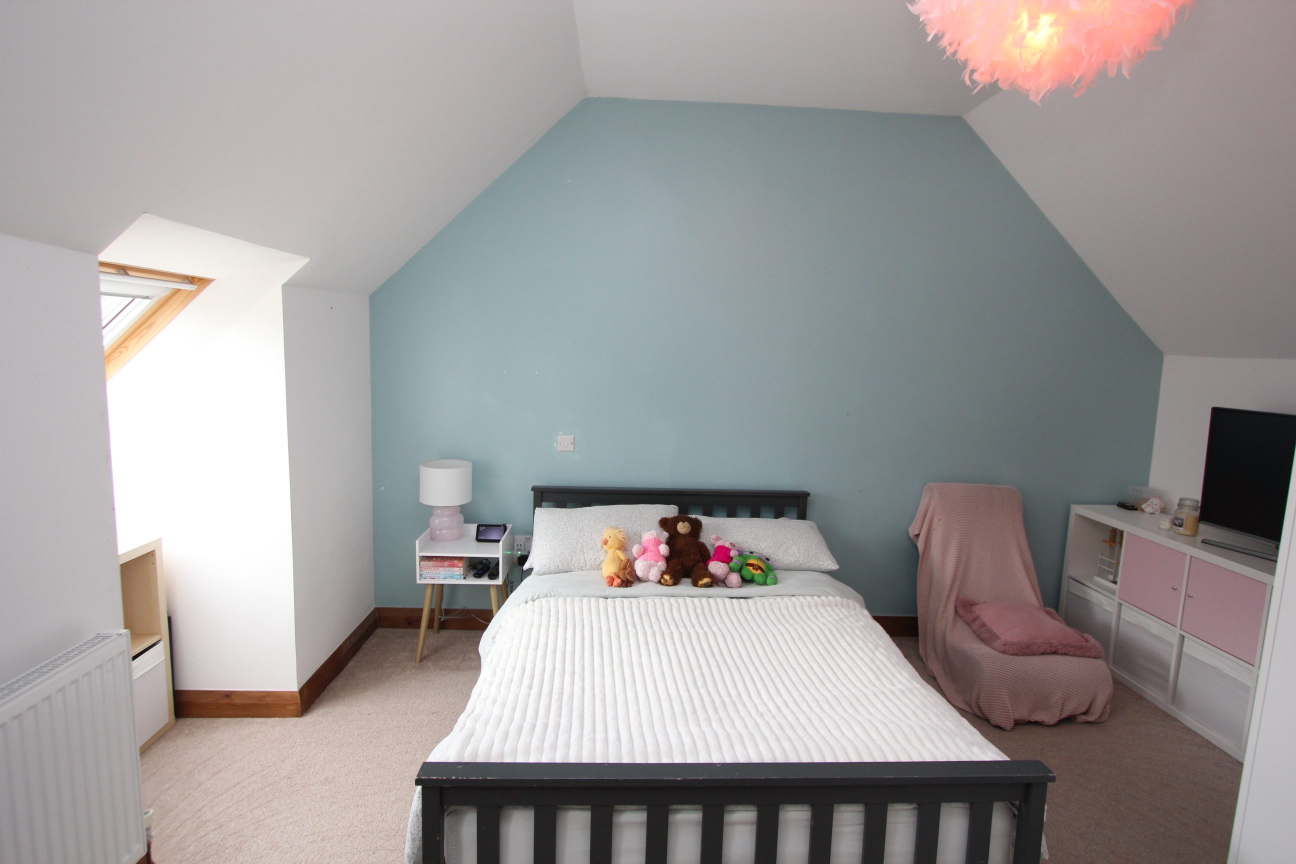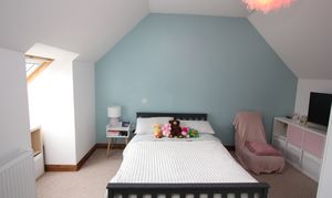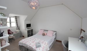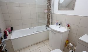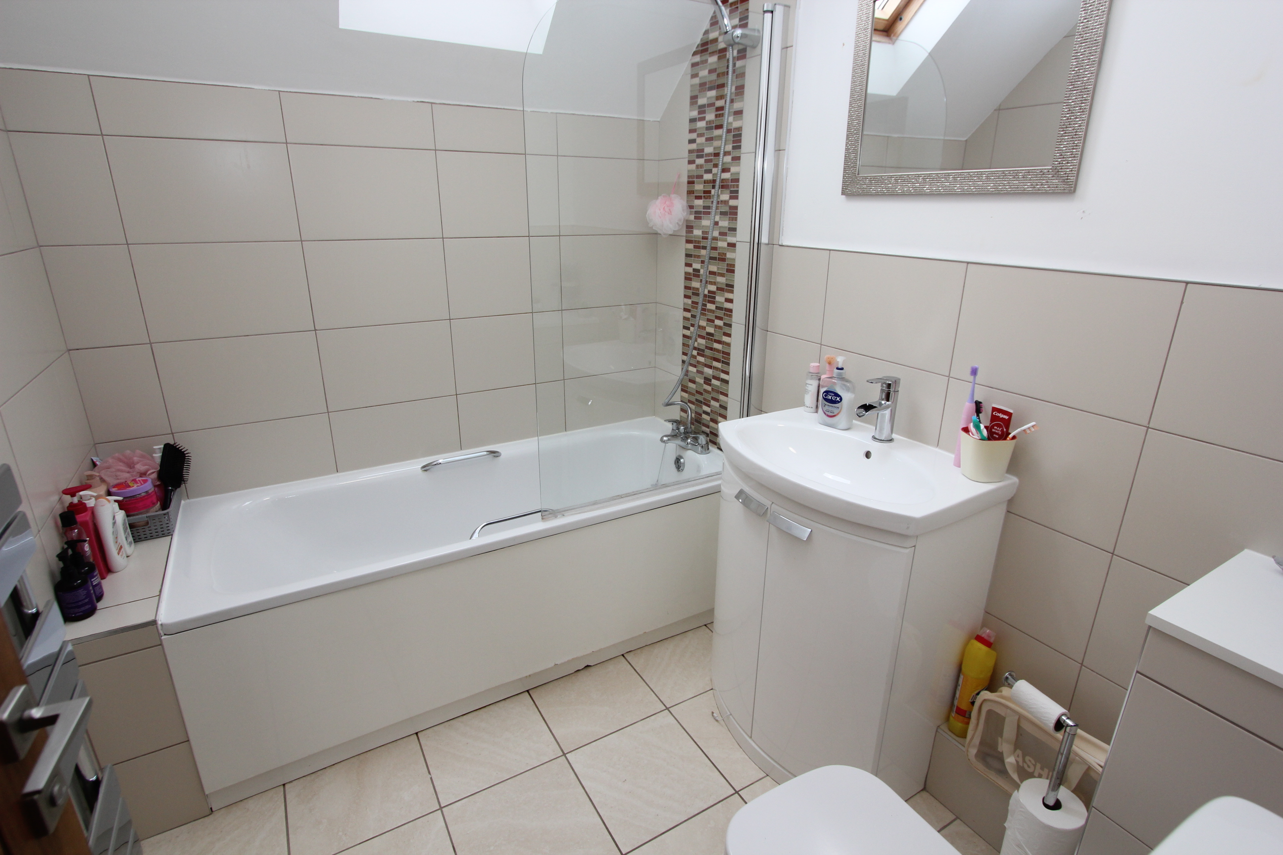 Panelled bath, Velux to rear. Wash hand basin with mixer tap. Low level WC. Ceramic floor tiles. Vertical radiator. Extractor fan.