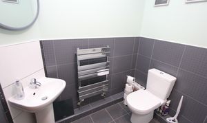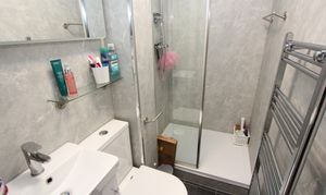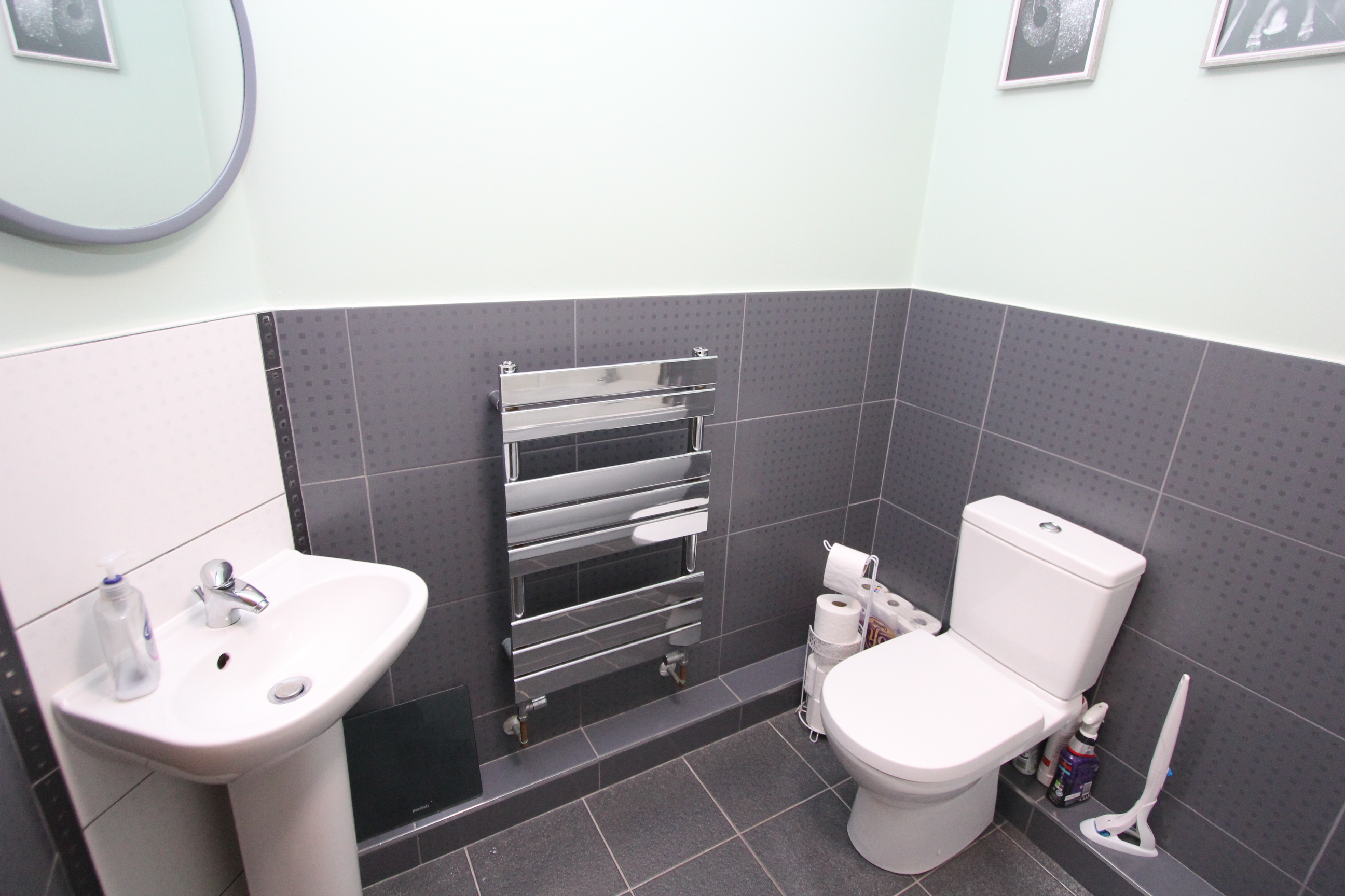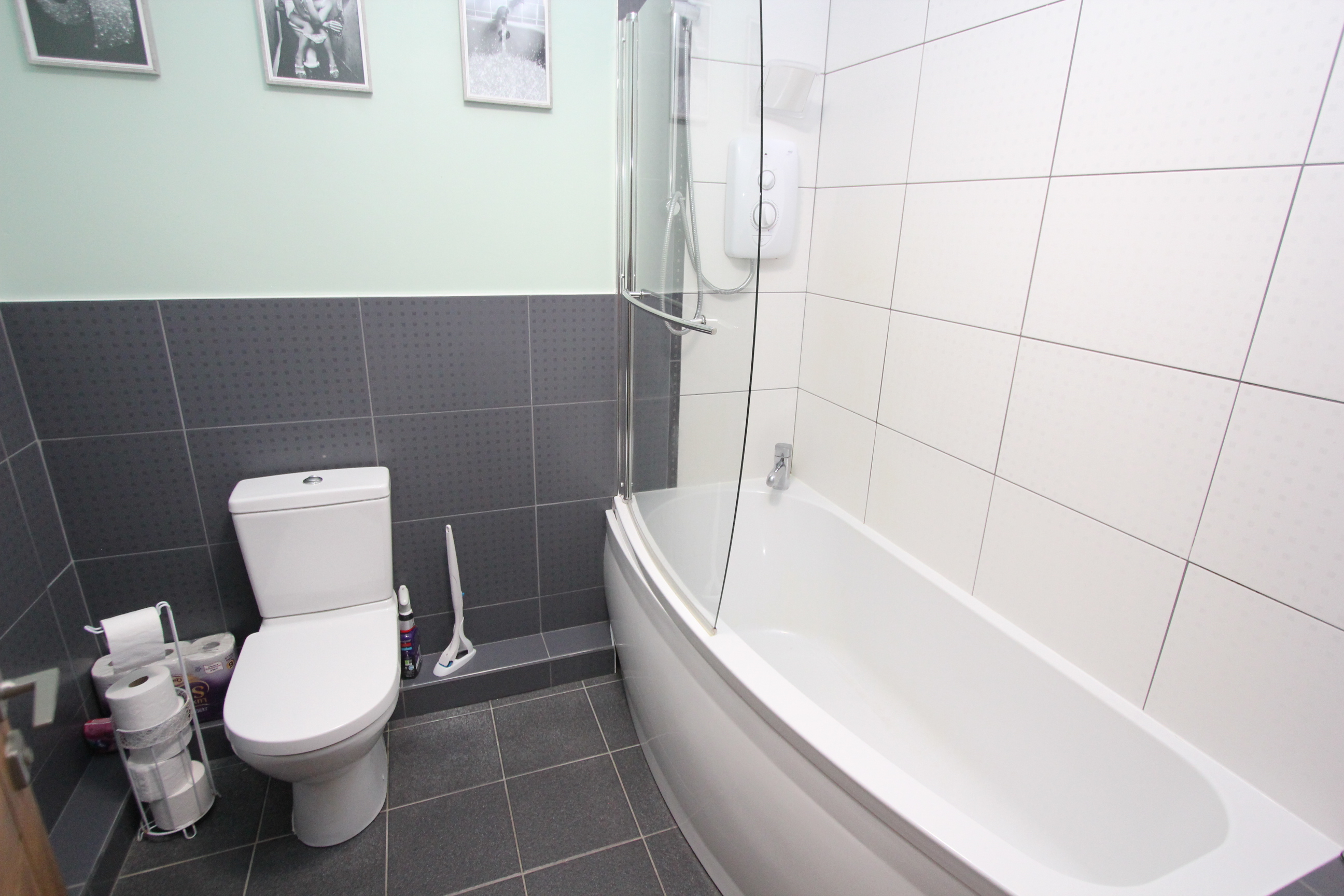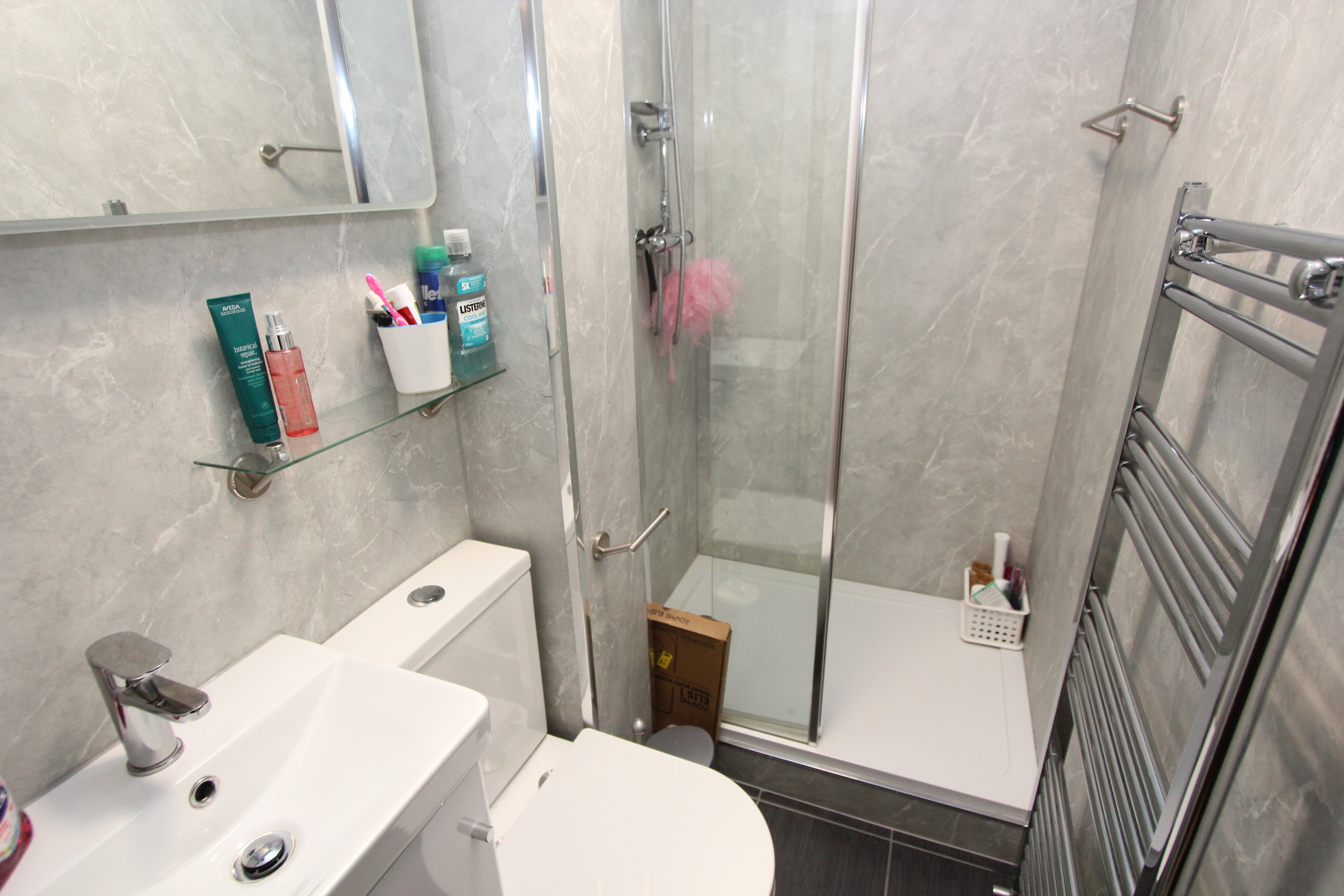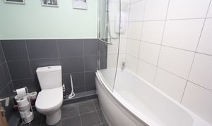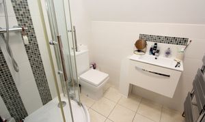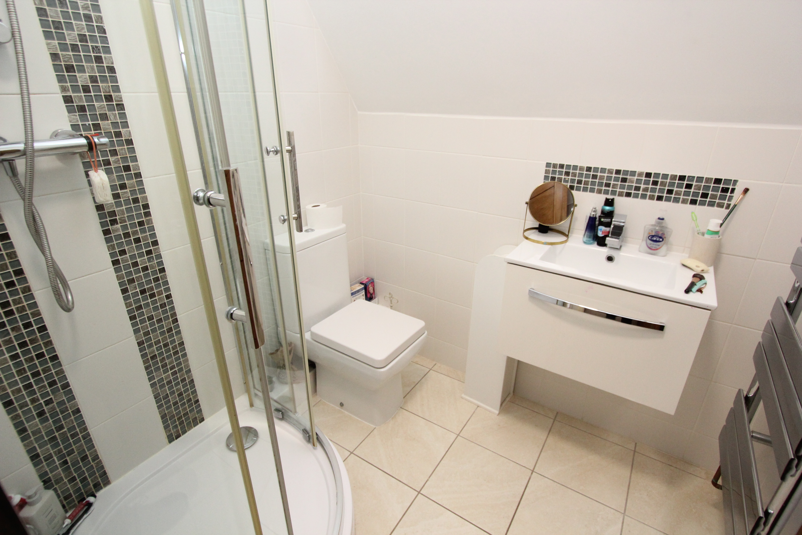 Low level WC. Wash hand basin with mixer tap. Vertical radiator. Shower enclosure with mixer shower. Ceramic floor tiles. Extractor fan.