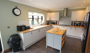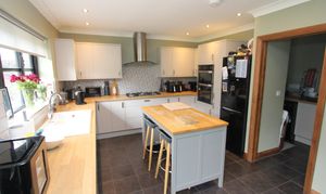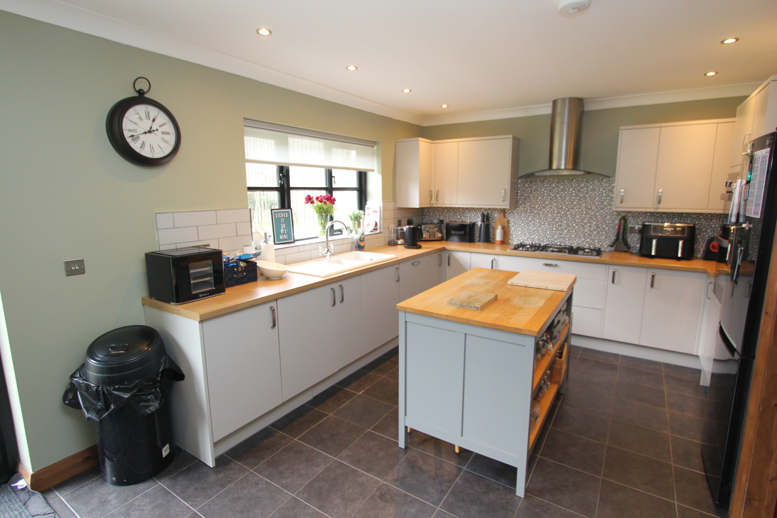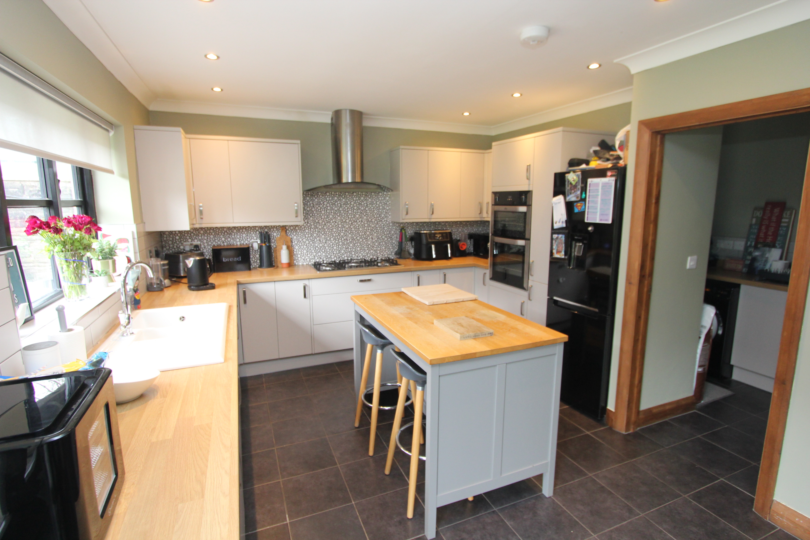 UPVC window to rear. UPVC French doors to rear. Ceramic floor tiles. Superb fully fitted kitchen comprising eye level units base units with work surfaces over. 5 burner gas hob with hood. Eye level oven and grill. Down lighting. Ceramic one and a half bowl sink with mixer tap. Kitchen island. Space for fridge/freezer. Integrated dish washer. Space for breakfast room table and chairs. Door to utility room.