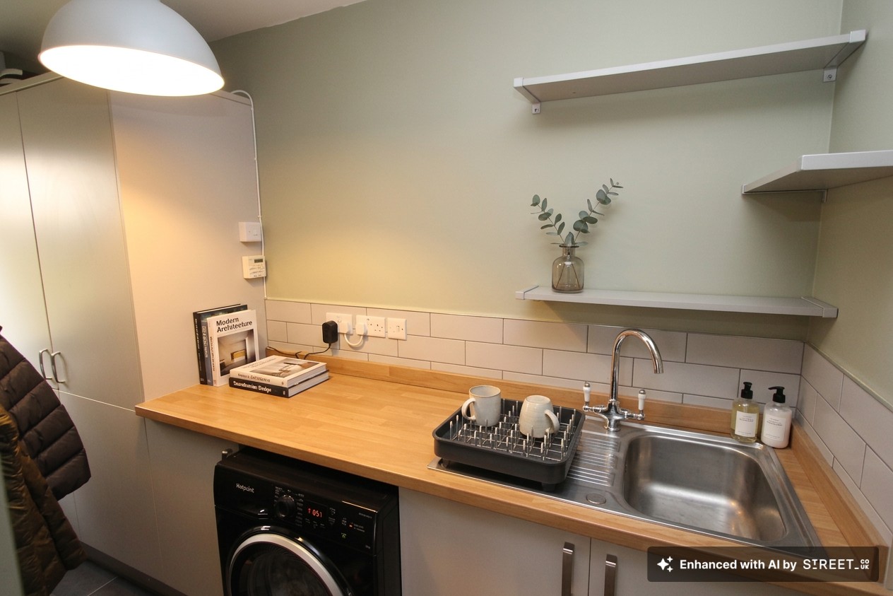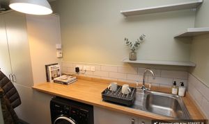 Opaque glazed door to side. Down lighting. Fitted units and base units with work surface over. Inset stainless steel sink with mixer tap. Space for washing machine. Wall mounted Vaillant combination boiler with cylinder providing a pressurised system. Ceramic floor tiles.