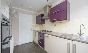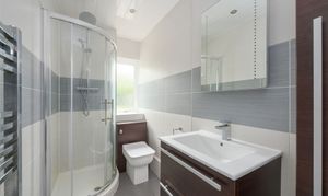 The ground floor features a bright lounge with dual aspect windows, allowing natural light to flow through and a feature fireplace creating a warm, inviting atmosphere. The modern kitchen is fitted with a gas hob, electric oven, integrated washing machine, fridge/freezer and dishwasher and a door provides direct access to the enclosed rear garden. Completing the lower level is a contemporary shower room with walk in shower, WC, and wash hand basin.