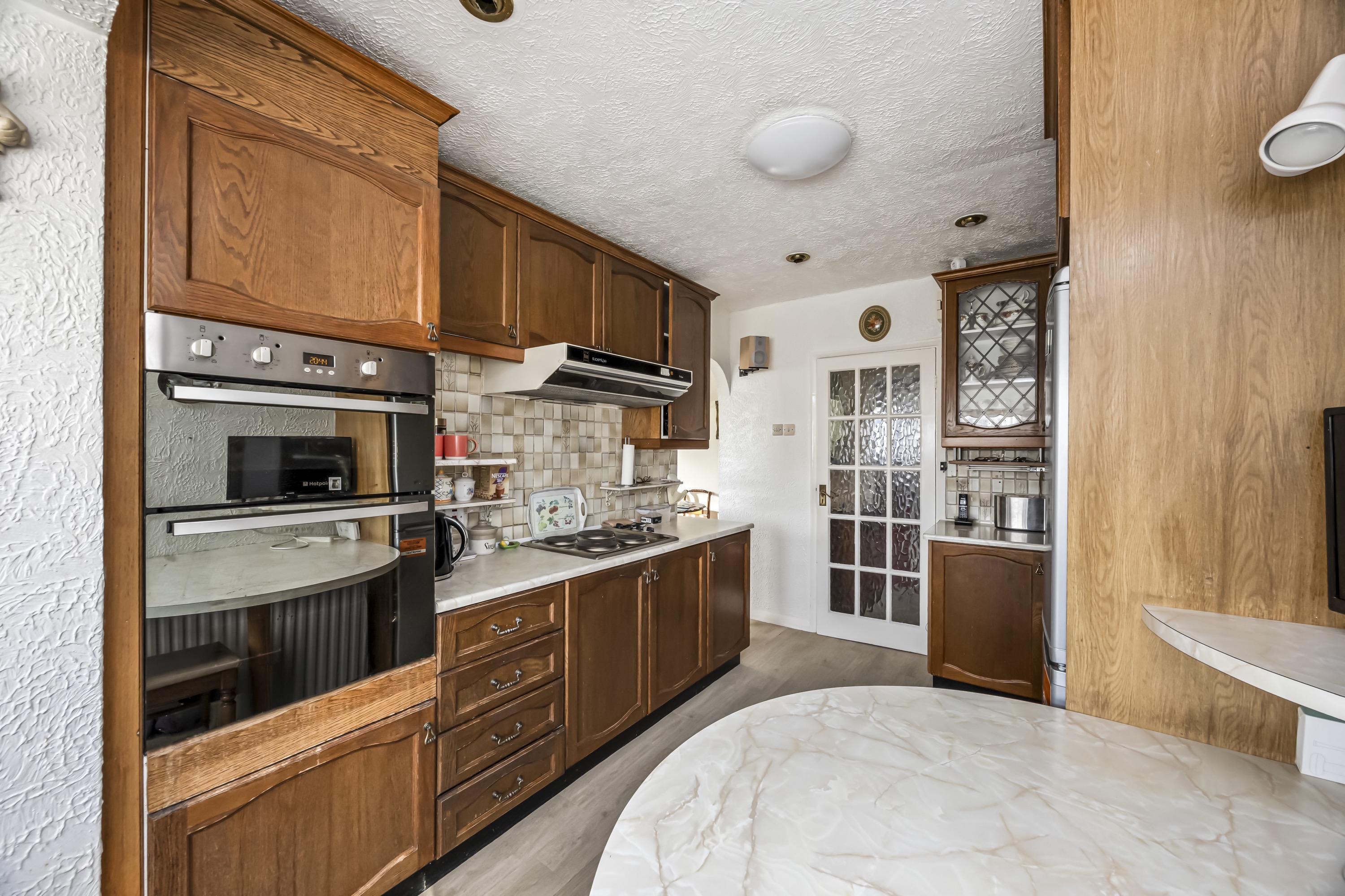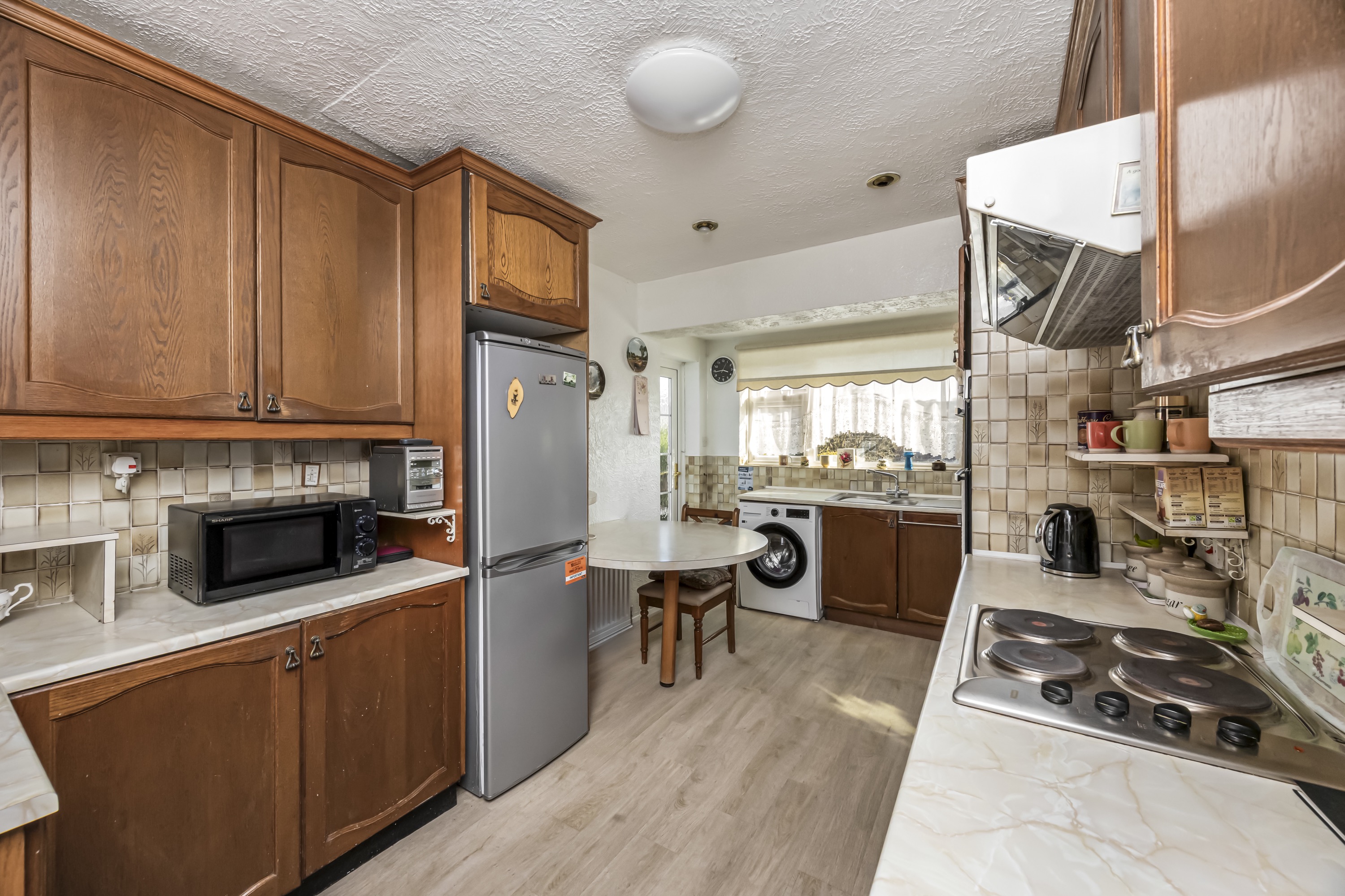 The kitchen is well-appointed and provides ample storage and workspace with space for a breakfast table and chairs whilst overlooking the manicured front garden.